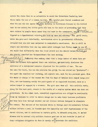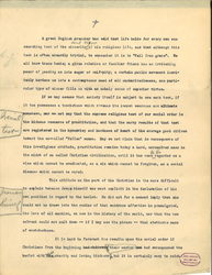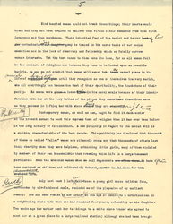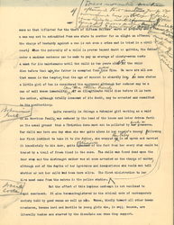 Publicity thus making clear that a large number of women have entered the hideous life against their own volition, it inevitably discloses the existence of a widespread commerce organized for the profits of men. The man who owns the house, the one who procures the girl, the one styled her "protector" -- the agent who supplies her clothing, all exploit her, each for his personal gain. Even the women in charge of the houses who from the days of Babylon have reaped large profits, are now becoming merely the paid agents of an organized business, much as a saloon keeper is engaged by a brewery. The girl upon whom all this activity rests, young for the most part, stands in the middle of a complex system which she does not understand. On the other hand, commercial organizations are obliged to continually trump up business in order to secure enough men to make their business profitable and they lure them through alcohol and all vicious devices designed to stimulate the senses. The success of the business which in Chicago pays its promoters fifteen million dollars a year, is founded upon the [hypocrisy] and self righteousness of the decent citizen, and it continues to capture girls, to debauch young men, to spread disease and to corrupt city politics because good men do not consider it part of their religious obligation to face it openly and <to> undertake its abolition. [written in left margin] men also [illegible] [page 7]