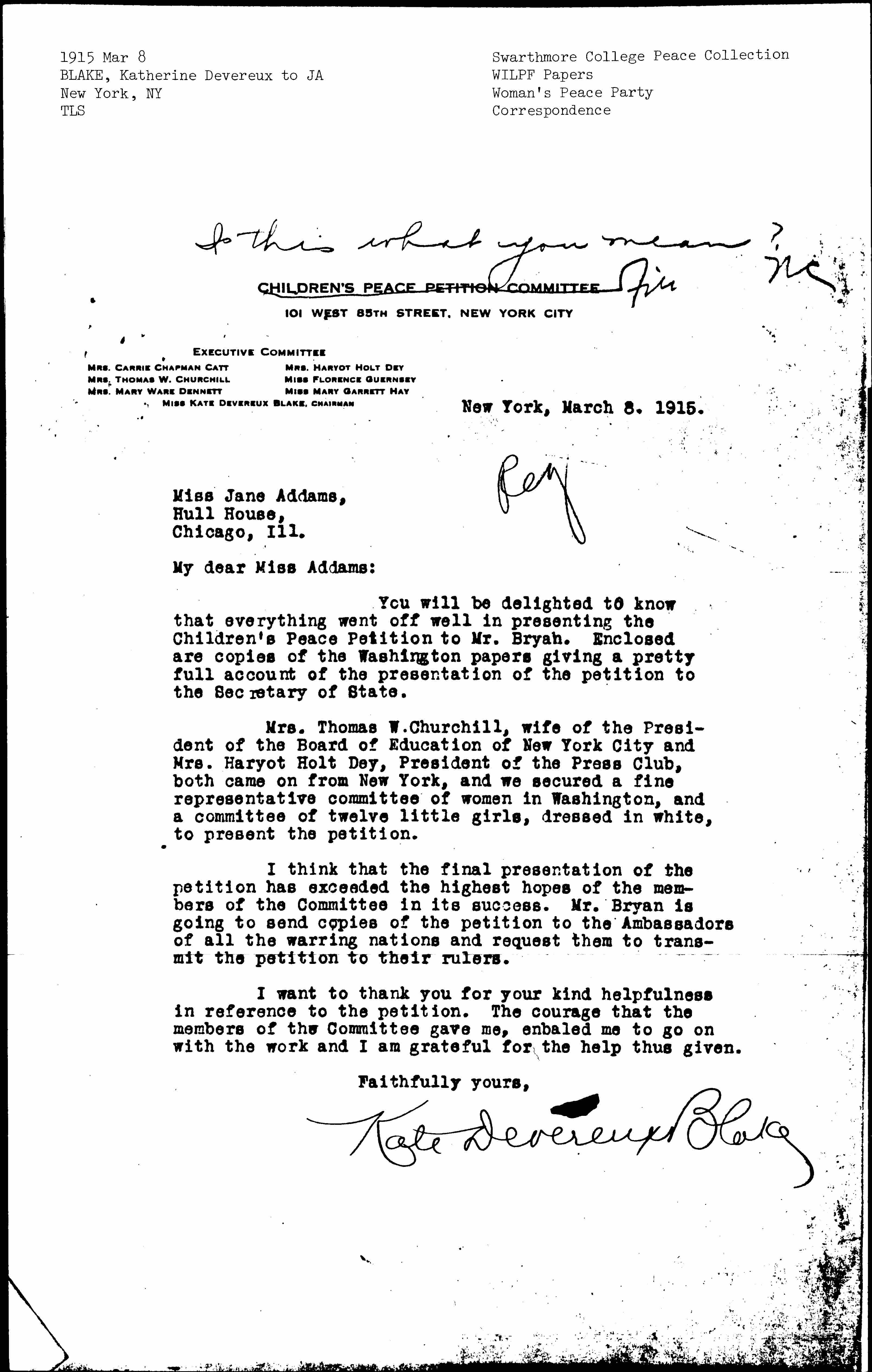 You will be delighted to know that everything went off well in presenting the Children's Peace Petition to Mr. Bryan. Enclosed are copies of the Washington papers giving a pretty full account of the presentation of the petition to the Secretary of State.