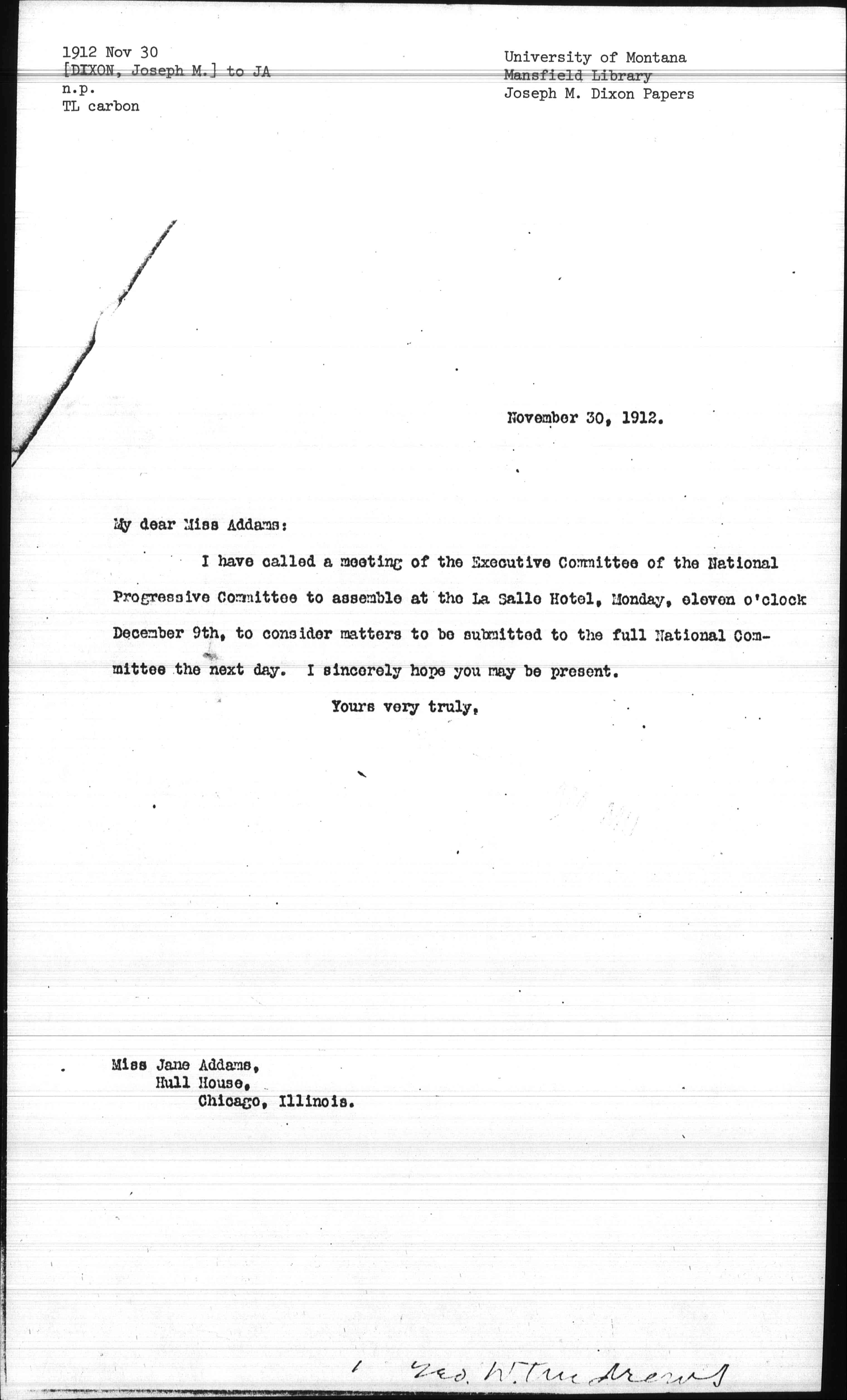 I have called a meeting of Executive Committee of the National Progressive Committee to assemble at the La Salle Hotel, Monday, eleven o'clock December 9th, to consider mattes to be submitted to the full National Committee the next day. I sincerely hope you may be present.