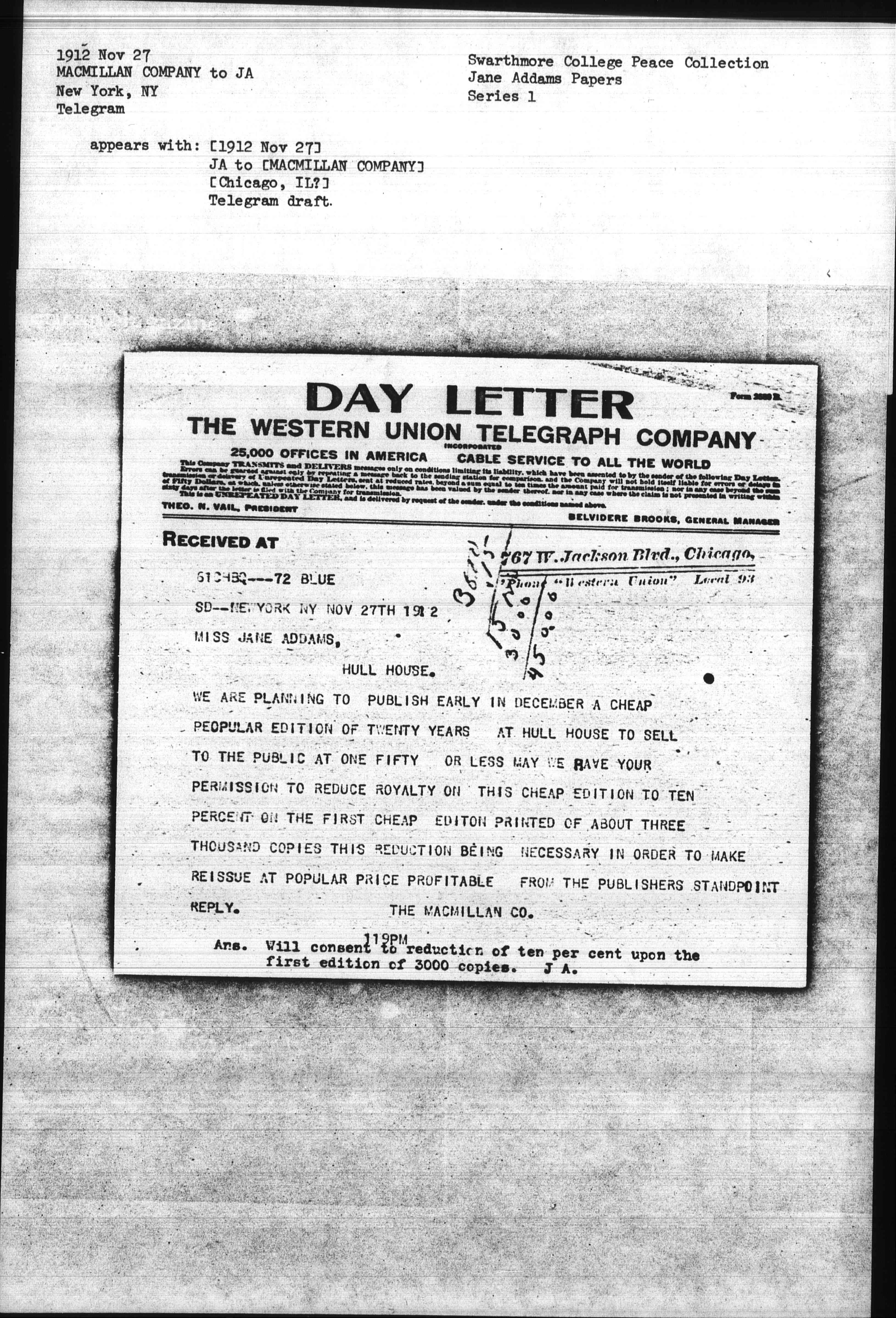WE ARE PLANNING TO PUBLISH EARLY IN DECEMBER A CHEAP POPULAR EDITION OF TWENTY YEARS AT HULL HOUSE TO SELL TO THE PUBLIC AT ONE FIFTY OR LESS MAY WE HAVE YOUR PERMISSION TO REDUCE ROYALTY ON THIS CHEAP EDITION TO TEN PERCENT ON THE FIRST CHEAP EDITION PRINTED OF ABOUT THREE THOUSAND COPIES THIS REDUCTION BEING NECESSARY IN ORDER TO MAKE REISSUE AT POPULAR PRICE PROFITABLE FROM THE PUBLISHER'S STANDPOINT REPLY.