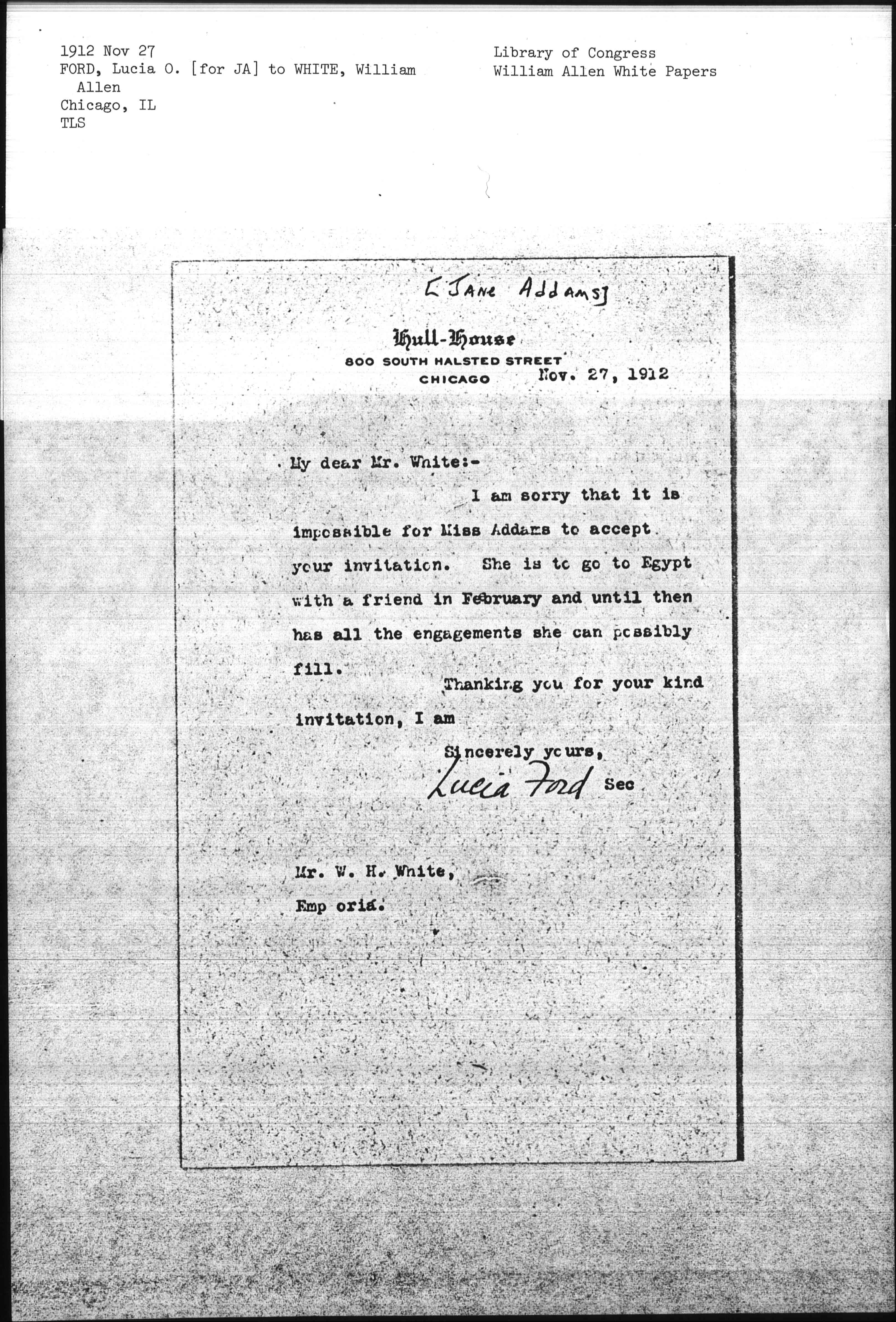 I am sorry that it is impossible for Miss Addams to accept your invitation. She is to go to Egypt with a friend in February and until then has all the engagements she can possibly fill.