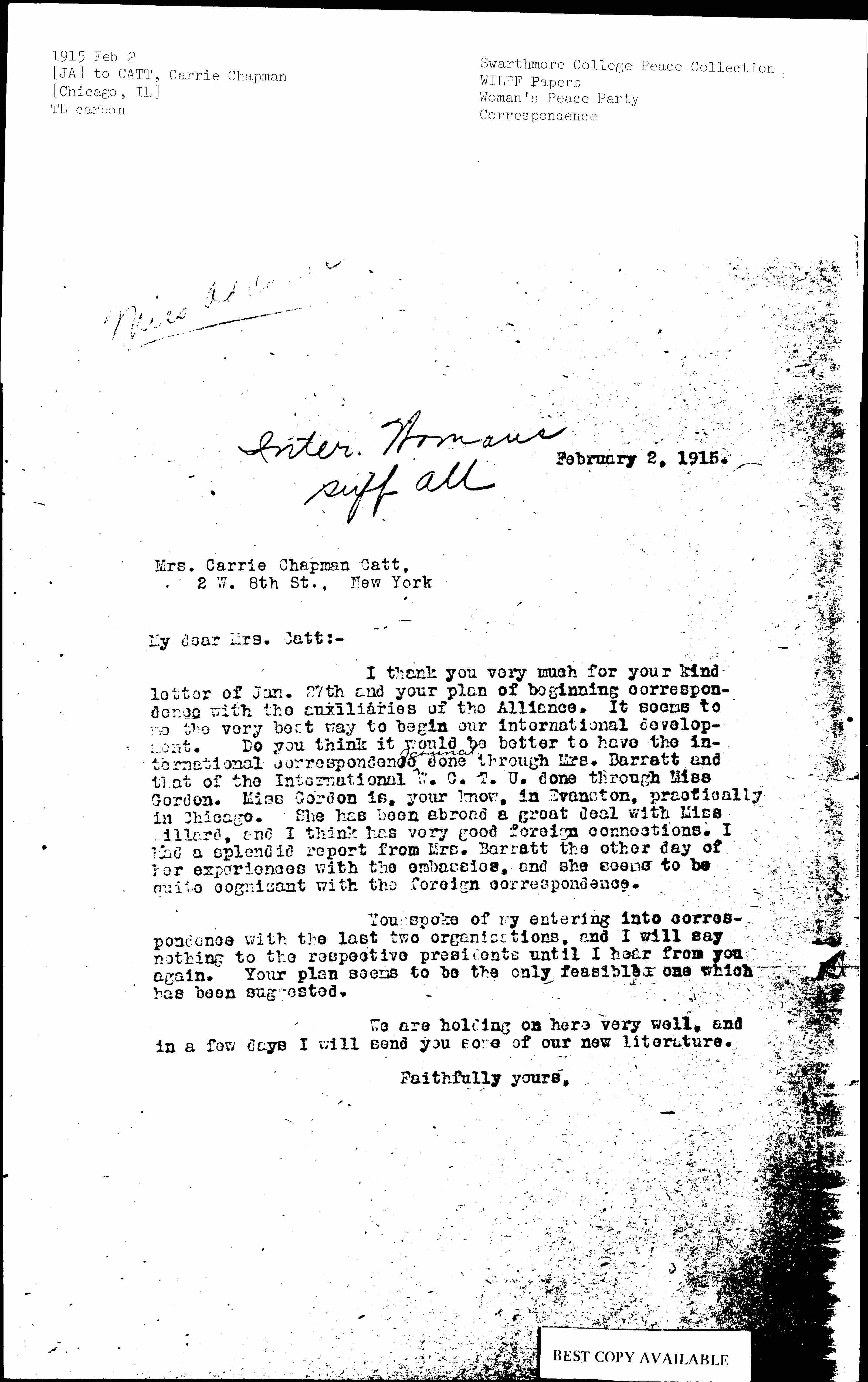 I thank you very much for your kind letter of Jan. 27th and your plan of beginning correspondence with the auxiliaries of the Alliance. It seems to me the very best way to begin our international development. Do you think it would be better to have the international correspondence ↑council↓ done through Mrs. Barrett and that of the International W. C. T. U. done through Miss Gordon. Miss Gordon is, [you] know, in Evanston, practically in Chicago. She has been abroad a great deal with Miss Willard, and I think has very good foreign connections. I had a splendid report from Mrs. Barrett the other day of her experiences with the embassies, and she seems to be quite cognizant with the foreign correspondence.