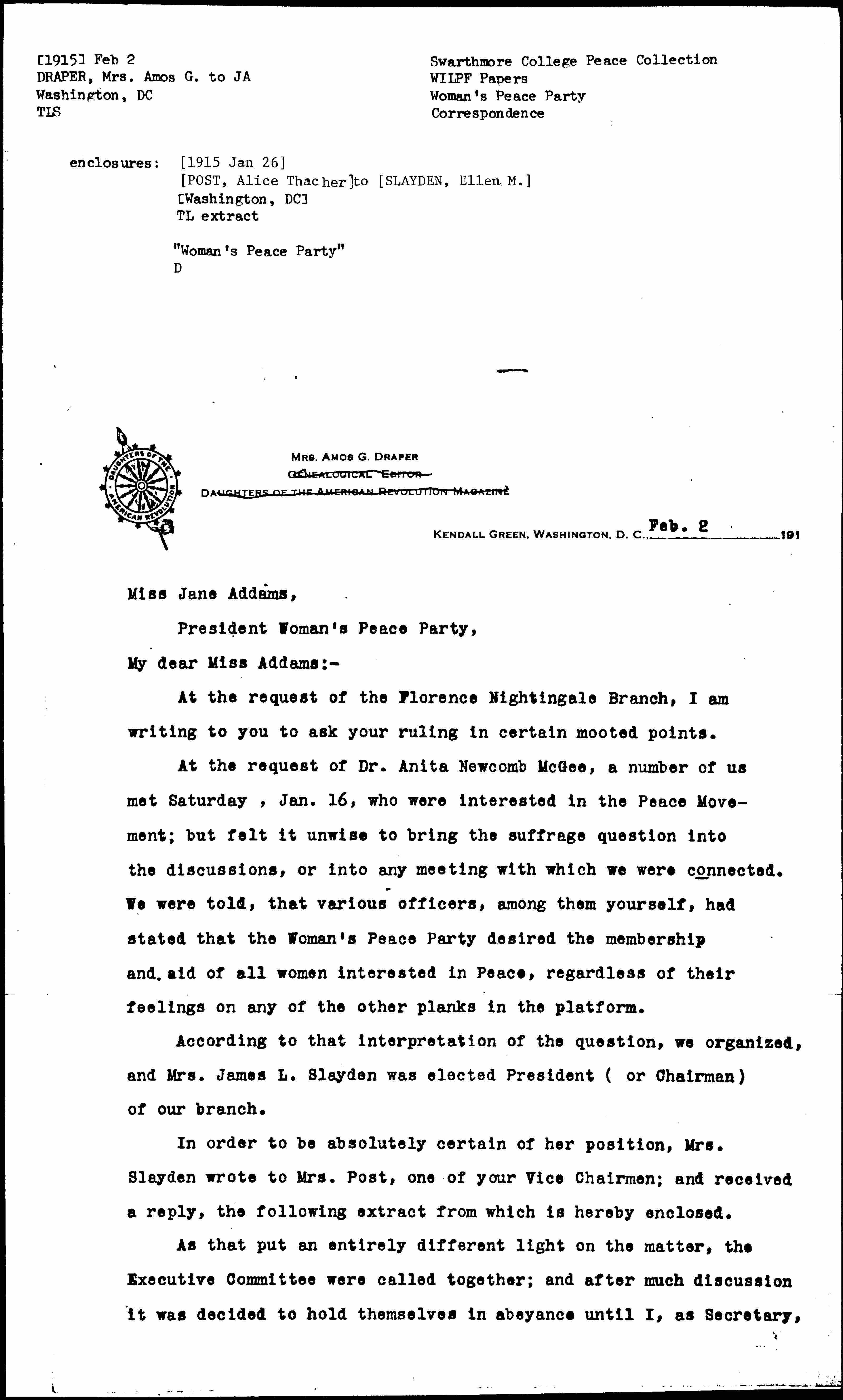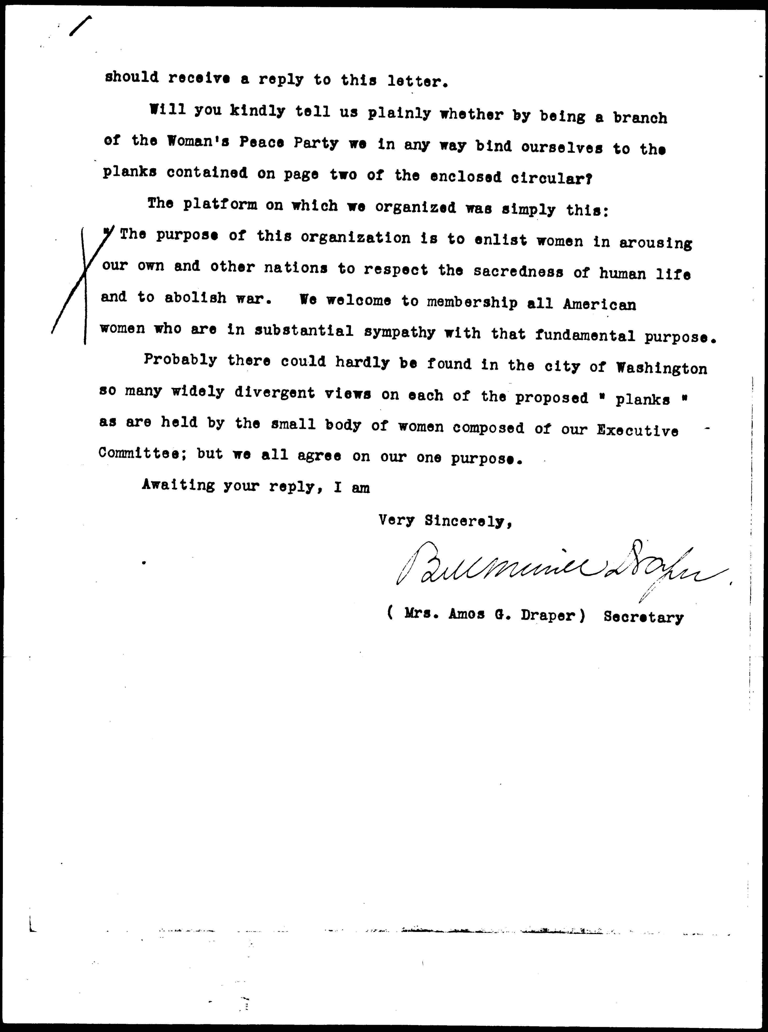 At the request of Dr. Anita Newcomb McGee, a number of us met Saturday, Jan. 16, who were interested in the Peace Movement; but felt it unwise to bring the suffrage question into the discussions, or into any meeting with which we were connected. We were told, that various officers, among them yourself, had stated that the Woman's Peace Party desired the membership and, aid of all women interested in Peace, regardless of their feelings on any of the other planks in the platform.