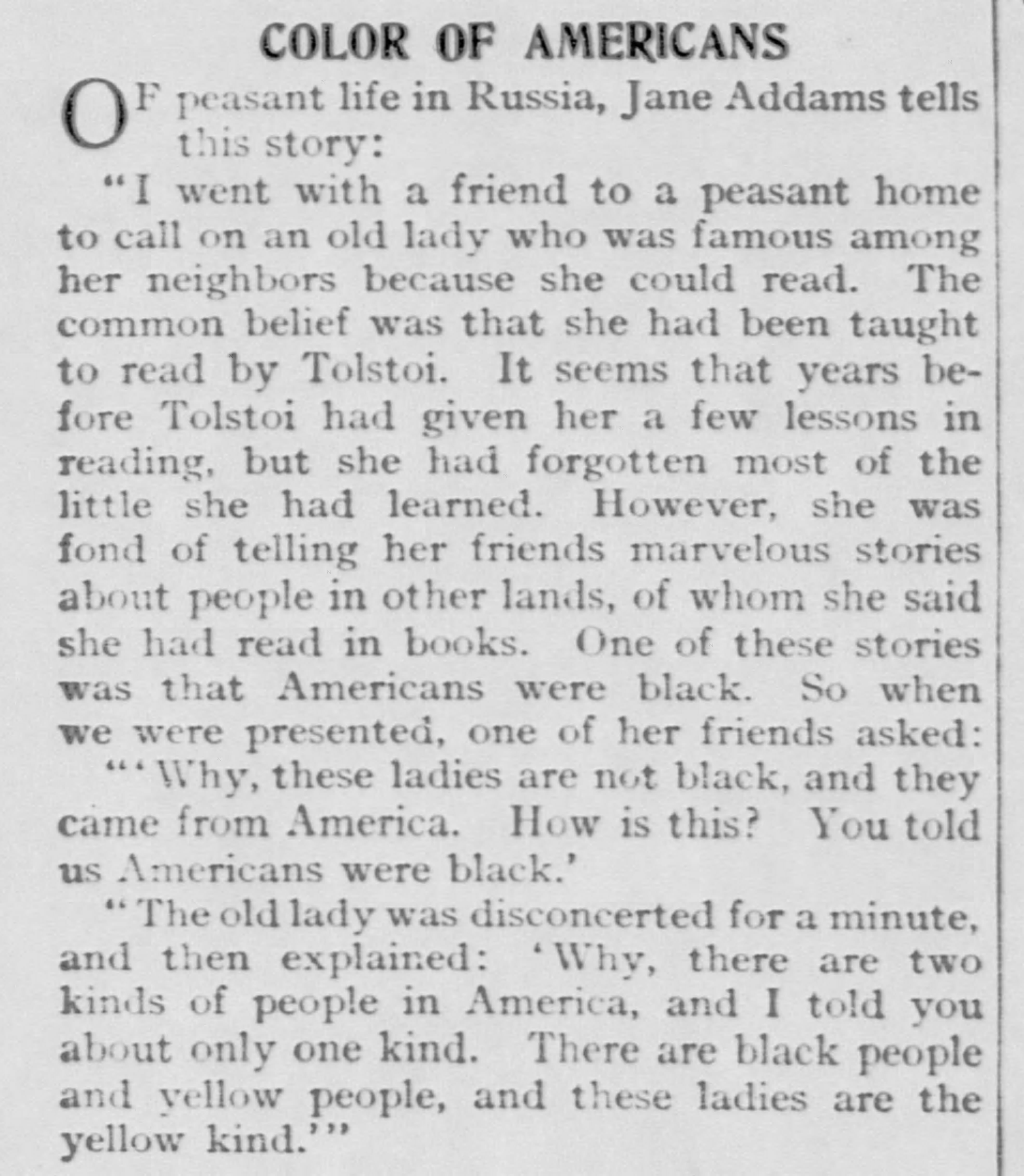 "I went with a friend to a peasant home to call on an old lady who was famous among her neighbors because she could read. The common belief was that she had been taught to read by [Tolstoy]. It seems that years before [Tolstoy] had given her a few lessons in reading, but she had forgotton most of the little she had learned. However, she was fond of telling her friends marvelous stories about people in other lands, of whom she said she had read in books. One of these stories was that Americans were black. So when we were presented, one of her friends asked: