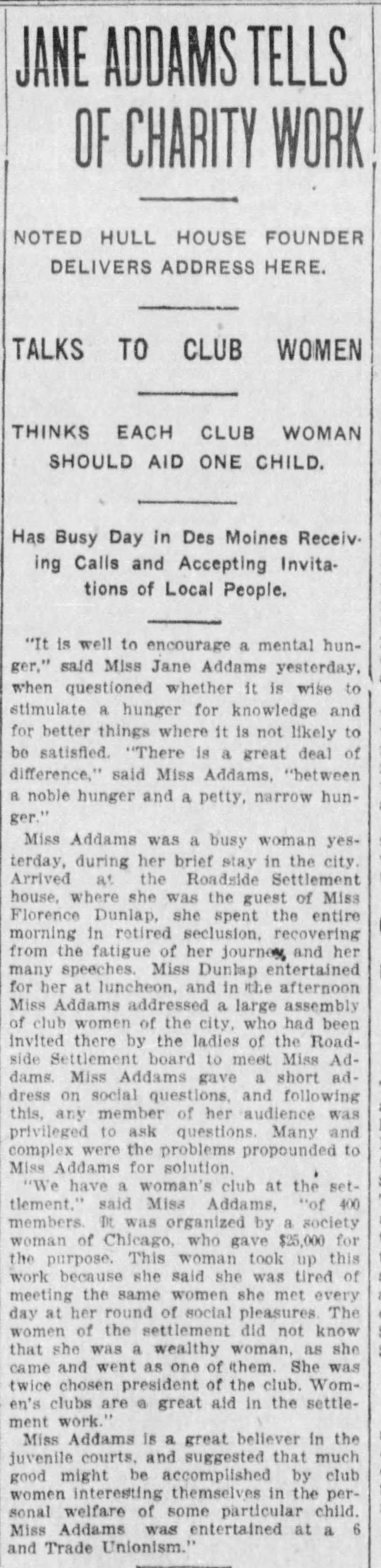 Miss Addams was a busy woman yesterday, during her brief stay in the city. Arrived at the Roadside Settlement house, where she was the guest of Miss Florence Dunlap, she spent the entire morning in retired seclusion, recovering from the fatigue of her journey and her many speeches. Miss Dunlap entertained for her at luncheon, and in the afternoon Miss Addams addressed a large assembly of club women of the city, who had been invited there by the ladies of the Roadside Settlement board to meet Miss Addams. Miss Addams gave a short address on social questions, and following this, any member of her audience was privileged to ask questions. Many and complex were the problems propounded to Miss Addams for solution.