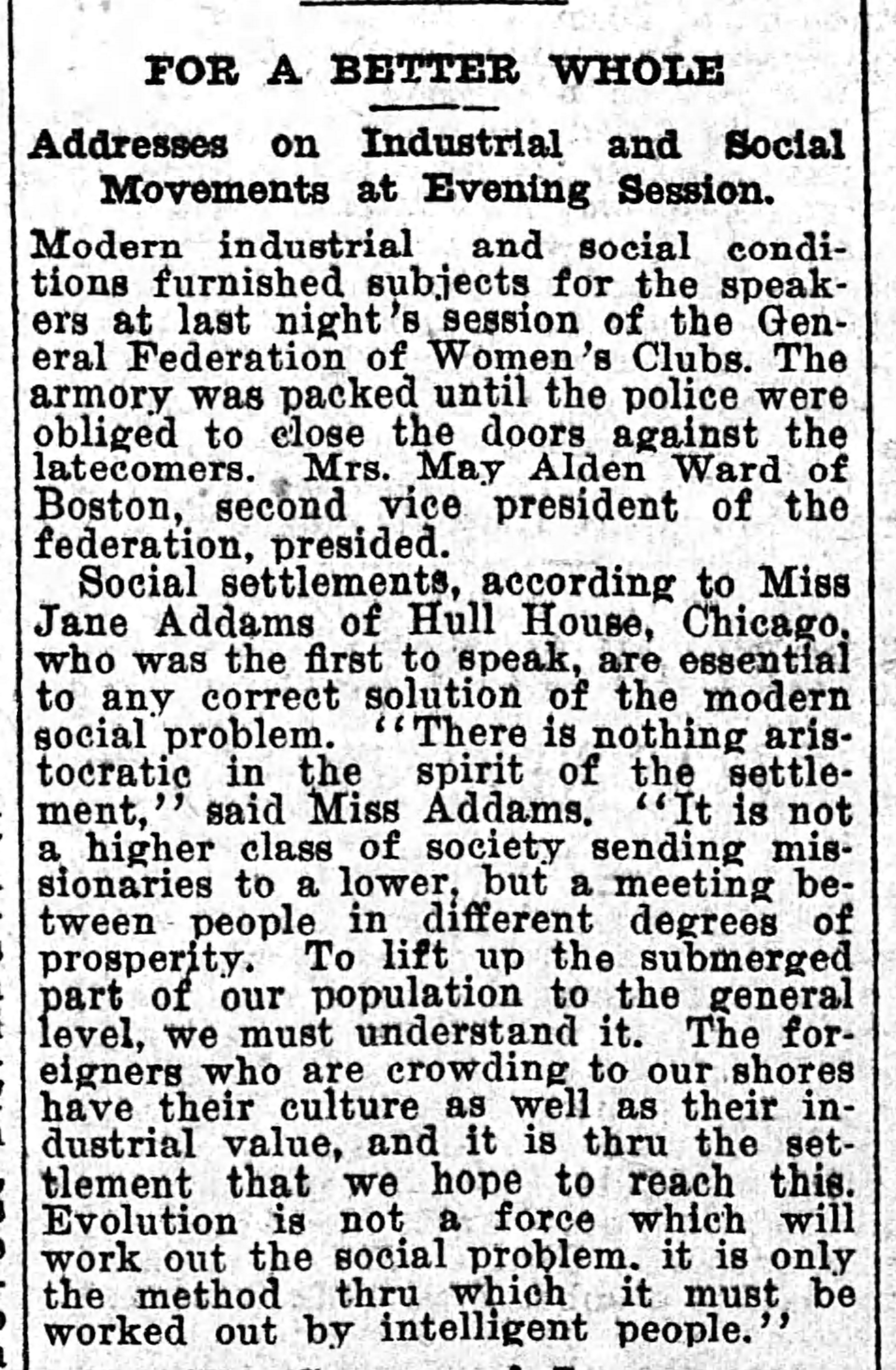 Social settlements, according to Miss Jane Addams of Hull House, Chicago, who was the first to speak, are essential to any correct solution to the modern social problem, "There is nothing aristocratic in the spirit of the settlement," said Miss Addams. "It is not a higher class of society sending missionaries to a lower, but a meeting between people in different degrees of prosperity. To lift up the submerged part of our population to the general level, we must understand it. The foreigners who are crowding to our shores have their culture as well as their industrial value, and it is [through] the settlement that we hope to reach this. Evolution is not a force which will work out the social problem, it is only the method [through] which it must be worked out by intelligent people."