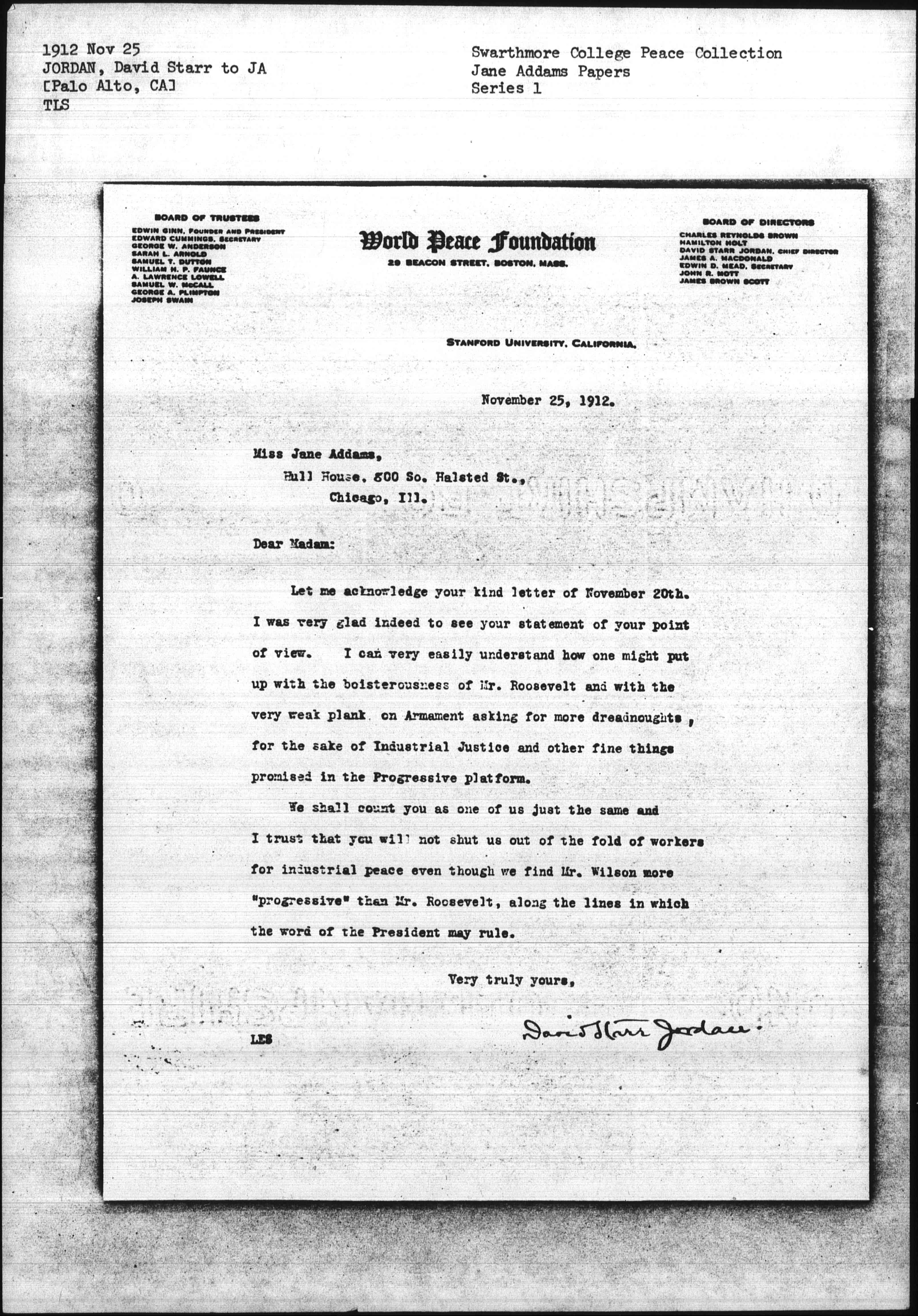 We shall count you as one of us just the same and I trust that you will not shut us out of the fold of workers for industrial peace even though we find Mr. Wilson more "progressive" than Mr. Roosevelt, along the lines in which the word of the President may rule.