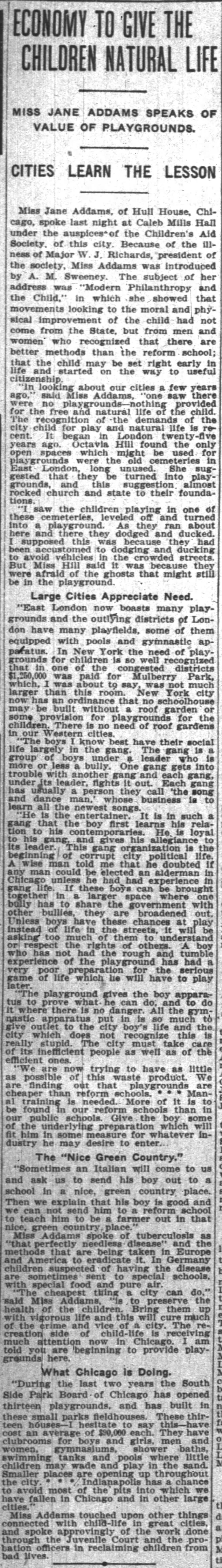 "The cheapest thing a city can do," said Miss Addams, "is to preserve the health of the children. Bring them up with vigorous life and this will cure much of the crime and vice of a city. The recreation side of child-life is receiving much attention now in Chicago. I am told you are beginning to provide playgrounds here.