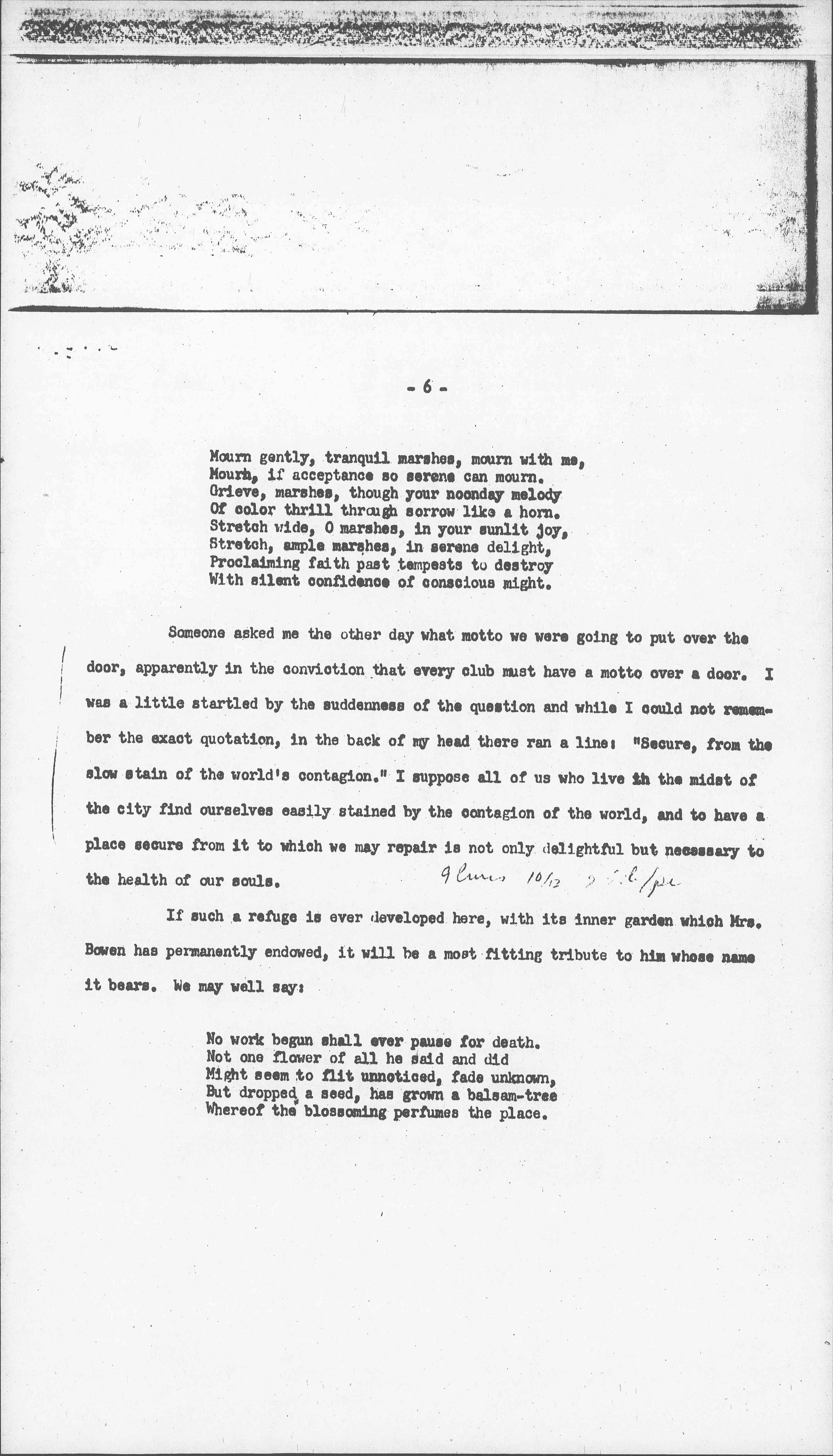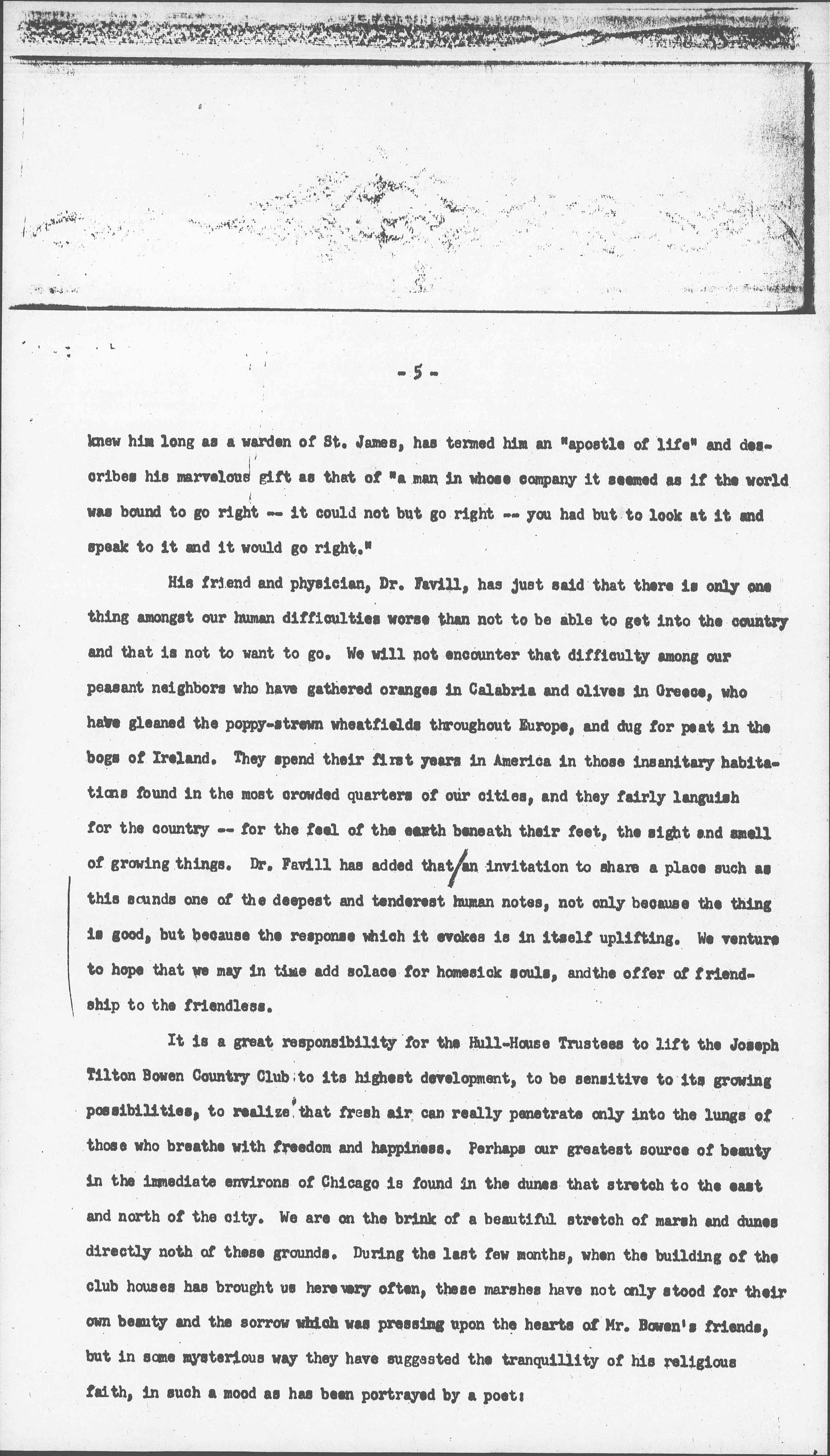 It is a great responsibility for the Hull-House Trustees to lift the Joseph Tilton Bowen Country Club to its highest development, to be sensitive to its growing possibilities, to realize that fresh air can really penetrate only into the lungs of those who breathe with freedom and happiness. Perhaps our greatest source of beauty in the immediate environs of Chicago is found in the dunes that stretch to the east and north of the city. We are on the brink of a beautiful stretch of marsh and dunes directly [north] of these grounds. During the last few months, when the building of the club houses has brought us here very often, these marshes have not only stood for their own beauty and the sorrow which was pressing upon the hearts of Mr. Bowen's friends, but in some mysterious way they have suggested the tranquility of his religious faith, in such a mood as has been portrayed by a poet: