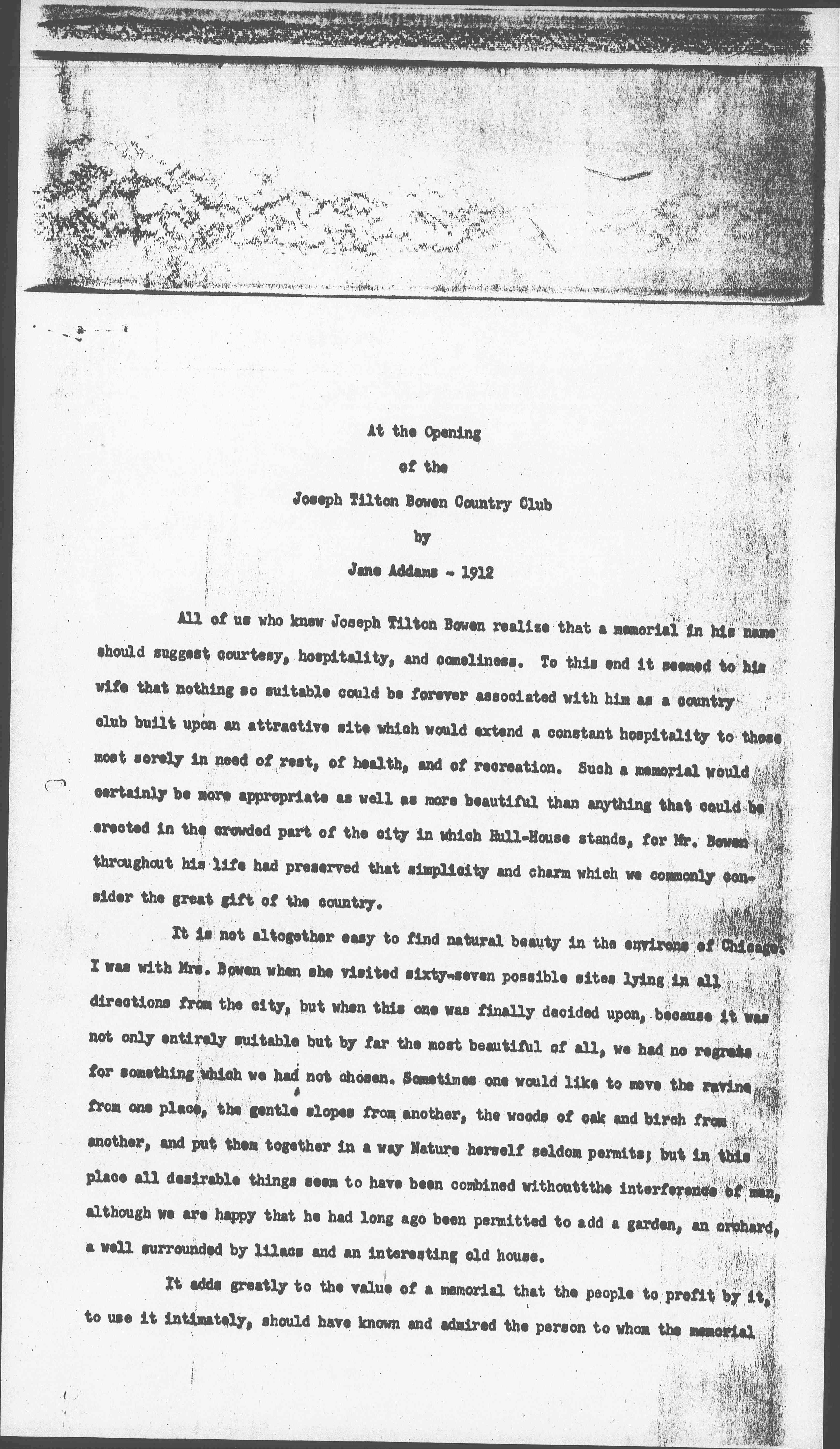 All of us who know Joseph Tilton Bowen realize that a memorial in his name should suggest courtesy, hospitality, and comeliness. To this end it seemed to his wife that nothing so suitable could be forever associated with him as a country club built upon an attractive site which would extend a constant hospitality to these most sorely in need of rest, of health, and of recreation. Such a memorial would certainly be more appropriate as well as more beautiful than anything that could be erected in the crowded part of the city in which Hull-House stands, for Mr. Bowen throughout his life had preserved that simplicity and charm which we commonly consider the great gift of the country.