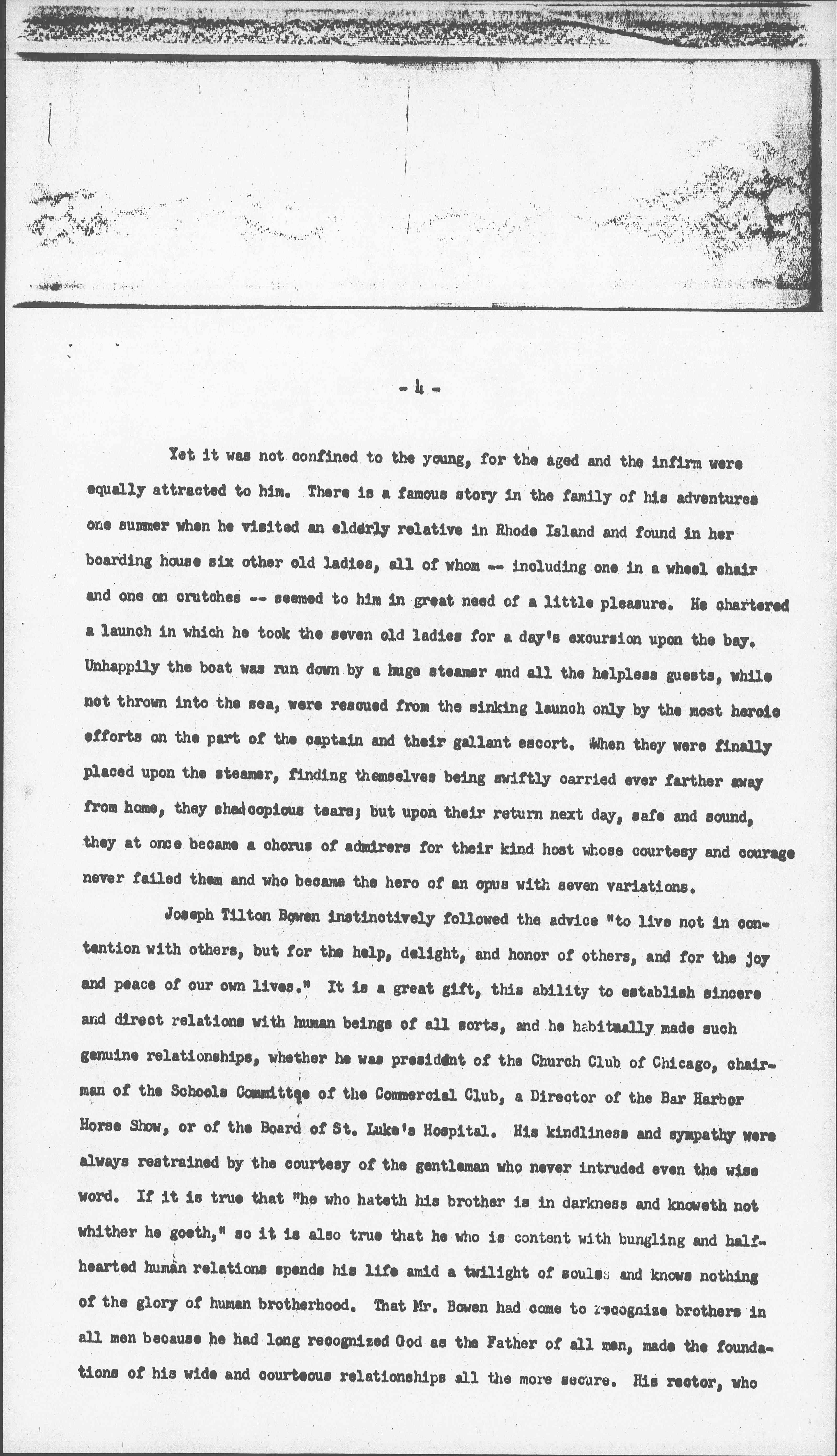 Joseph Tilton Bowen instinctively followed the advice "to live not in contention with others, but for the help, delight, and honor of others, and for the joy and peace of our own lives." It is a great gift, this ability to establish sincere and direct relations with human beings of all sorts, and he habitually made such genuine relationships, whether he was president of the Church Club of Chicago, chairman of the Schools Committee of the Commercial Club, a Director of the Bar Harbor Horse Show, or of the Board of St. Luke's Hospital. His kindliness and sympathy were always restrained by the courtesy of the gentleman who never intruded even the wise word. If it is true that "he who hateth his brother is in darkness and knoweth not whither he goeth," so it is also true that he who is content with bungling and half-hearted human relations spends his life and a twilight of souls and knows nothing of the glory of human brotherhood. That Mr. Bowen had come to recognize brothers in all men because he had long recognized God as the Father of all men, made the foundations of his wide and courteous relationships all the more secure. His rector, who [Page 5] knew him long as a warden of St. James, has termed him an "apostle of life" and describes his marvelous gift as that of "a man in whose company it seemed as if the world was bound to go right -- it could not but go right -- you had but to look at it and speak to it and it would go right."