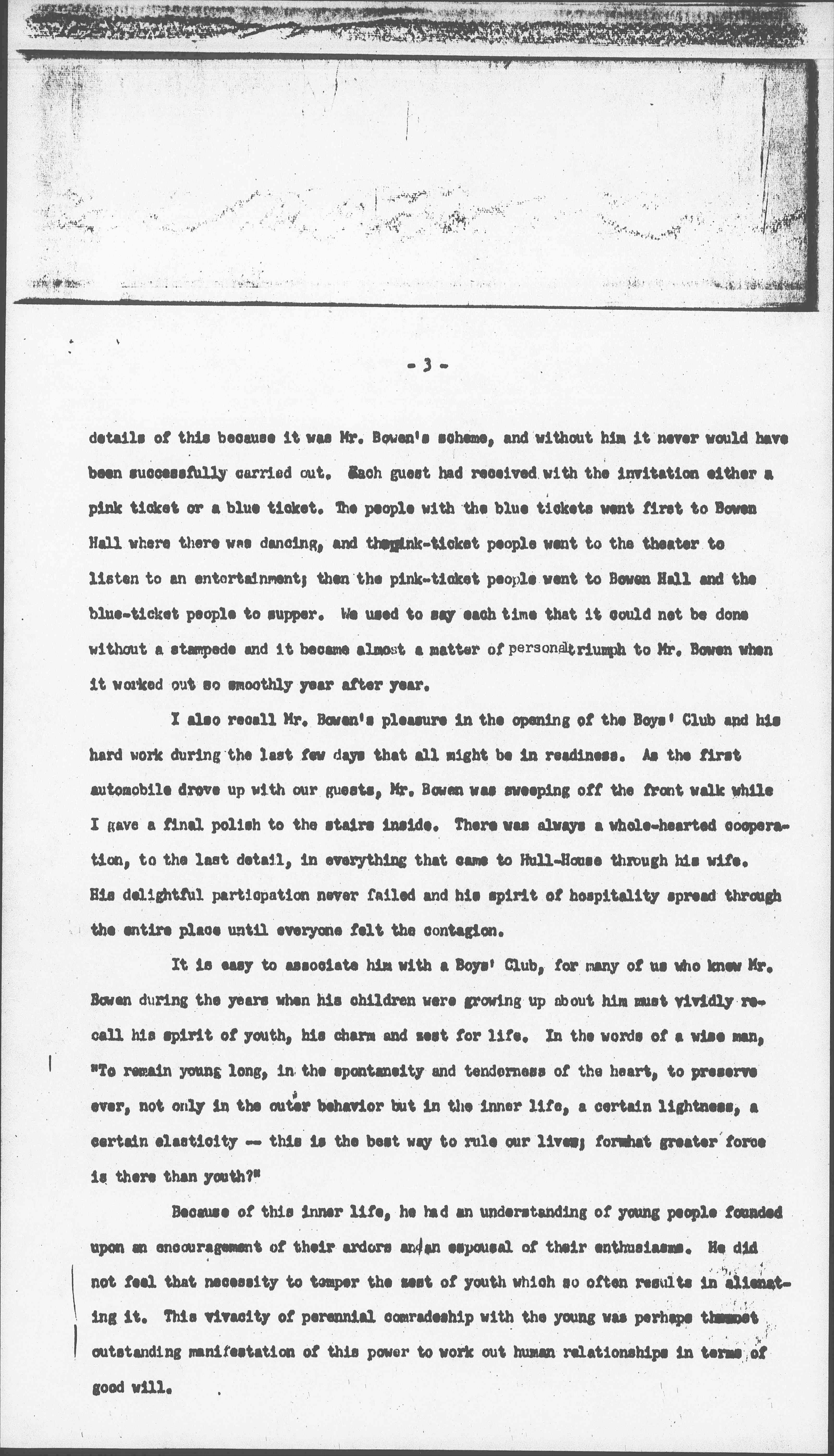 I recall the parties which Mrs. Bowen gave once a year when each member of the Club could bring an escort, and because more than a thousand people would attend one party we were obliged to have them in three different buildings. I am giving the [Page 3] details of this because it was Mr. Bowen's scheme, and without him it never would have been successfully carried out. Each guest had received with the invitation either a pink ticket or a blue ticket. The people with the blue tickets went first to Bowen Hall where there was dancing and the pink-ticket people went to Bowen Hall and the blue-ticket people to supper. We used to say each time that it could not be done without a stampede and it became almost a matter of personal triumph to Mr. Bowen when it worked out so smoothly year after year.