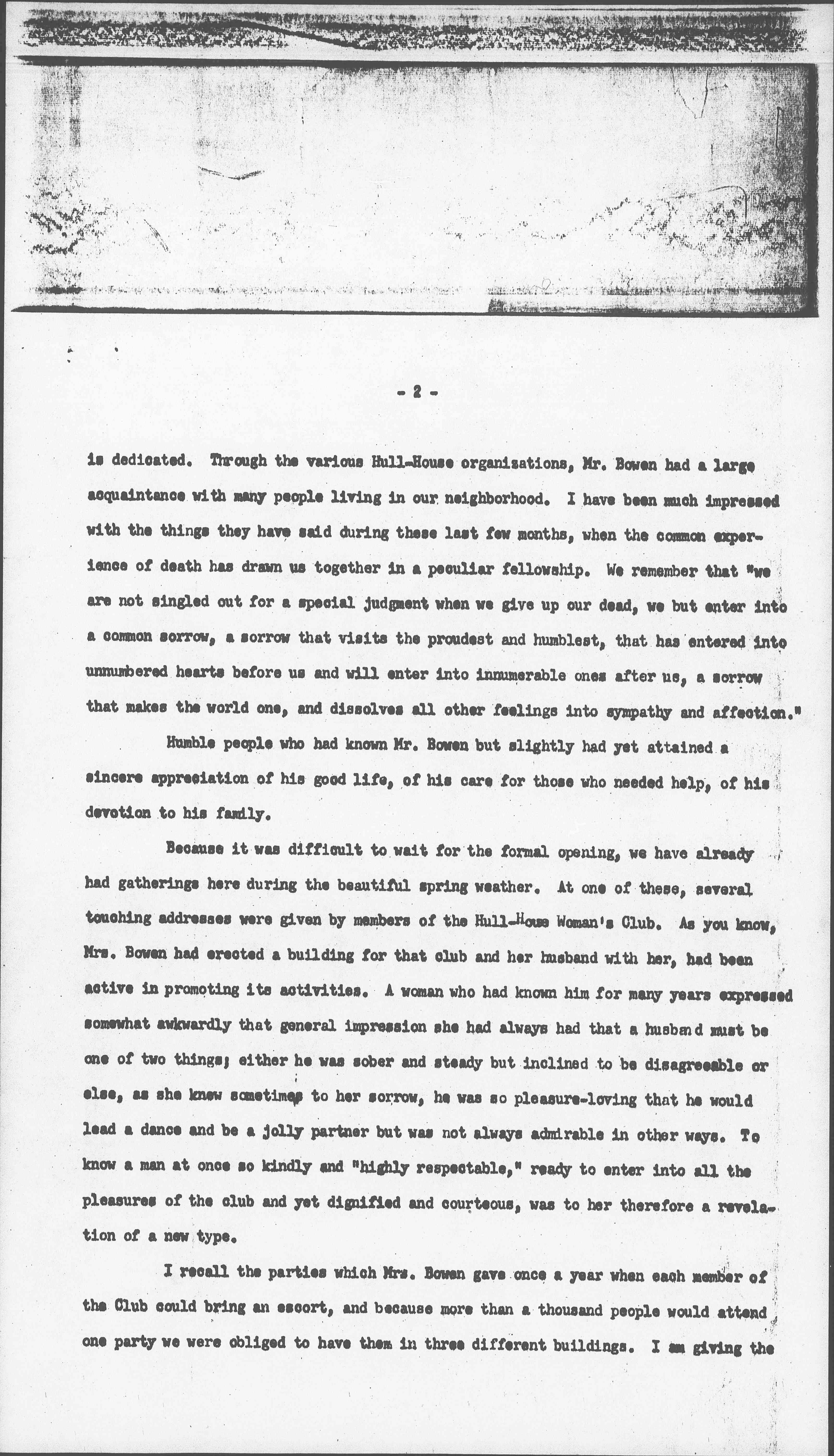 It adds greatly to the value of a memorial that the people to profit by it, to use it intimately, should have known and admired the person to whom the memorial [Page 2] is dedicated. Through the various Hull-House organizations, Mr. Bowen had a large acquaintance with many people living in our neighborhood. I have been much impressed with the things they have said during these last few months, when the common experience of death has drawn us together in a peculiar fellowship. We remember that "we are not singled out for a special judgment when we give up our dead, we but enter into a common sorrow, a sorrow that visits the proudest and humblest, that has entered into unnumbered hearts before us and will enter into innumerable ones after us, a sorrow that makes the world one, and dissolves all other feelings into sympathy and affection."