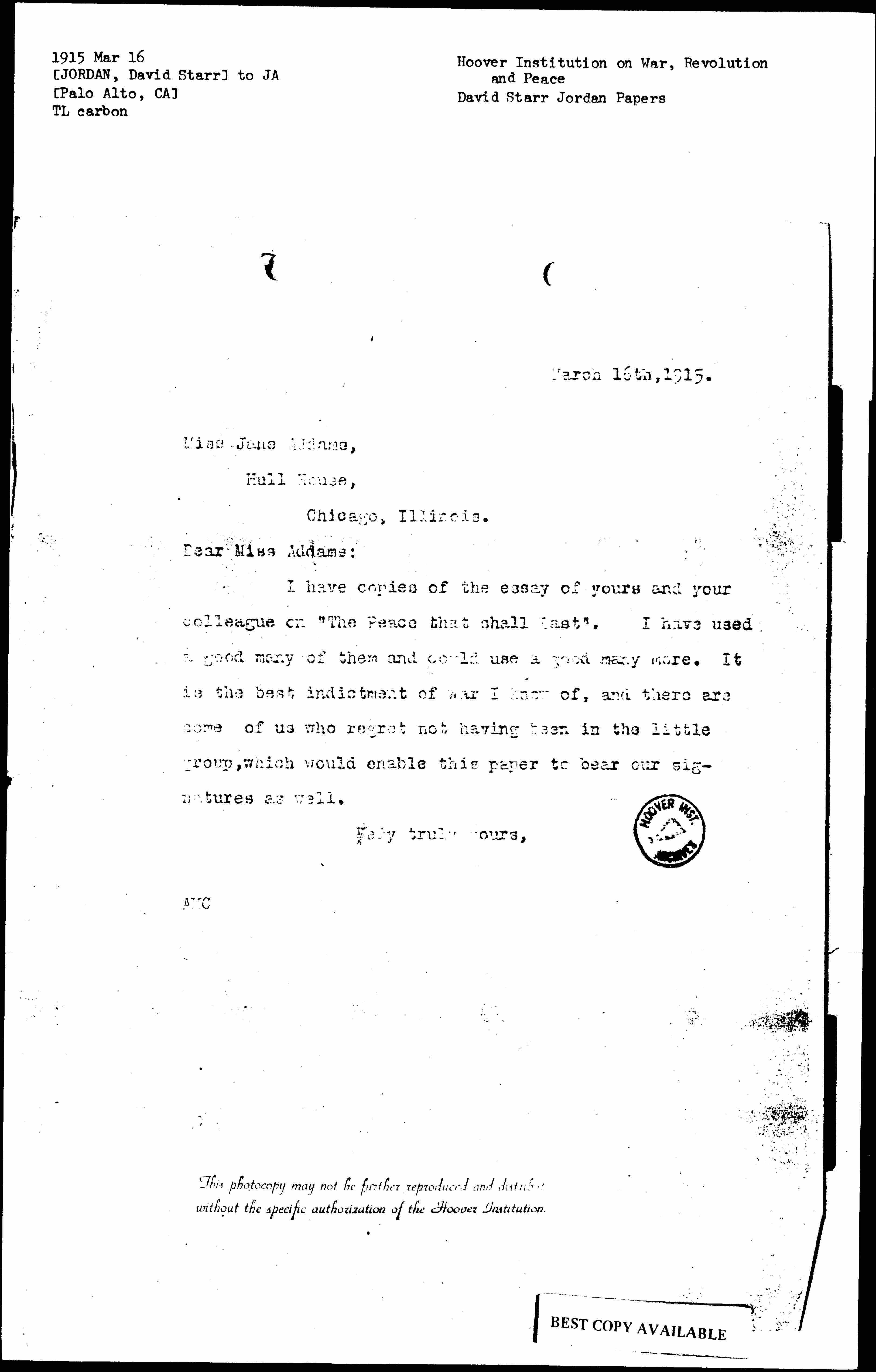 I have copies of the essay of yours and your colleague on "The Peace that shall Last". I have used a good many of them and could use a good many more. It is the best indictment of war I know of, and there are some of us who regret not having been in the little group, which would enable this paper to bear our signatures as well.