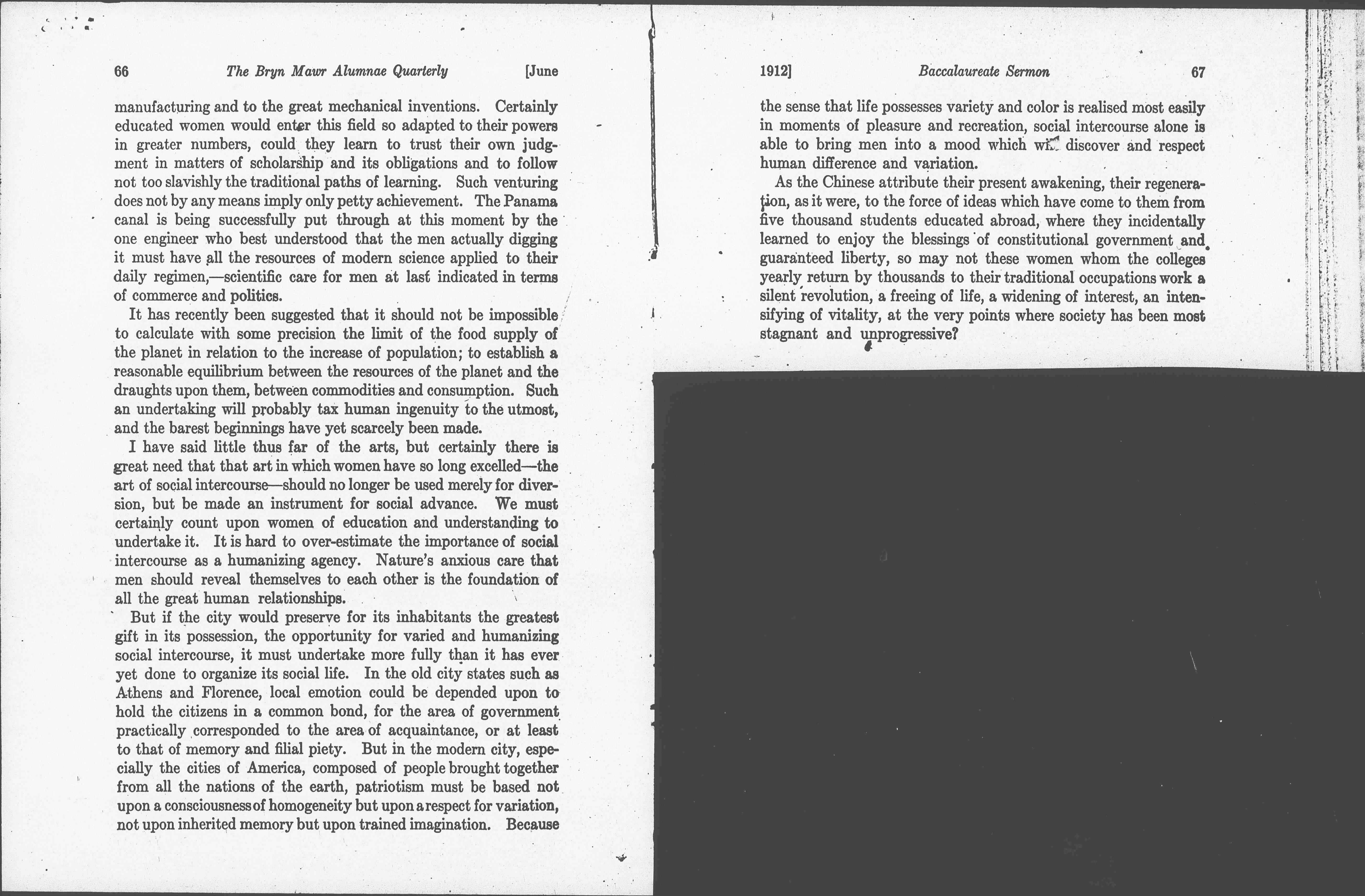 No one is more needed at the present moment than the expert in the application of ascertained scientific knowledge to the humanization of life. Many well equipped women will doubtless find careers as brilliant as those of the men who for the last half century have successfully applied scientific knowledge to the processes of [page 8] manufacturing and to the great mechanical inventions. Certainly educated women would enter this field so adapted to their powers in greater numbers, could they learn to trust their own judgement in matters of scholarship and its obligations and to follow not too slavishly the traditional paths of learning. Such venturing does not by any means imply only petty achievement. The Panama canal is being successfully put through at this moment by the one engineer who best understood that the men actually digging it must have all the resources of modern science applied to their daily regimen, -- scientific care for men at last indicated in terms of commerce and politics.