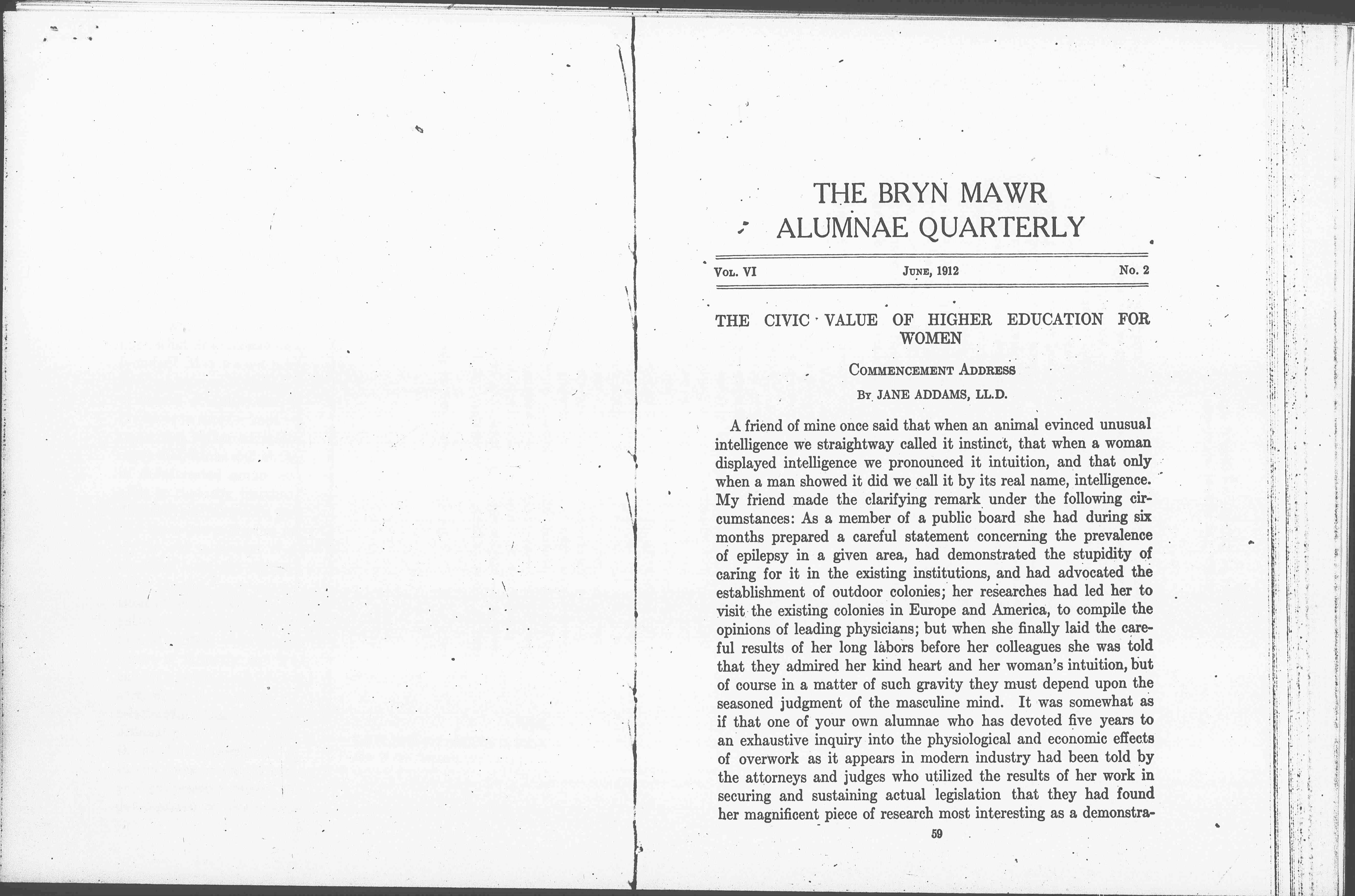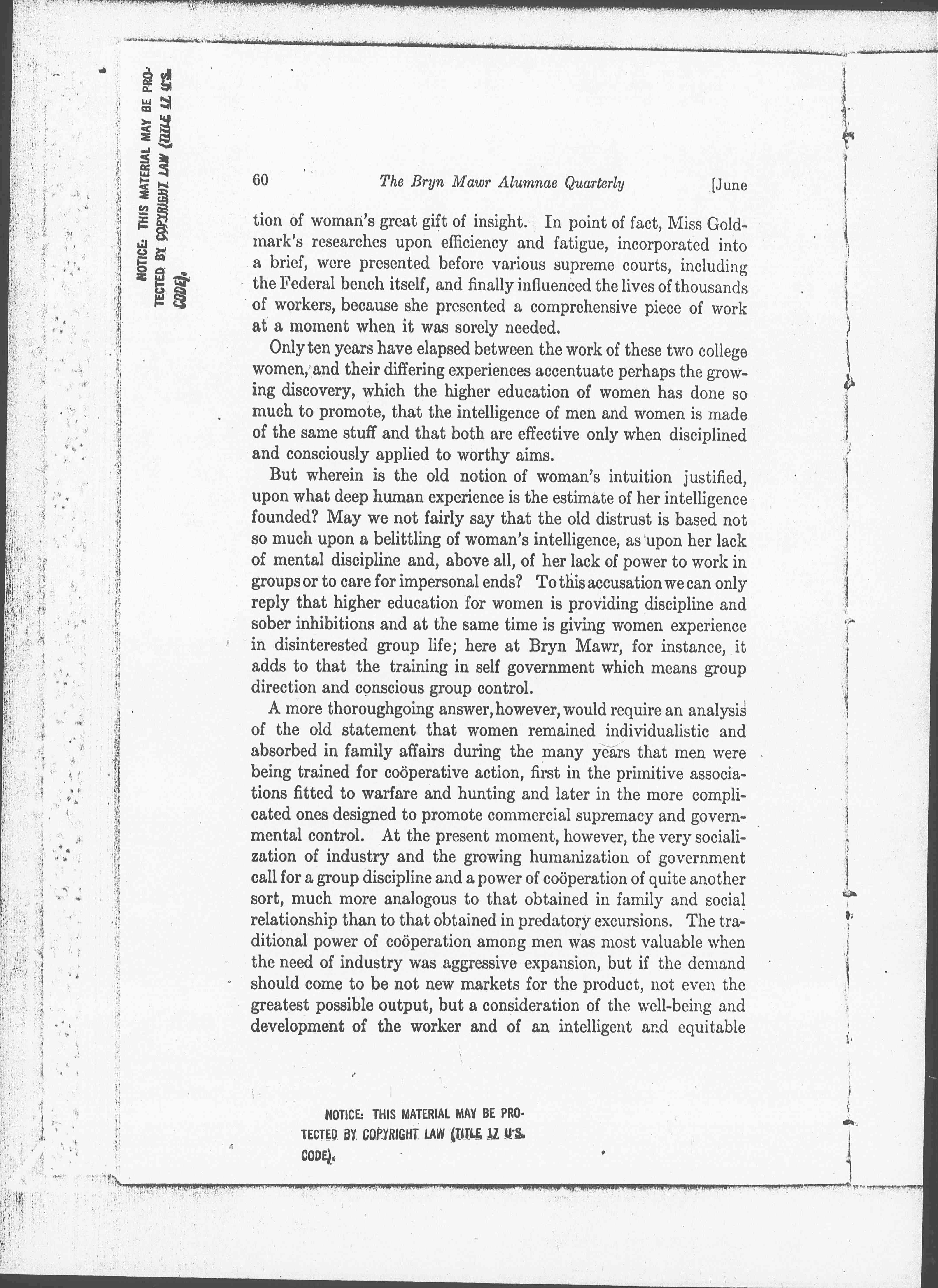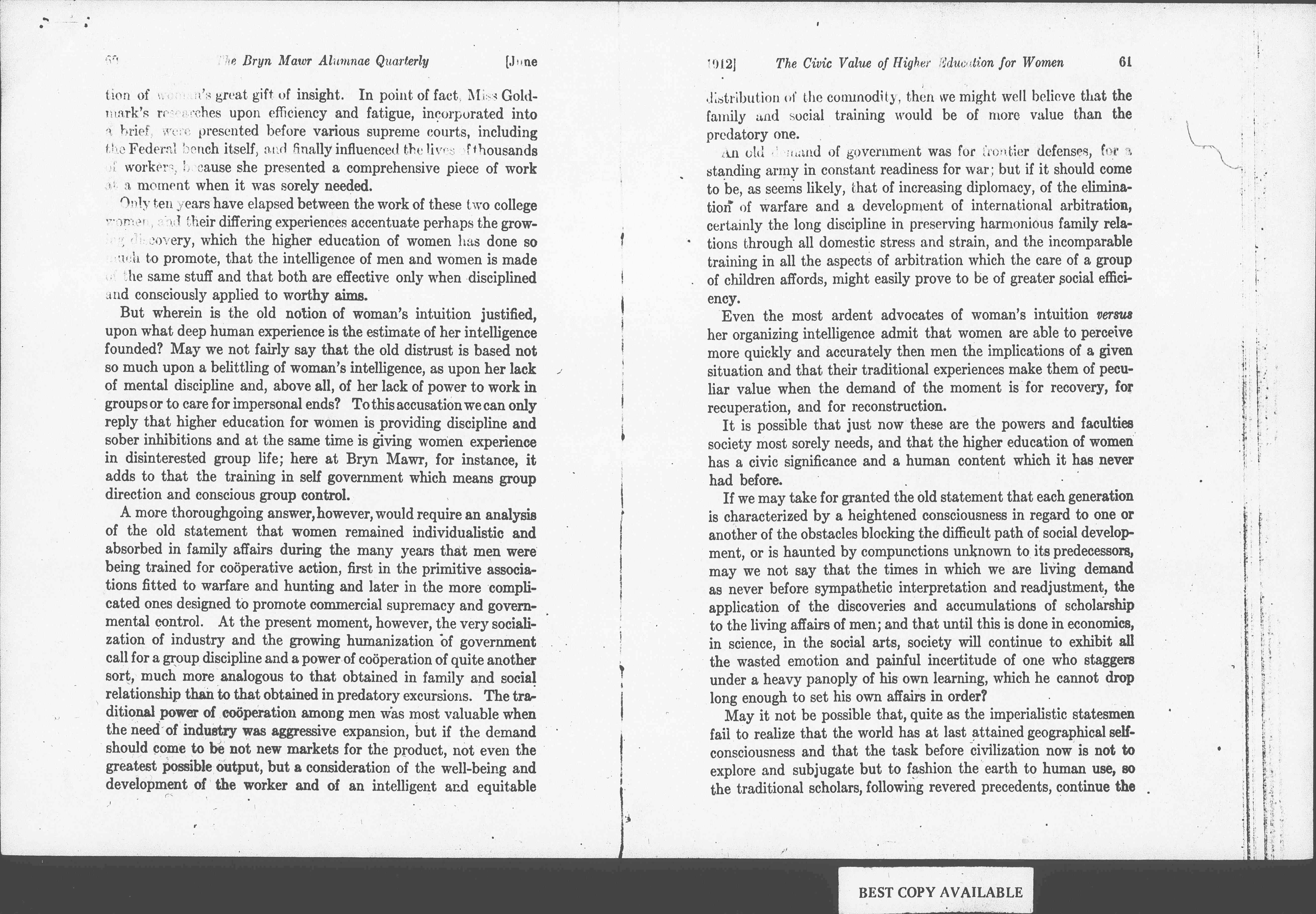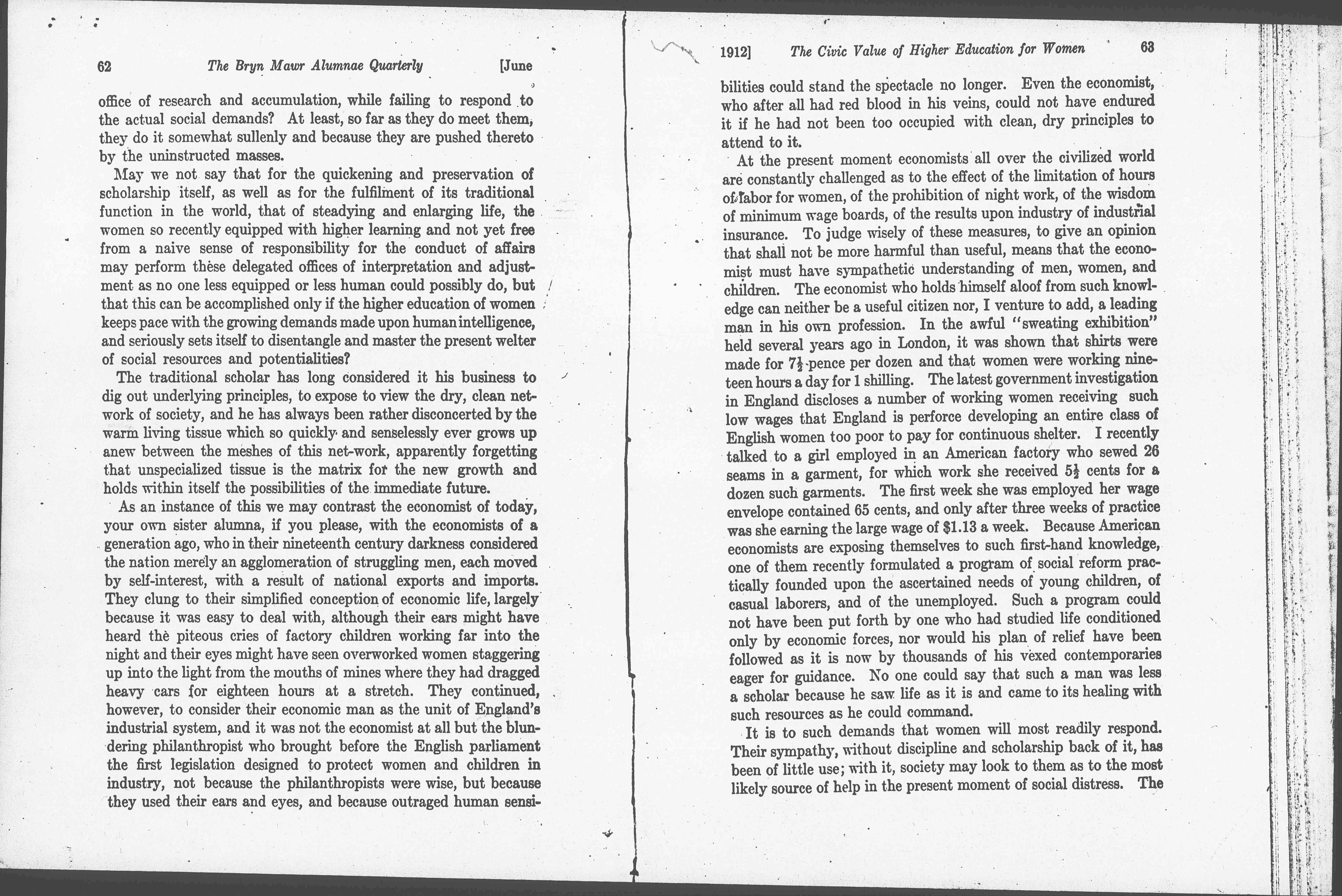 A friend of mine once said that when an animal evinced unusual intelligence we straightway called it instinct, that when a woman displayed intelligence we pronounced it intuition, and that only when a man showed it did we call it by its real name, intelligence. My friend made the clarifying remark under the following circumstances: As a member of a public board she had during six months prepared a careful statement concerning the prevalence of epilepsy in a given area, had demonstrated the stupidity of caring for it in the existing institutions, and had advocated the establishment of outdoor colonies; her researches had led her to visit the existing colonies in Europe and America, to compile the opinions of leading physicians; but when she finally laid the careful results of her long labors before her colleagues she was told that they admired her kind heart and her woman's intuition, but of course in a matter of such gravity they must depend upon the seasoned judgement of the masculine mind. It was somewhat as if that one of your own alumnae who has devoted five years to an exhaustive inquiry into the physiological and economic effects of overwork as it appears in modern industry had been told by the attorneys and judges who utilized the results of her work in securing and sustaining actual legislation that they had found her magnificent piece of research most interesting as a demonstration [page 2] of woman's great gift of insight. In point of fact, Miss Goldmark's researches upon efficiency and fatigue, incorporated into a brief, were presented before various supreme courts, including the Federal bench itself, and finally influenced the lives of thousands of workers, because she presented a comprehensive piece of work at a moment when it was sorely needed.
