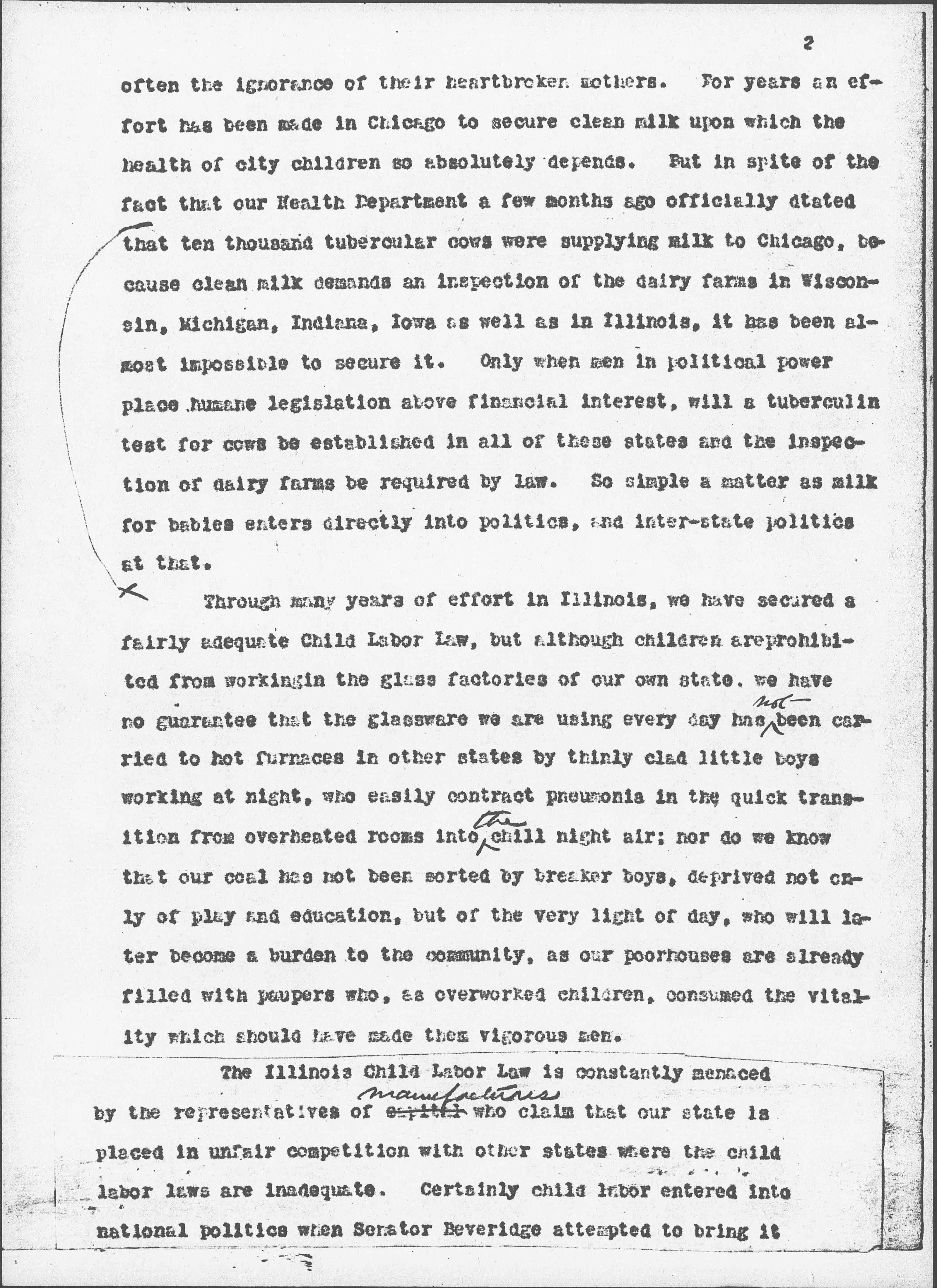 The Illinois Child Labor Law is constantly menaced by the representatives of <manufacturers> capital who claim that our state is placed in unfair competition with other states where the child labor laws are inadequate. Certainly child labor entered into national politics when Senator Beveridge attempted to bring it [page 3] under federal control through the Inter-State Commerce Acts, that he still sees such a need is demonstrated by his speech at the opening of the Progressive Convention "Children workers at the looms in South Carolina means bayonets at the breasts of men and women working in Massachusetts, who strike for higher wages."
