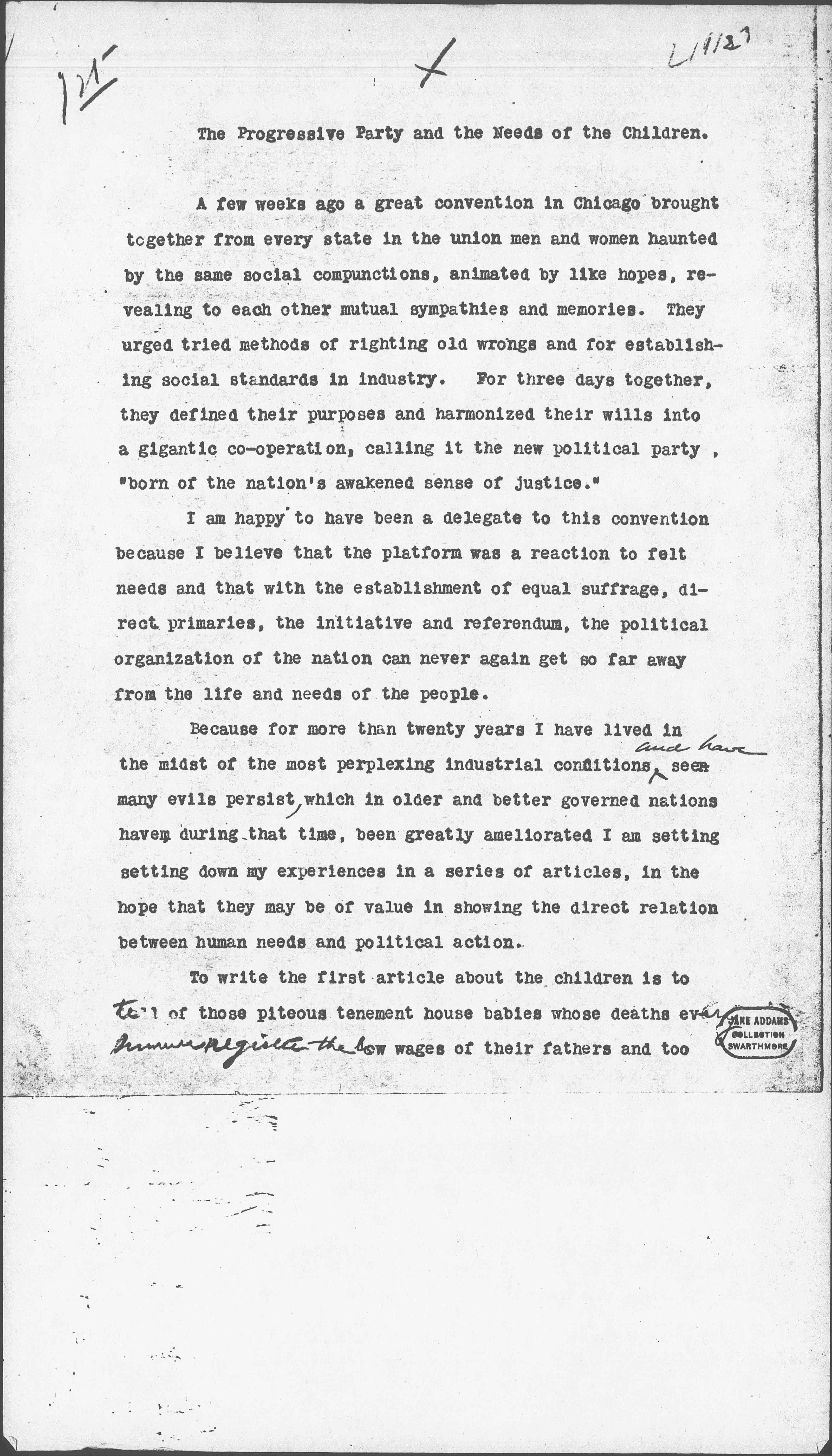 To write the first article about the children is to tell of those piteous tenement house babies whose deaths every <summer register the> low wages of their fathers and too [page 2] often the ignorance of their heartbroken mothers. For years an effort has been made in Chicago to secure clean milk upon which the health of city children so absolutely depends. But in spite of the fact that our Health Department a few months ago officially stated that ten thousand tubercular cows were supplying milk to Chicago, because clean milk demands an inspection of the dairy farms in Wisconsin, Michigan, Indiana, Iowa as well as in Illinois, it has been almost impossible to secure it. Only when men in political power place humane legislation above financial interest, will a tuberculin test for cows be established in all of these states and the inspection of dairy farms be required by law. So simple a matter as milk for babies enters directly into politics, and inter-state politics at that.