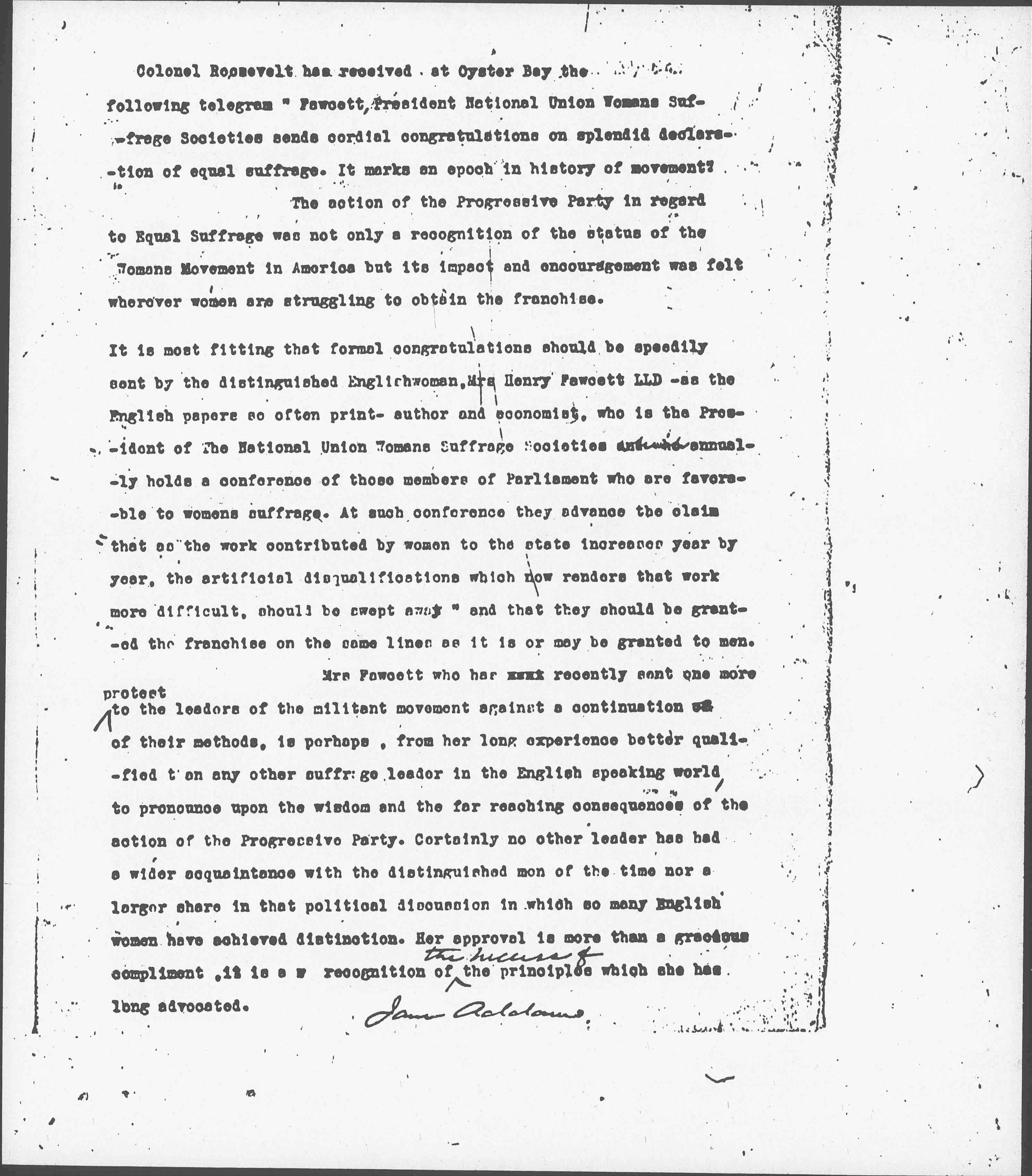 Mrs Fawcett who has recently sent one more <protest> to the leaders of the militant movement against a continuation of their methods, is perhaps, from her long experience better qualified than any other suffrage leader in the English speaking world, to pronounce upon the wisdom and the far reaching consequences of the action of the Progressive Party. Certainly no other leader has had a wider acquaintance with the distinguished men of the time nor a larger share in that political discussion in which so many English women have achieved distinction. Her approval is more than a gracious compliment, it is recognition of <the success of> the principles which she has long advocated.