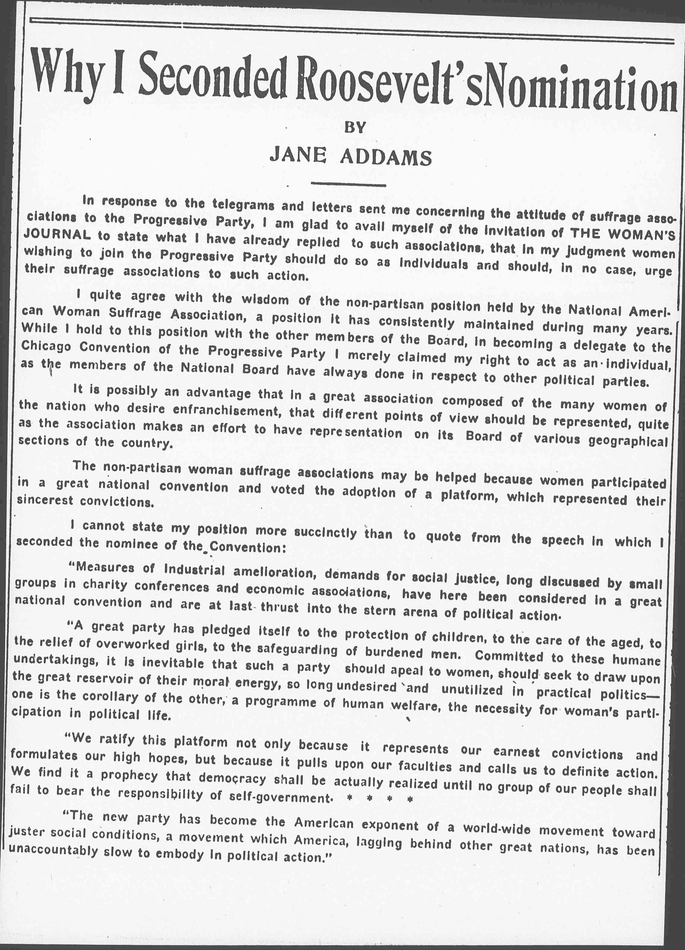 "A great party has pledged itself to the protection of children, to the care of the aged, to the relief of overworked girls, to the safeguarding of burdened men. Committed to these humane undertakings, it is inevitable that such a party should appeal to women, should seek to draw upon the great reservoir of their moral energy, so long undesired and unutilized in practical politics -- one is the corollary of the other, a [program] of human welfare, the necessity for woman's participation in political life.