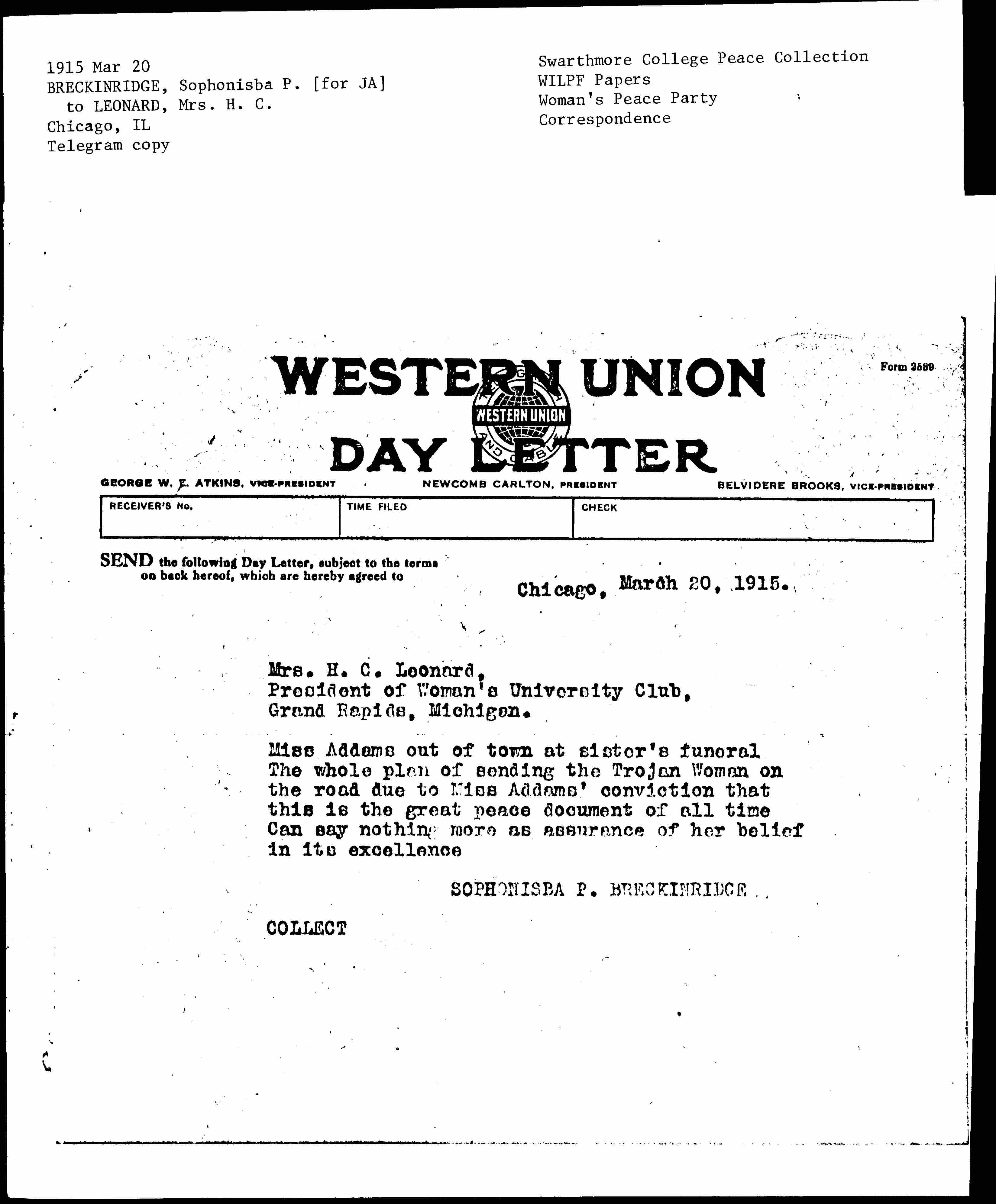 Miss Addams out of town at sister's funeral The whole plan of sending the Trojan [Women] on the road due to Miss Addams' conviction that this is the great peace document of all time Can say nothing more as assurance of her belief in its excellence