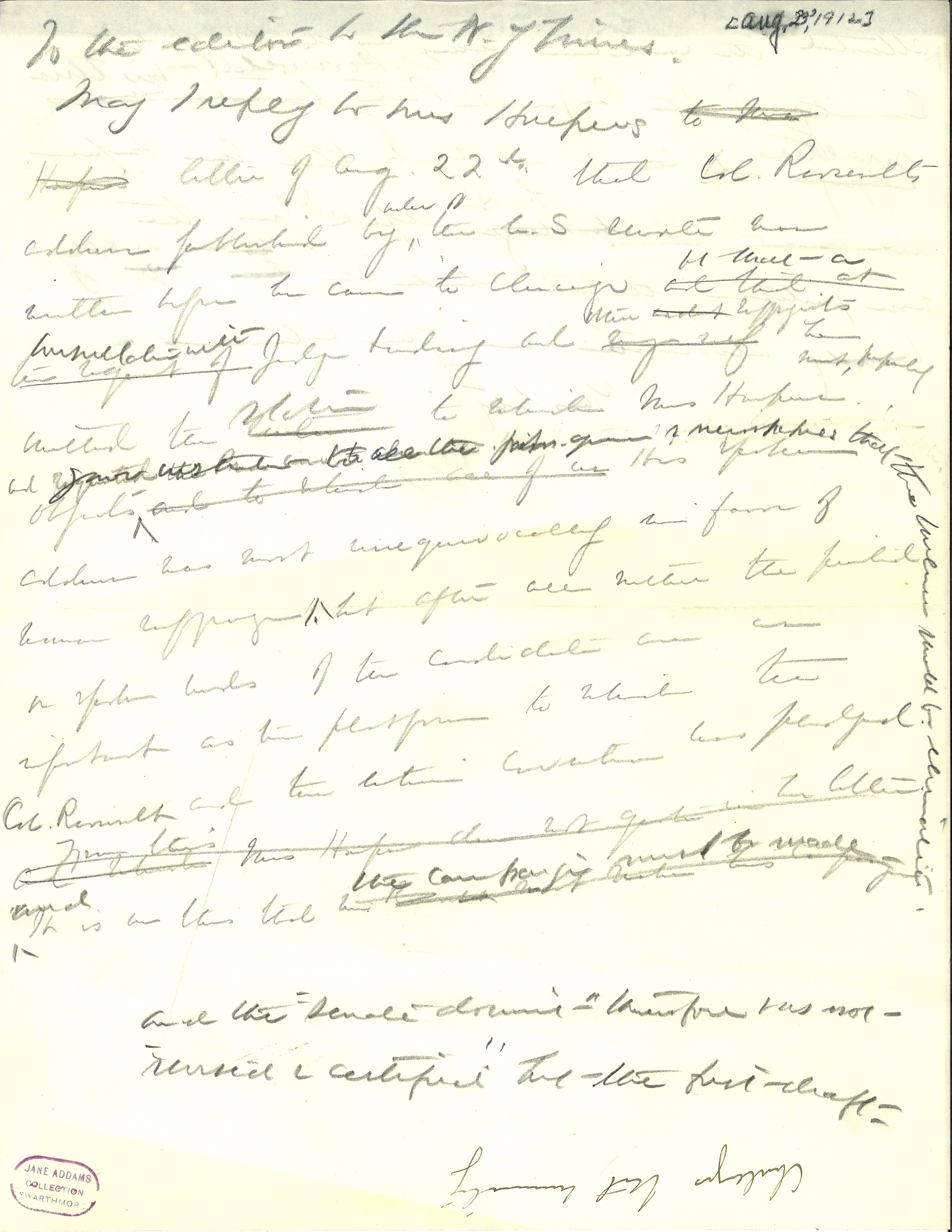 May I reply to Mrs Harpers to Mrs Harpers letter of Aug. 22th that Col. Roosevelts address, published by <order of> the U.S Senate was written before he came to Chicago and that the night of <at that at [illegible] with> Judge Lindsey and [illegible] <[illegible words] suffragists> he [omitted] the [illegible] <slate> to which Mrs. Harper objects [illegible words] <and gave instructions to the press agents and newspapers that the [illegible] should be eliminated> and to which all of us His spoken address was most unequivocally in favor of woman suffrage but after all neither the printed or spoken words of the candidate are as important as the platform to which the Col. Roosevelt and the entire convention has pledged and [illegible] <[illegible]> Mrs Harper does not quote in the letter <and> it is on this that [illegible words] <the campaign must be made>.