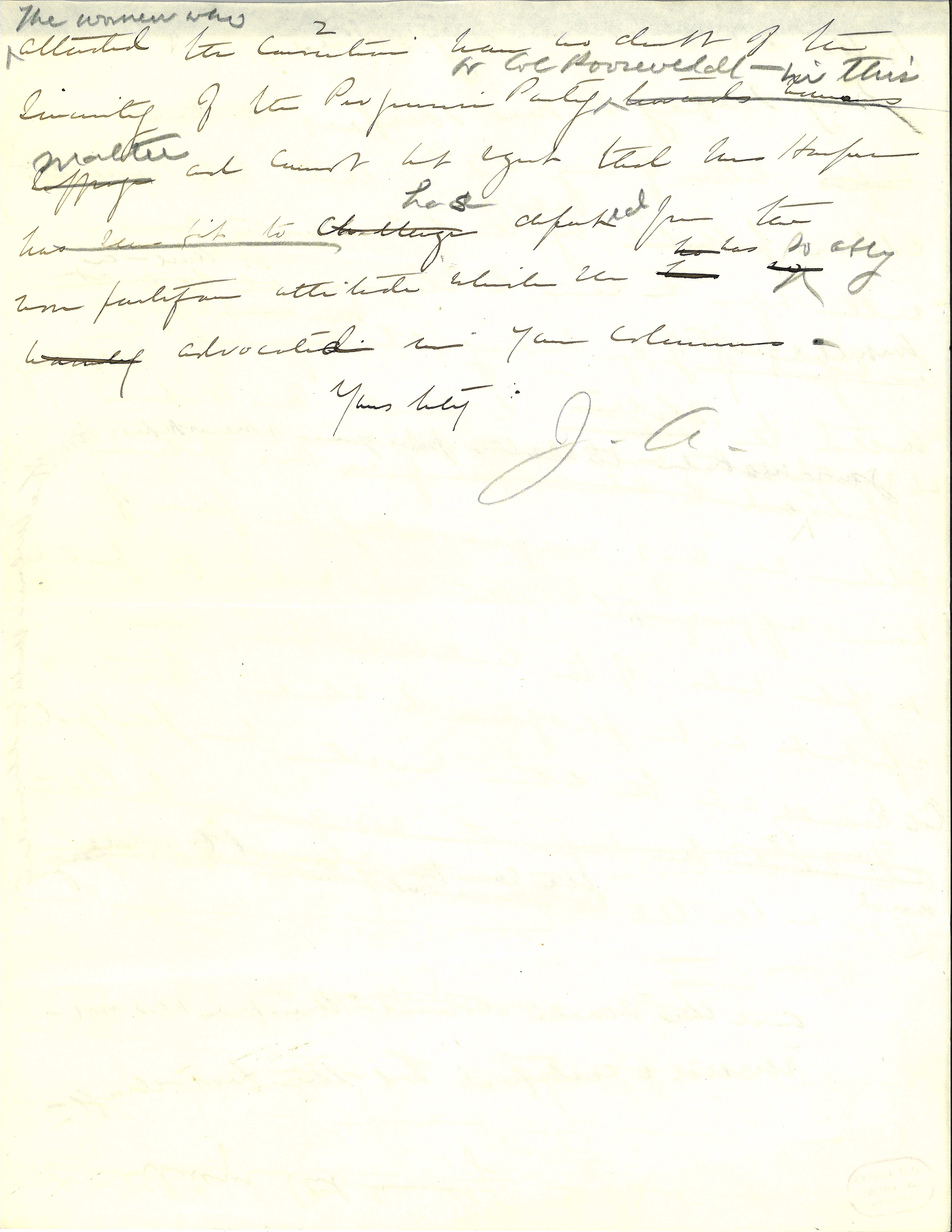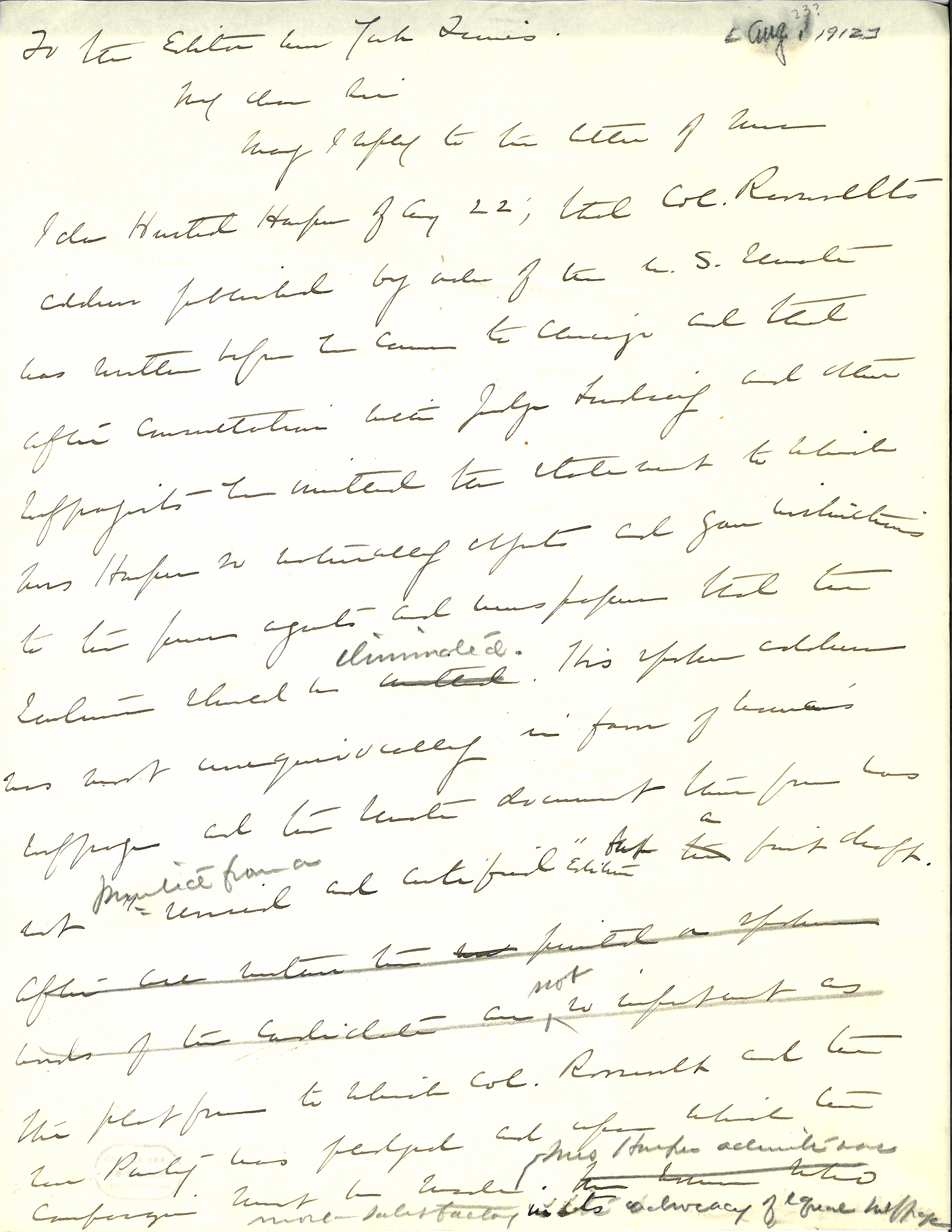 May I reply to the letter of Mrs Ida Husted Harper of Aug. 22; that Col. Roosevelts address published by order of the U.S. Senate was written before he came to Chicago and that after consultation with Judge Lindsey and other suffragists he omitted the statement to which Mrs. Harper so naturally objects and gave instructions to the press agents and newspapers that the sentence should be [omitted] <eliminated.>. His spoken address was most unequivocally in favor of woman's suffrage and the Senate document therefore was not <printed from a> "revised and certified" <edition> but the <a> first draft. After all mention his not printed or spoken words of the candidate are <not> be so important as the platform to which Col. Roosevelt and the new party was pledged and upon which the campaign must be made. <Mrs. Harper admits was most satisfactory in its advocacy of equal suffrage [page 2] <The women who> attended the convention have no doubt of the sincerity of the Progressive Party [towards woman's suffrage] <or Col. Roosevelt in this matter> and cannot but regret that Mrs Harper has seen fit to challenge <has departed> from the non partisan attitude which she has so <has so ably> herself advocated in your columns.