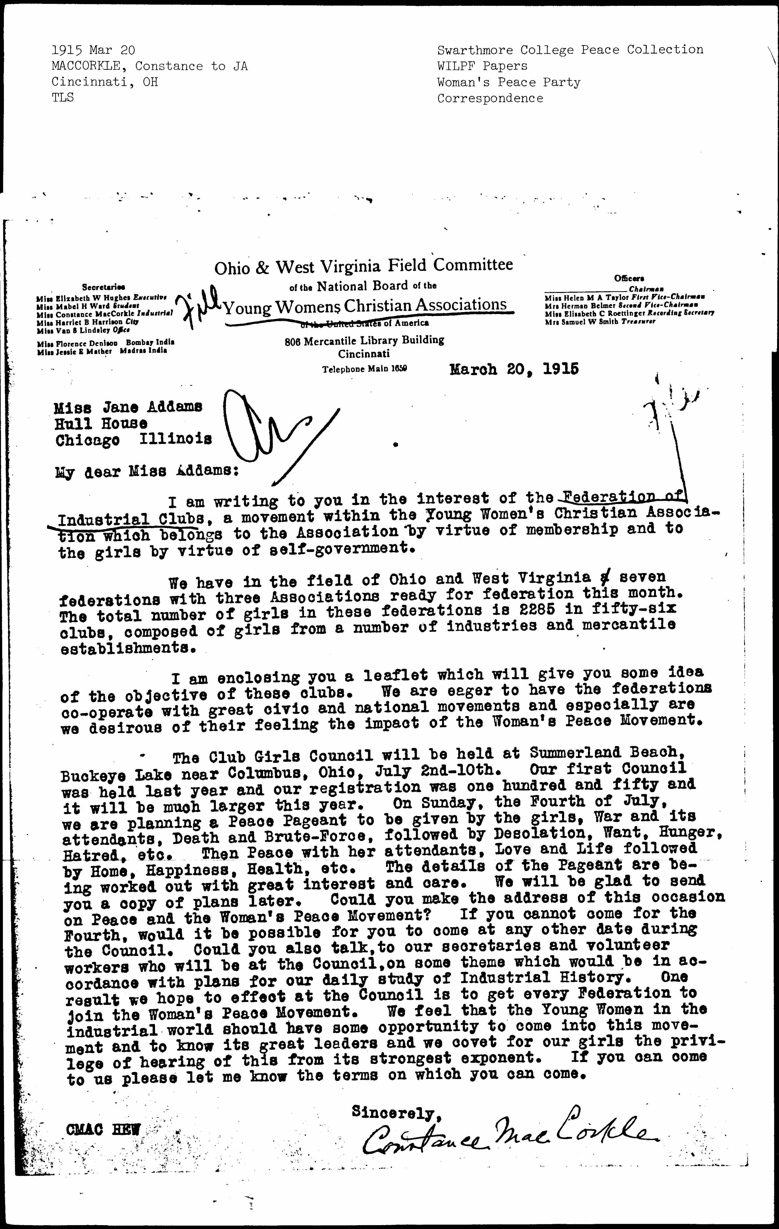The Club Girls Council will be held at Summerland Beach, Buckeye Lake near Columbus, Ohio, July 2nd-10th. Our first Council was held last year and our registration was one hundred and fifty and it will be much larger this year. On Sunday, the Fourth of July, we are planning a Peace Pageant to be given by the girls, War and its attendants, Death and Brute-Force, followed by Desolation, Want, Hunger, Hatred, etc. Then Peace with her attendants, Love and Life followed by Home, Happiness, Health, etc. The details of the Pageant are being worked out with great interest and care. We will be glad to send you a copy of plans later. Could you make the address of this occasion on Peace and the Woman's Peace Movement? If you cannot come for the Fourth, would it be possible for you to come at any other date during the Council. Could you also talk, to our secretaries and volunteer workers who will be at the Council, on some theme which would be in accordance with plans for our daily study of Industrial History. One result we hope to effect at the Council is to get every Federation to join the Woman's Peace Movement. We feel that the Young Women in the industrial world should have some opportunity to come into this movement and to know its great leaders and we covet for our girls the privilege of hearing of this from its strongest exponent. If you can come to us please let me know the terms on which you can come.