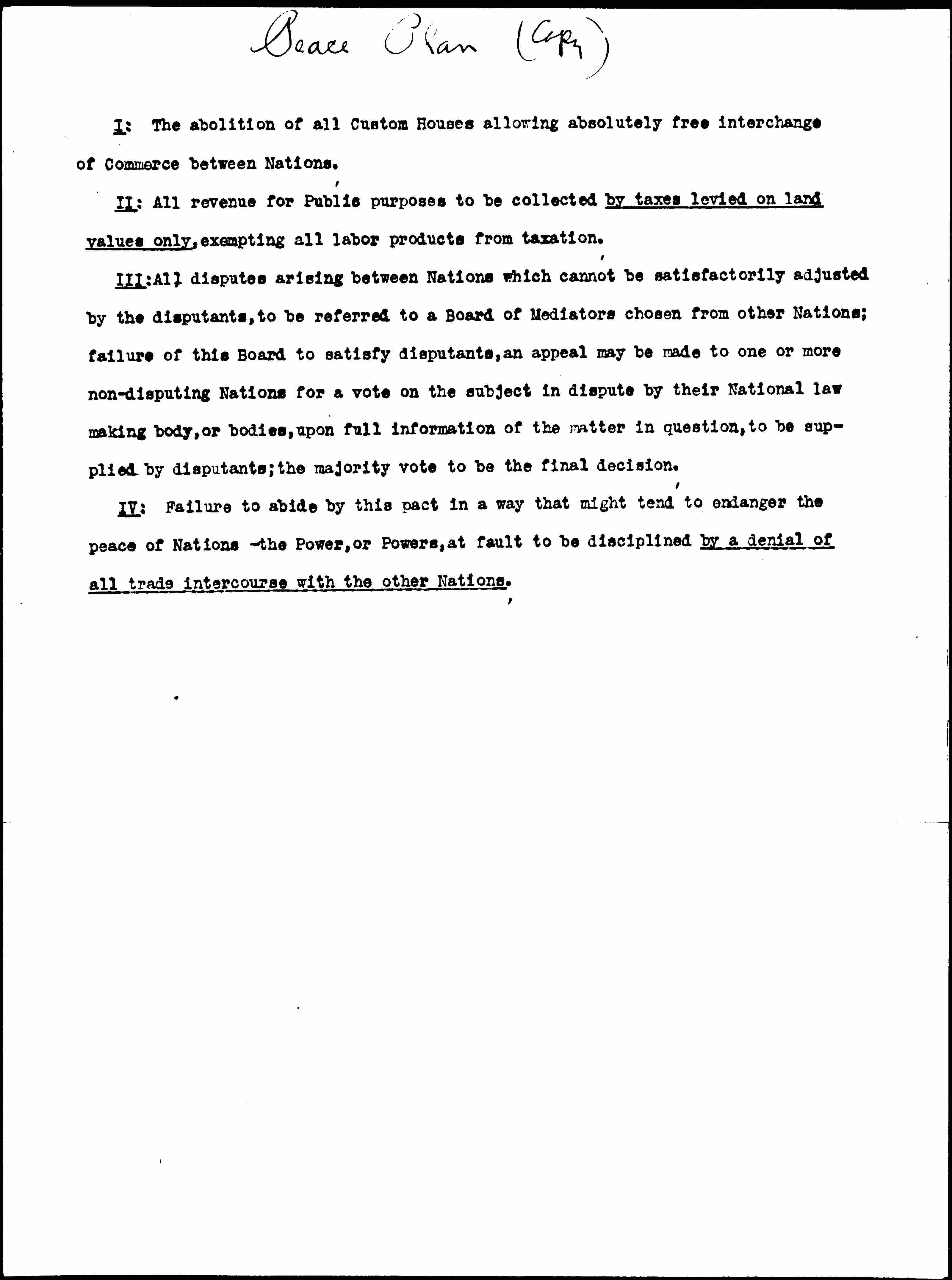 IV: Failure to abide by this pact in a way that might tend to endanger the peace of Nations -- the Power, or Powers, at fault to be disciplined by a denial of all trade intercourse with the other Nations.