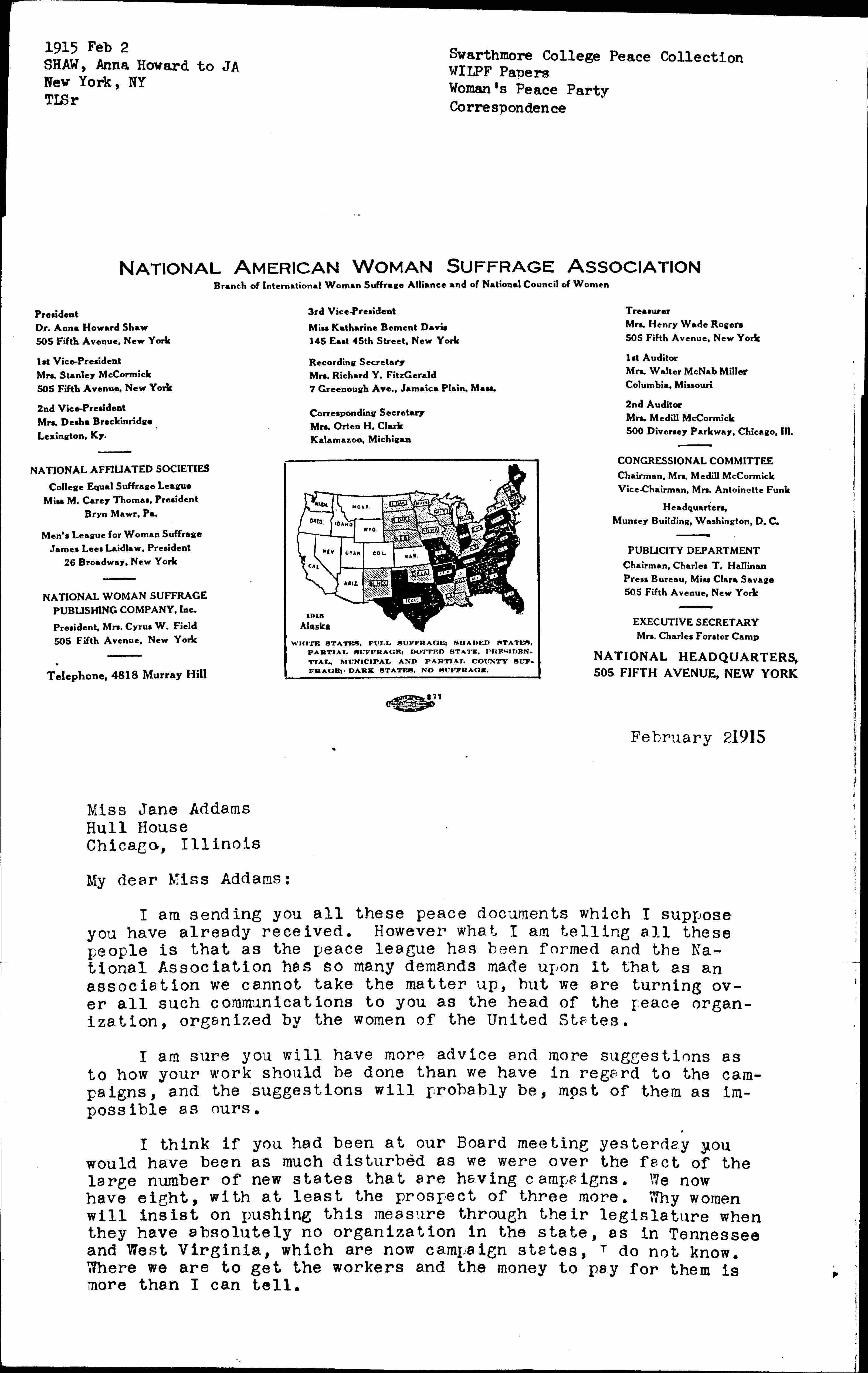 I am sending you all these peace documents which I suppose you have already received. However what I am telling all these people is that as the peace league has been formed and the National Association has so many demands made upon it that as an association we cannot take the matter up, but we are turning over all such communications to you as the head of the peace organization, organized by the women of the United States.