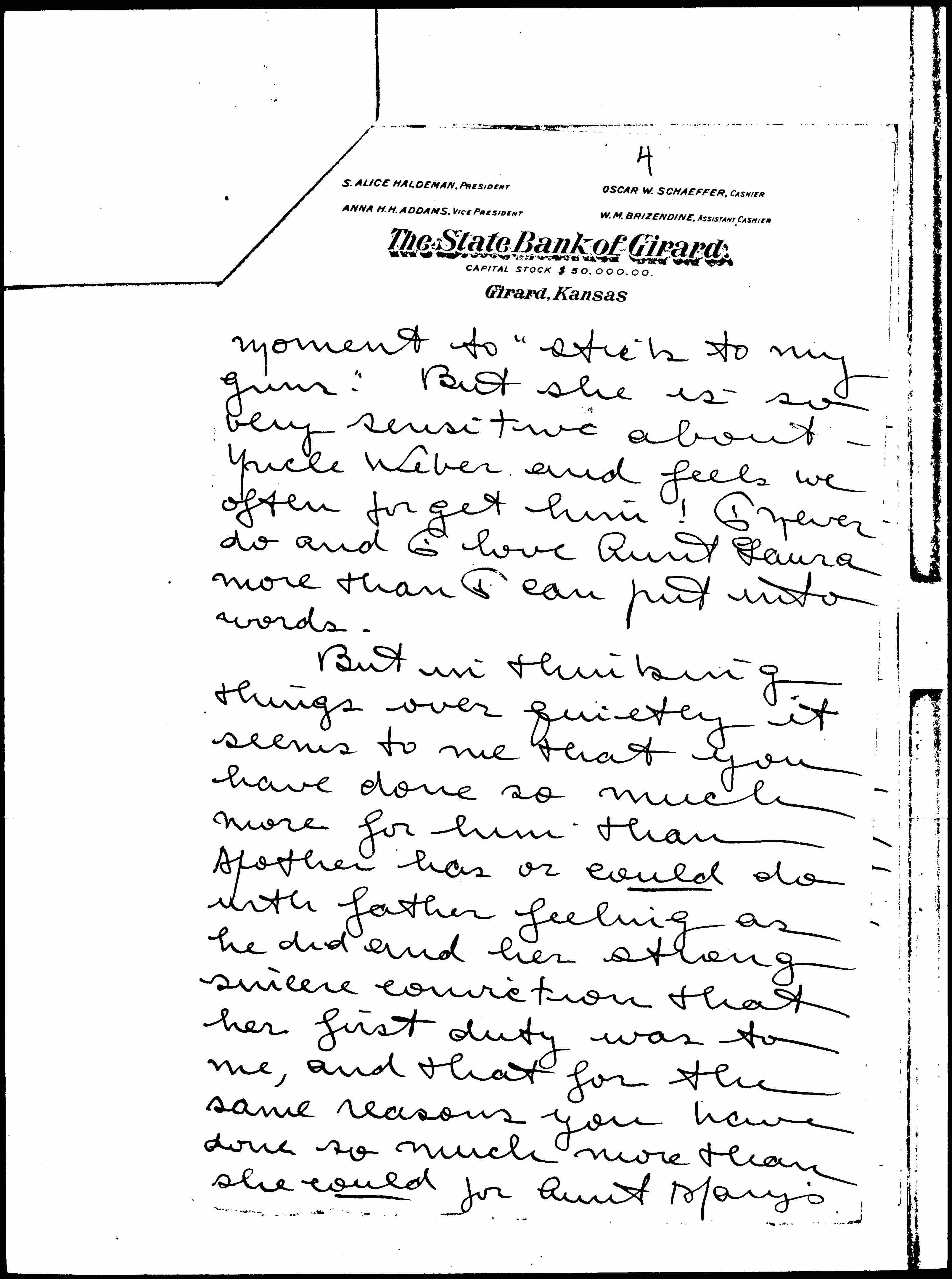 I would rather you didn't tell Aunt Laura about this. Though I am always willing at any [page 4] moment to "stick to my guns." But she is so very sensitive about Uncle Weber and feels we often forget him! I never do and I love Aunt Laura more than I can put into words.