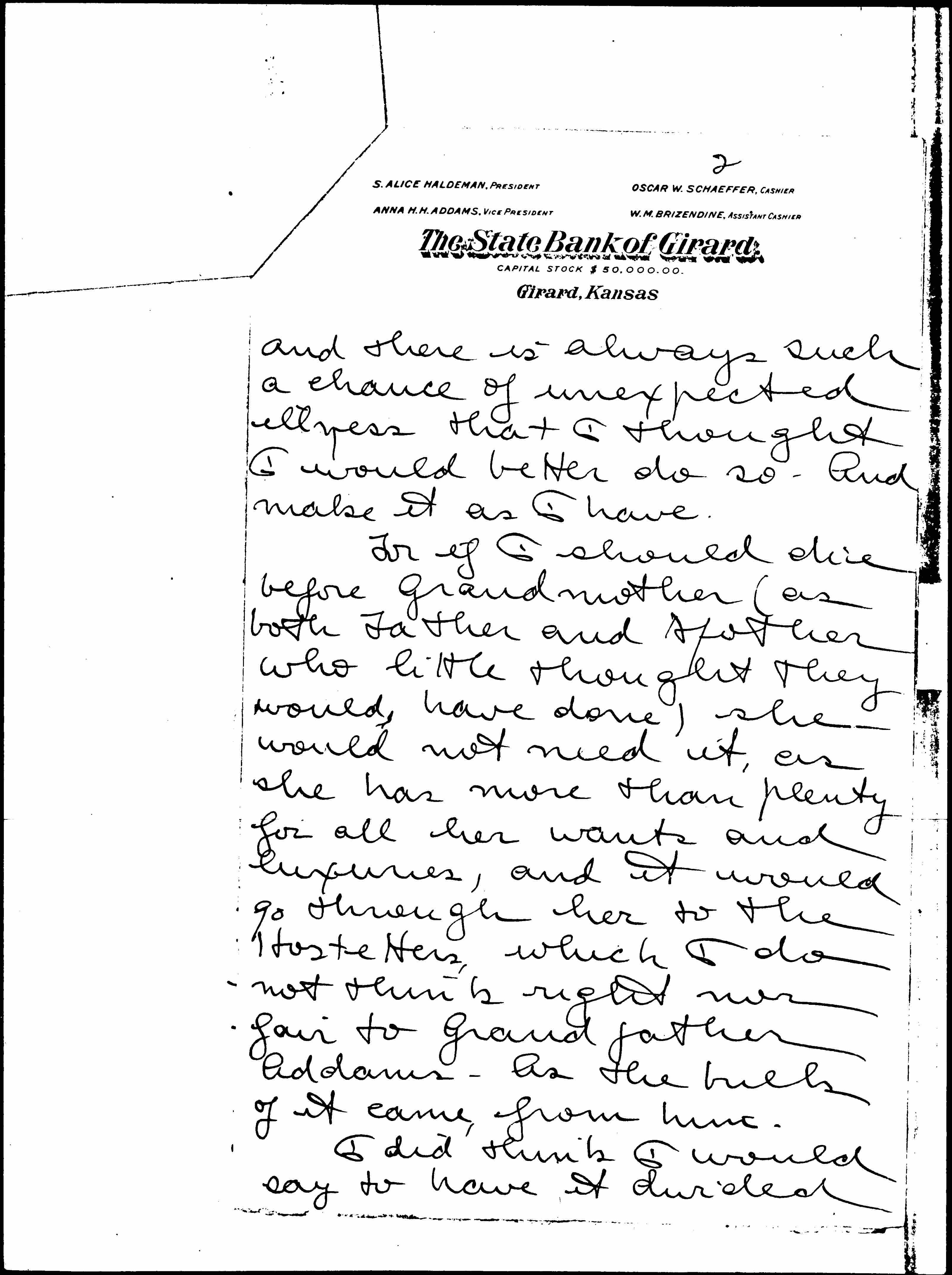 For if I should die before grandmother (as both Father and Mother who little thought they would, have done) she would not need it, as she has more than plenty for all her wants and luxuries, and it would go through her to the Hostetters, which I do not think right nor fair to Grandfather Addams -- as the bulk of it came from him.