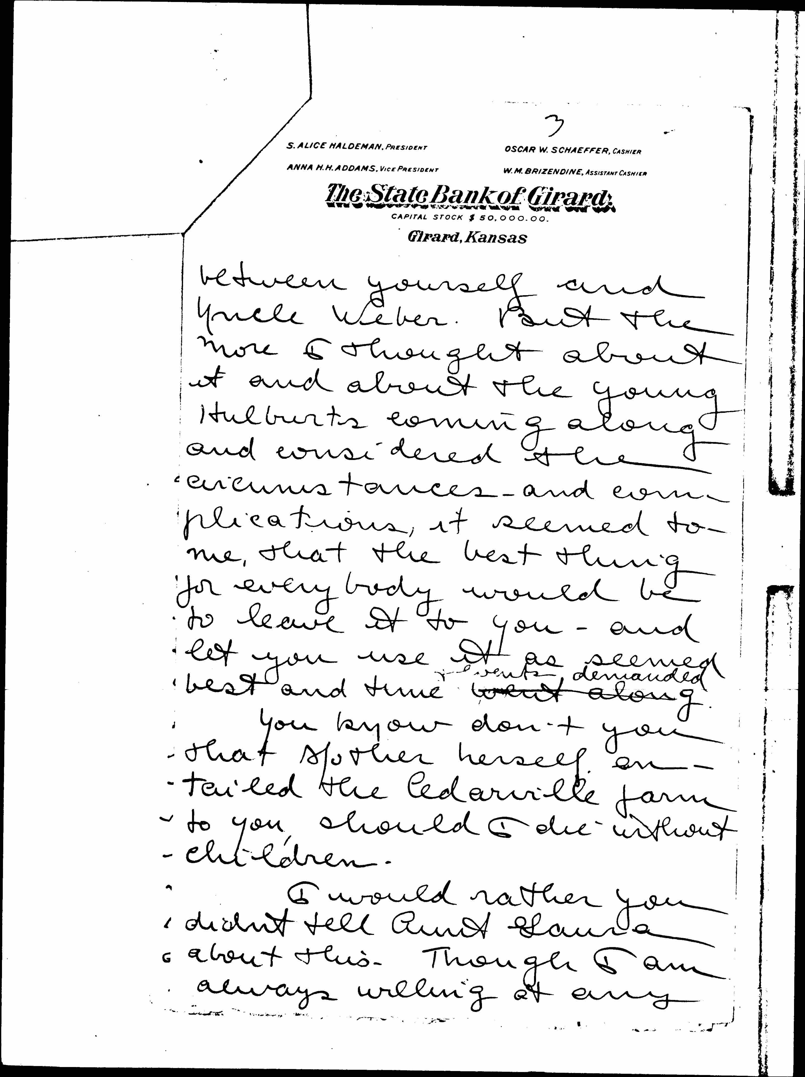 I did think I would say to have it divided [page 3] between yourself and Uncle Weber. But the more I thought about it and about the young Hulburts coming along and considered the circumstances -- and complications, it seemed to me, that the best thing for everybody would be to leave it to you -- and let you use it as seemed best and time went along <& events demanded>.