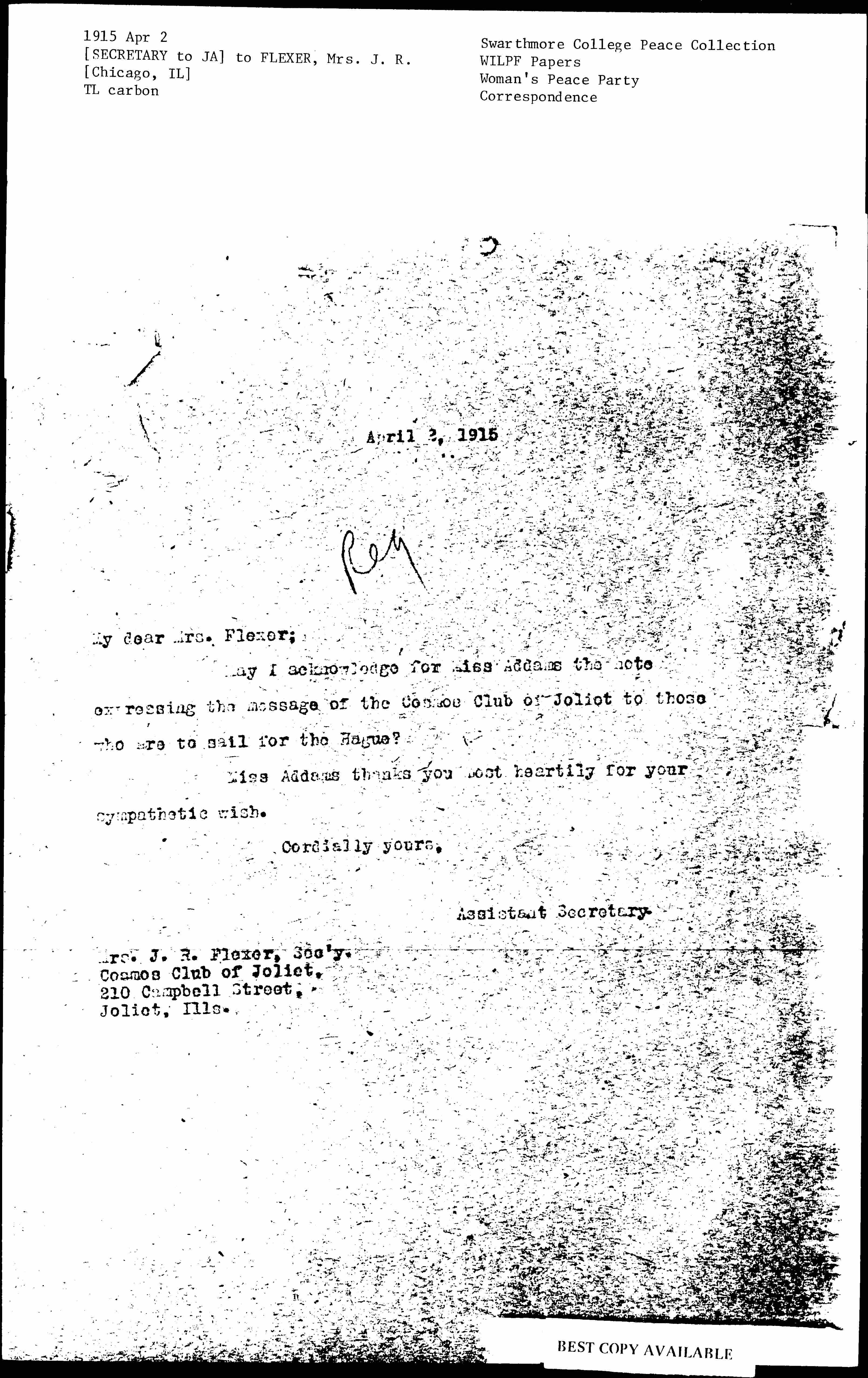 May I acknowledge for Miss Addams the note expressing the message of the Cosmos Club of Joliet to those who are to sail for The Hague?