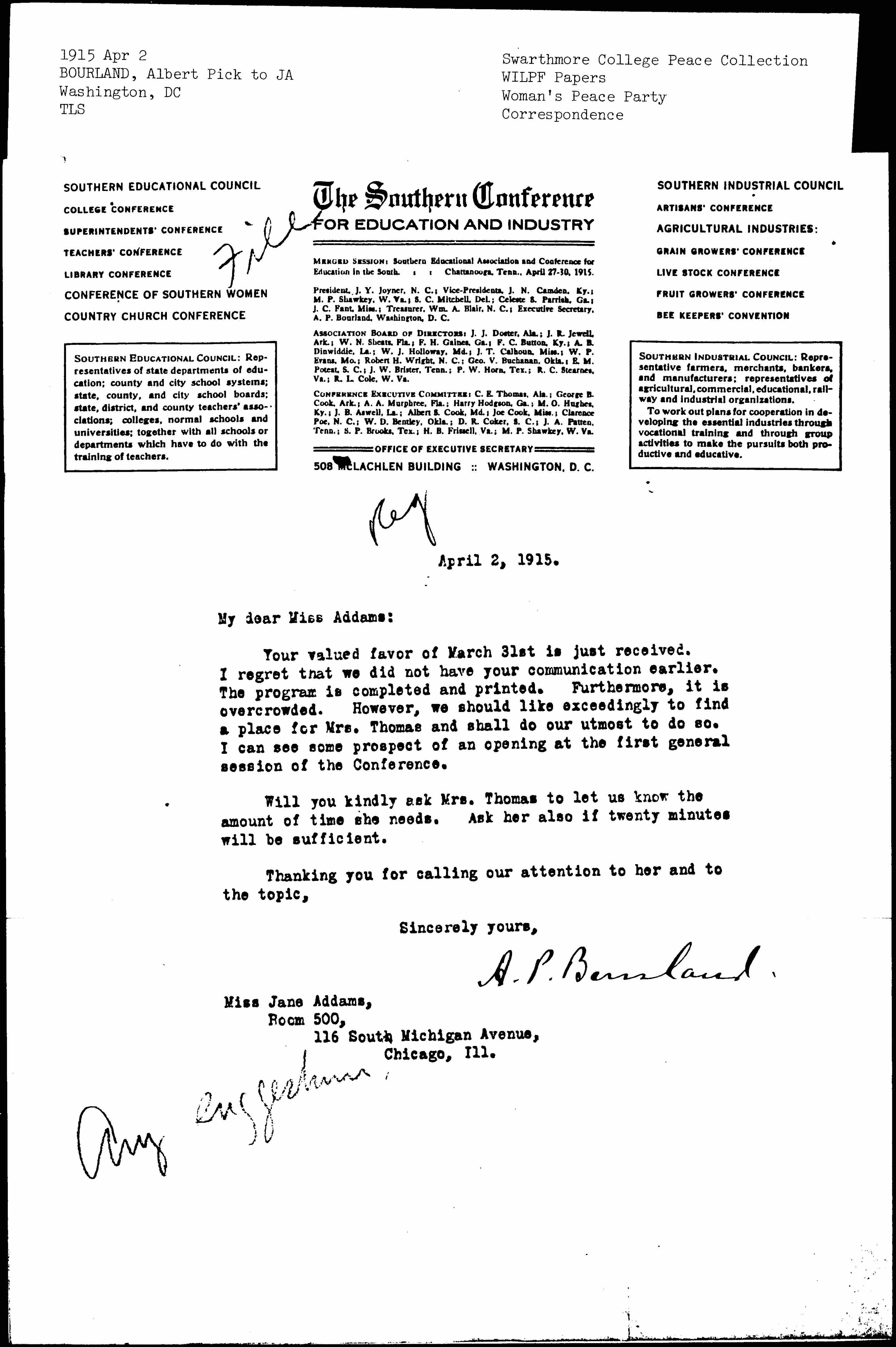 Your valued favor of March 31st is just received. I regret that we did not have your communication earlier. The program is completed and printed. Furthermore, it is overcrowded. However, we should like exceedingly to find a place for Mrs. Thomas and shall do our utmost to do so. I can see some prospect of an opening at the first general session of the Conference.