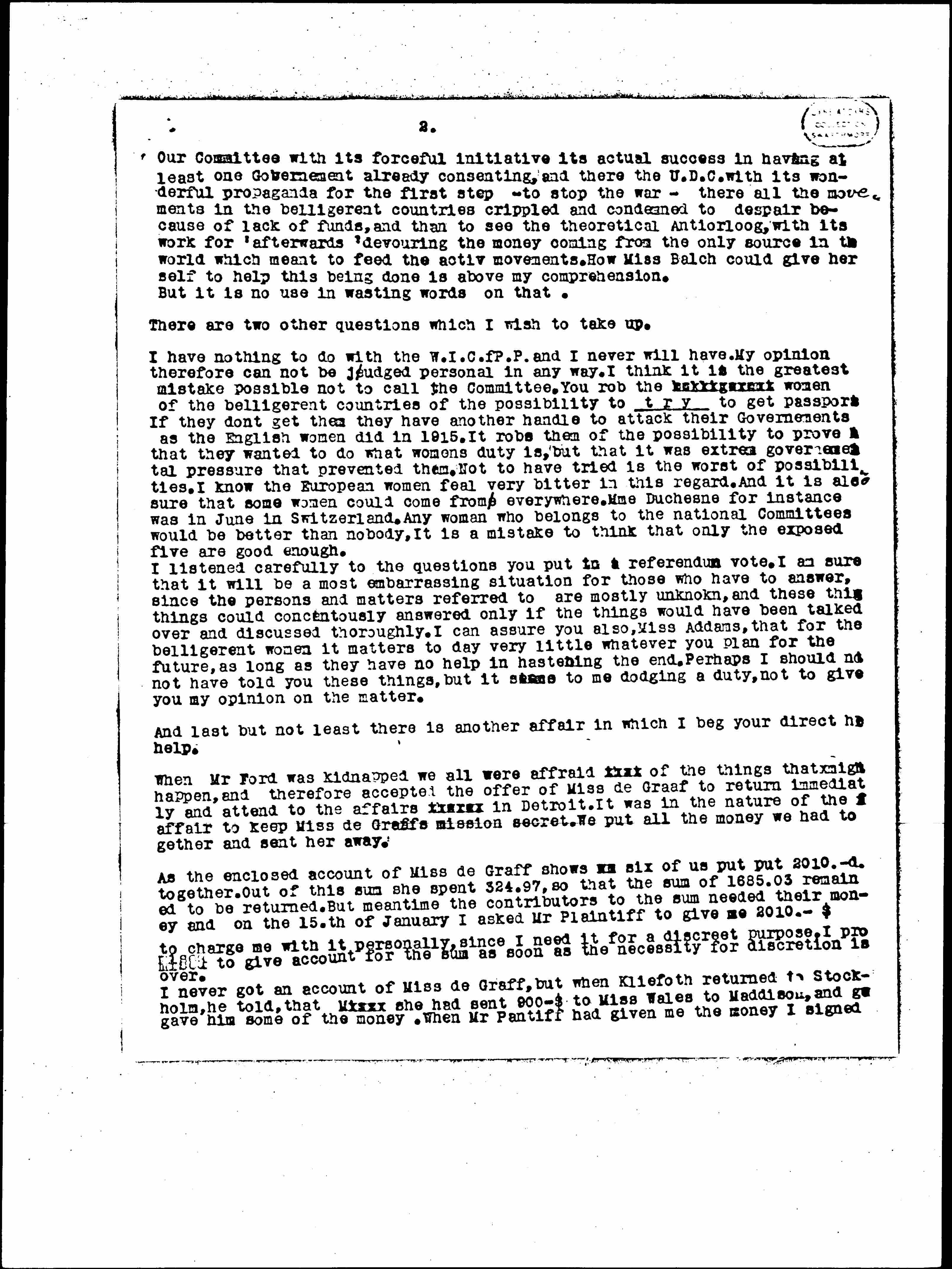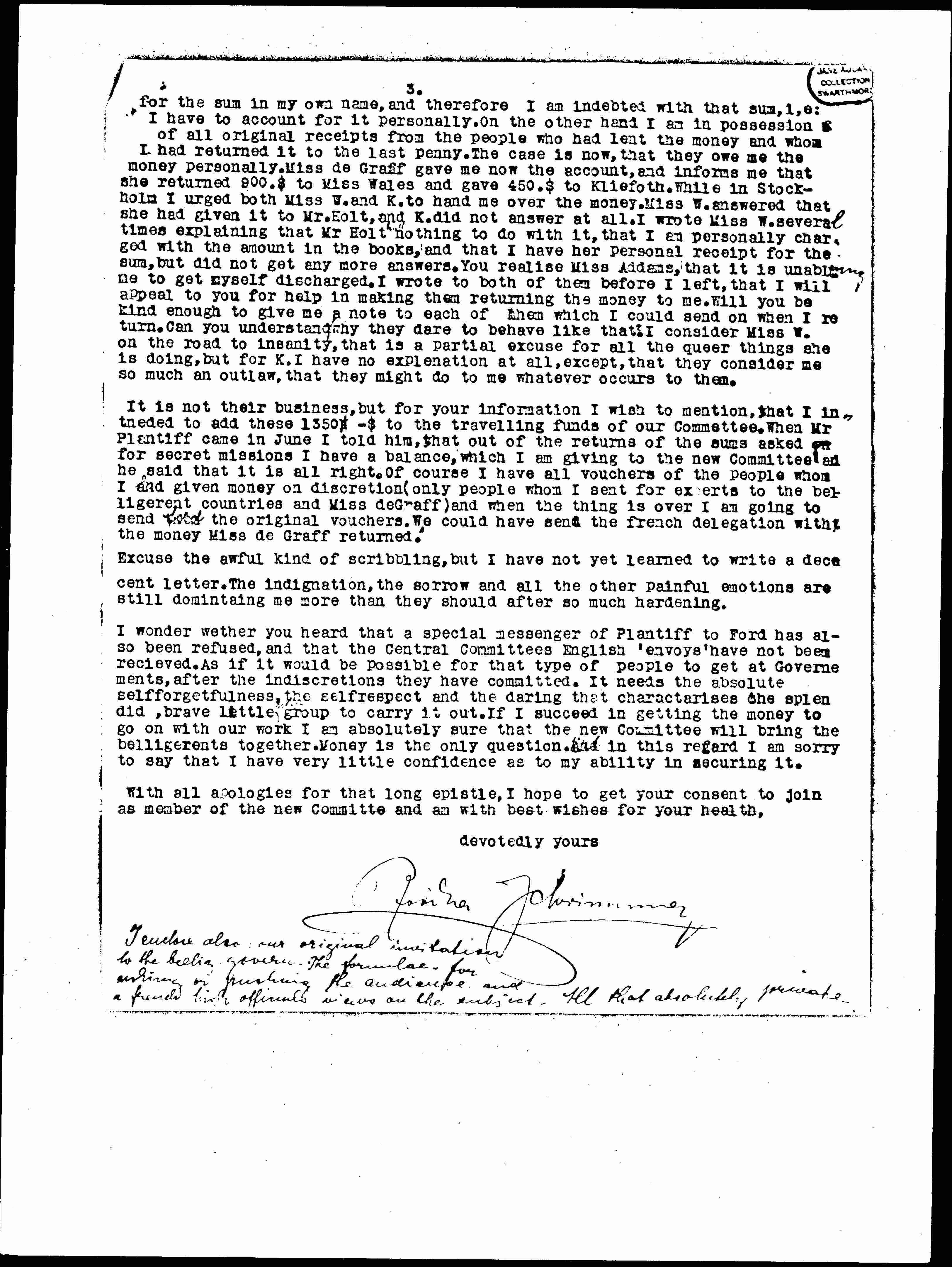 I never got an account of Miss [DeGraff], but when [Kliefoth] returned to Stockholm, he told, that Miss she had sent 900-$ to Miss Wales to [Madison], and gave him some of the money. When Mr [Plantiff] had given me the money I signed [page 3] for the sum in my own name, and therefore I am indebted with that sum, i.e.: I have to account for it personally. On the other hand I am in possession of all original receipts from the people who had lent the money and whom I had returned it to the last penny. The case is now, that they owe me the money personally. Miss [DeGraff] gave me now the account, and informs me that she returned 900.$ to Miss Wales and gave 450.$ to Kliefoth. While in Stockholm I urged both Miss W. and K. to hand me over the money. Miss W. answered that she had given it to Mr. Holt, and K. did not answer at all. I wrote Miss W. several times explaining that Mr Holt <had> nothing to do with it, that I am personally charged with the amount in the books, and that I have her personal receipt for the sum, but did not get any more answers. You [realize] Miss Addams, that it is <[unablaming?]> me to get myself discharged. I wrote to both of them before I left, that I will appeal to you for help in making them returning the money to me. Will you be kind enough to give me a note to each of them which I could send on when I return. Can you understand why they dare to behave like that? I consider Miss W. on the road to insanity, that is a partial excuse for all the queer things she is doing, but for K. I have no [explanation] at all, except, that they consider me so much an outlaw, that they might do to me whatever occurs to them.