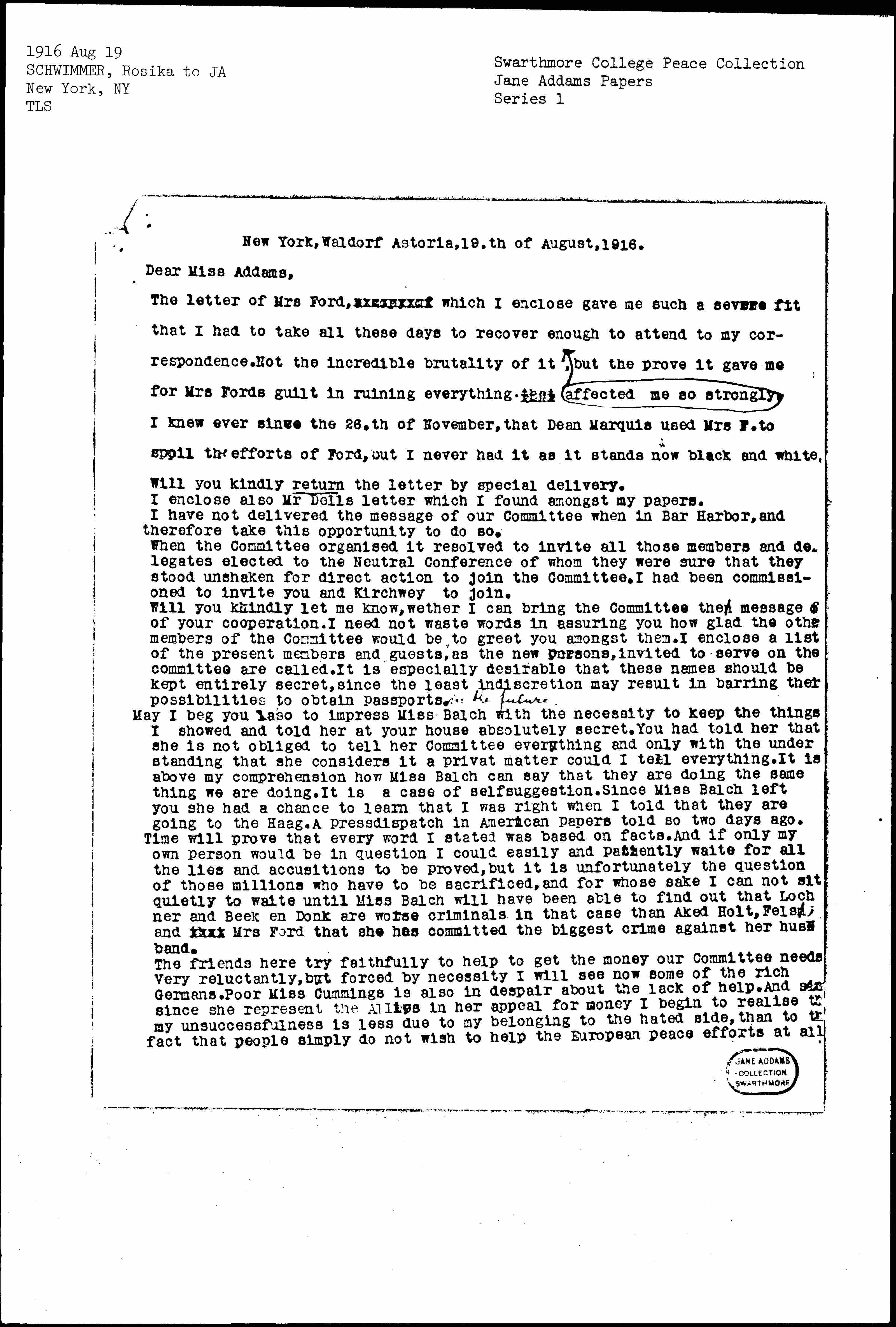 May I beg you also to impress Miss Balch with the necessity to keep the things I showed and told her at your house absolutely secret. You had told her that she is not obliged to tell her Committee everything and only with the understanding that she considers it a [private] matter could I tell everything. It is above my comprehension how Miss Balch can say that they are doing the same thing we are doing. It is a case of self suggestion. Since Miss Balch left you she had a chance to learn that I was right when I told that they are going to the [Hague]. A press dispatch in American papers told so two days ago. Time will prove that every word I stated was based on facts. And if only my own person would be in question I could easily and patiently [wait] for all the lies and accusations to be proved, but it is unfortunately the question of those millions who have to be sacrificed, and for whose sake I cannot sit quietly to [wait] until Miss Balch will have been able to find out that Lochner and Beek en Donk are worse criminals in that case than Aked Holt, Fels; and that Mrs Ford that she has committed the biggest crime against her husband.