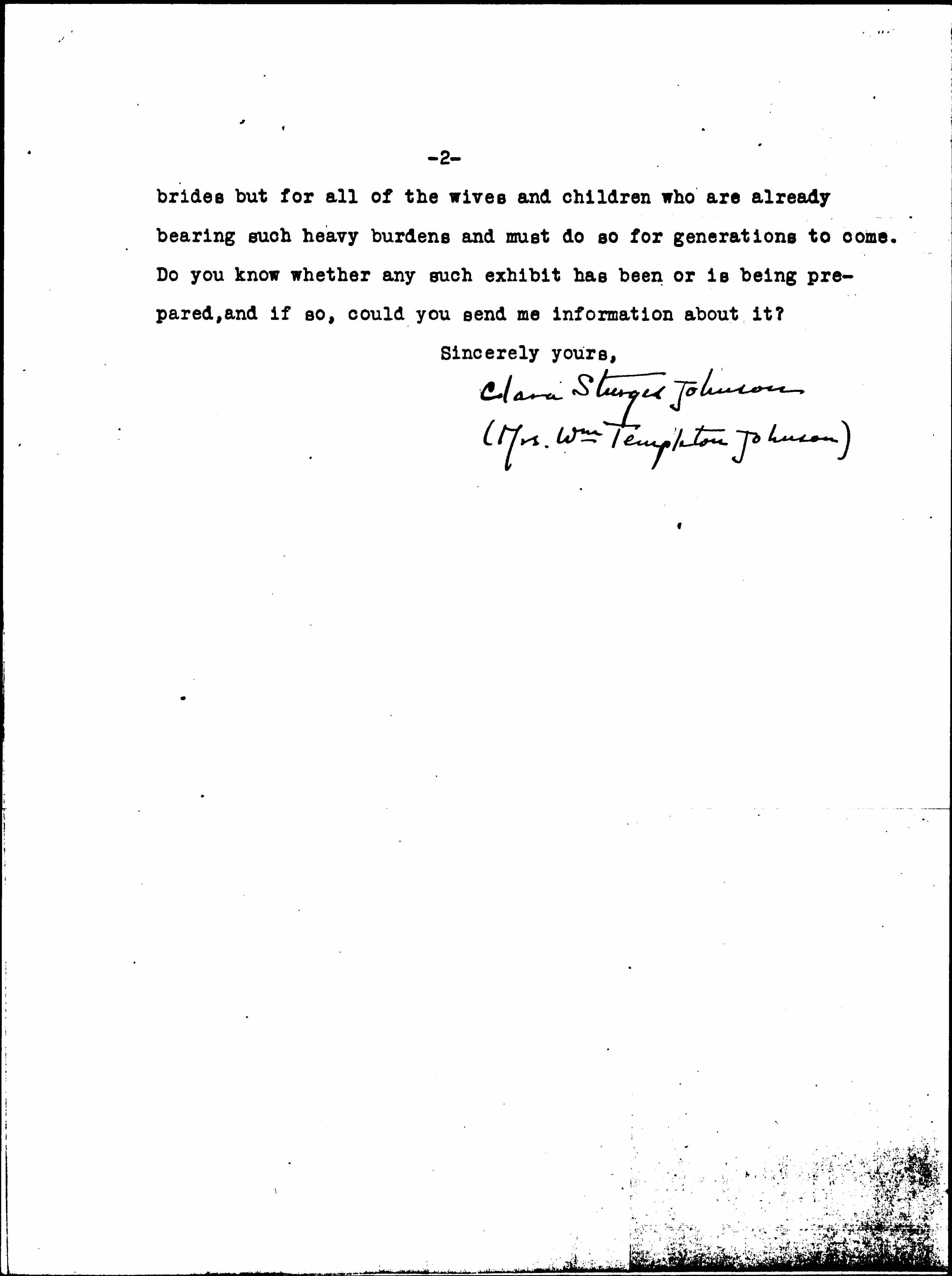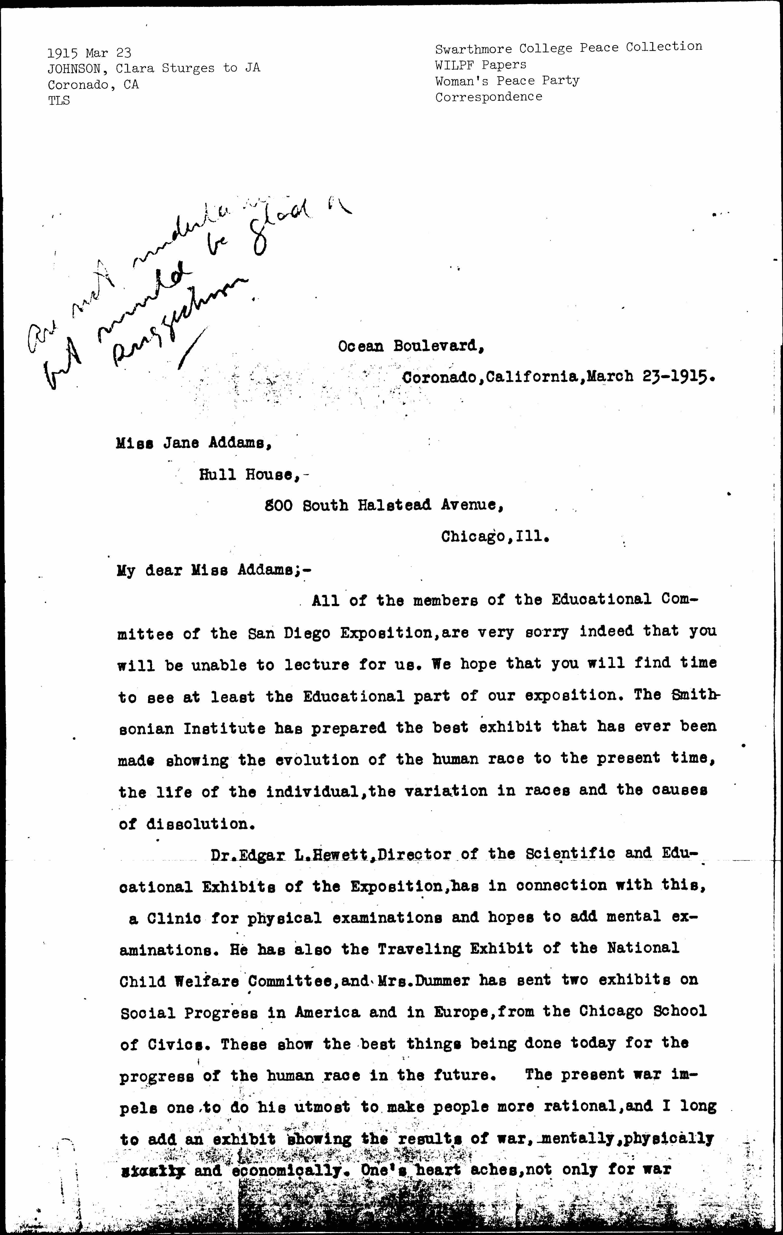 Dr. Edgar L. Hewett, Director of the Scientific and Educational Exhibits of the Exposition, has in connection with this, a Clinic for physical examinations and hopes to add mental examinations. He has also the Traveling Exhibit of the National Child Welfare Committee, and Mrs. Dummer has sent two exhibits on Social Progress in America and in Europe, from the Chicago School of Civics. These show the best things being done today for the progress of the human race in the future. The present war impels one to do his utmost to make people more rational, and I long to add an exhibit showing the results of war, mentally, physically [illegible] and economically. One's heart aches, not only for war [page 2] brides but for all of the wives and children who are already bearing such heavy burdens and must do so for generations to come. Do you know whether any such exhibit has been or is being prepared, and if so, could you send me information about it?