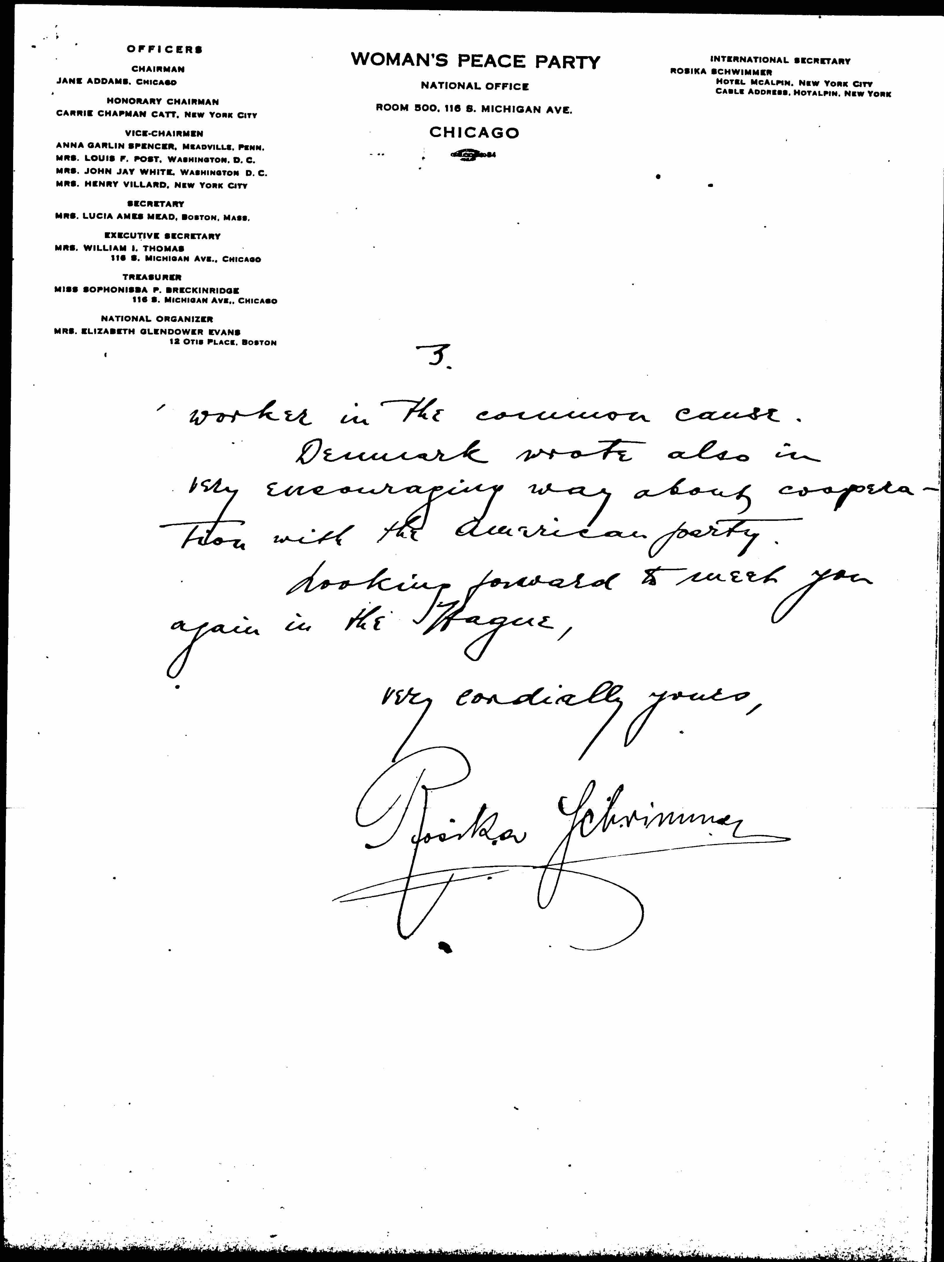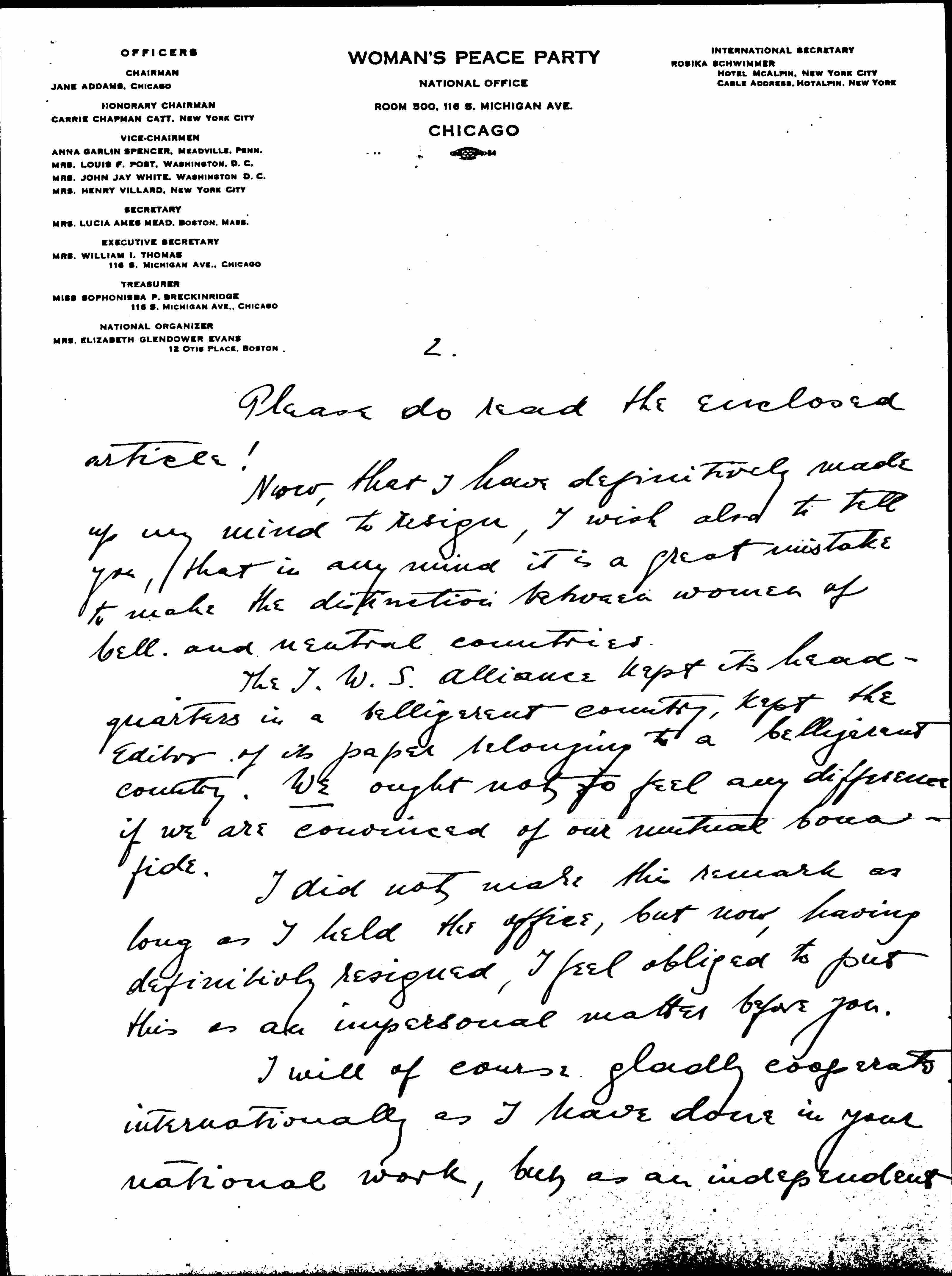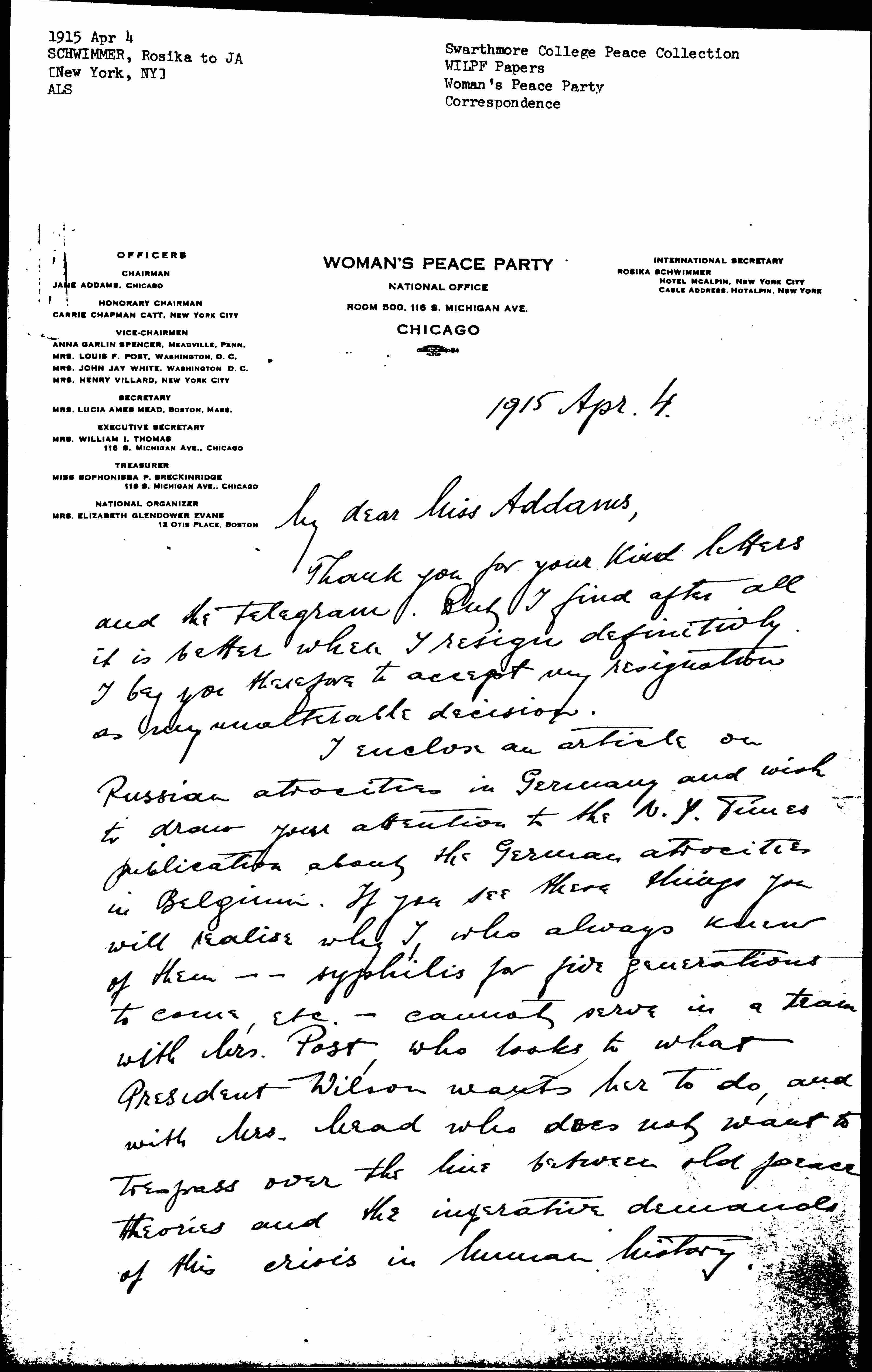 I enclose an article on Russian atrocities in Germany and wish to draw your attention to the N.Y. Times publication about the German atrocities in Belgium. If you see these things you will [realize] why I, who always knew of them -- syphilis for five generations to come, etc. -- cannot serve in a team with Mrs. Post, who looks to what President Wilson wants her to do, and with Mrs. Mead who does not want to trespass over the line between old peace theories and the imperative demands of this crisis in human history. [page 2]