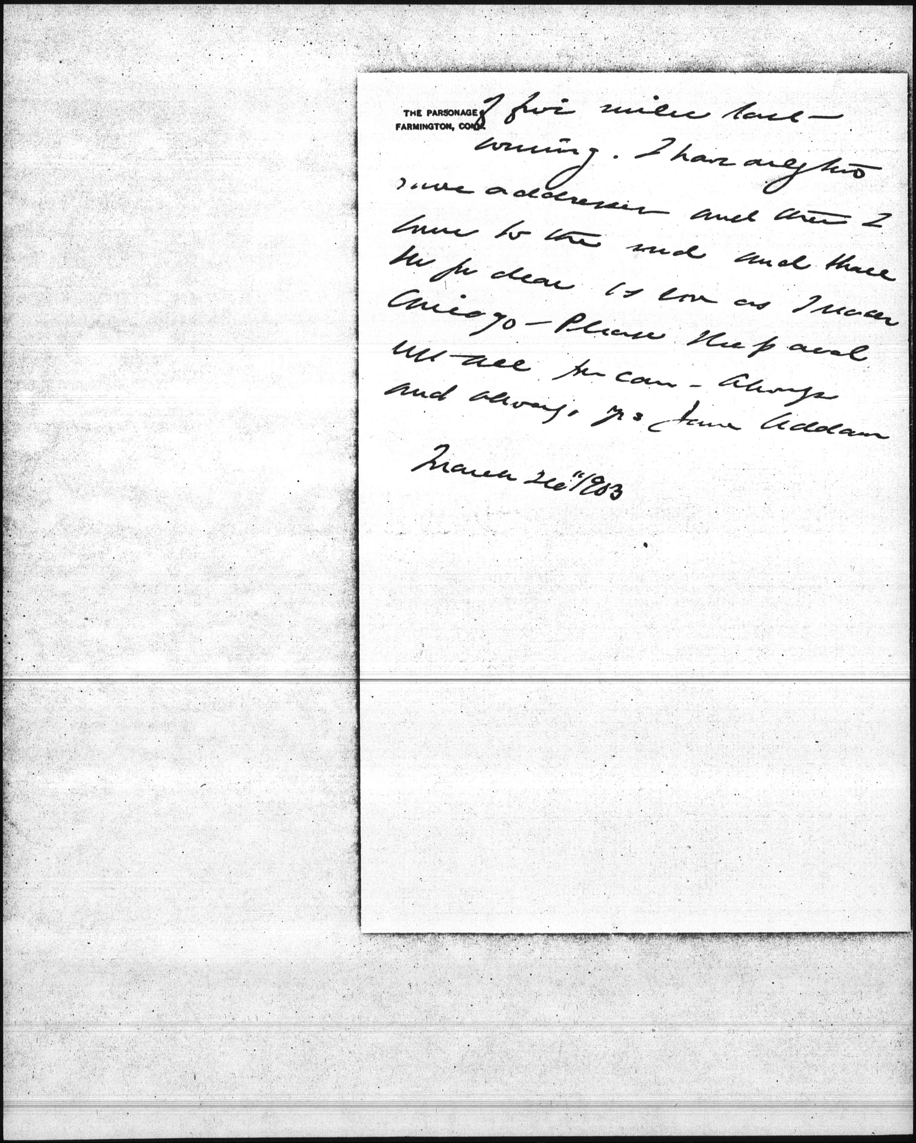 This heavenly spring weather holds out and I am much enjoying this dear old spot. There is certainly a reaction [ahead?] in favor of country life. If I lived in New England it might in time strike me. We had a beautiful drive [page 2] of five miles last evening. I have only two more addresses and then I come to the end and shall see you dear as soon as I reach Chicago. Please sleep and rest all you can. Always and always yrs Jane Addams