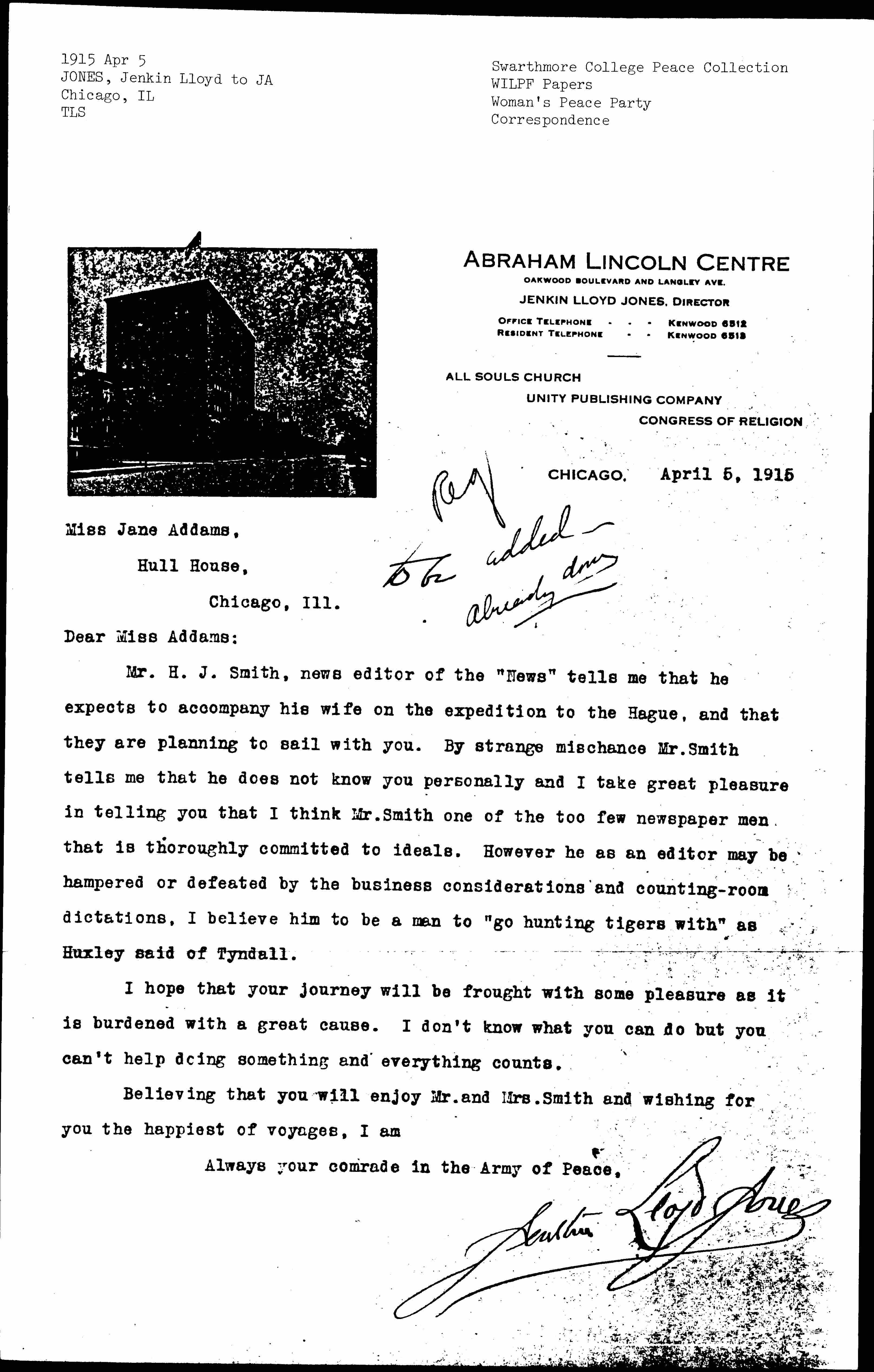 Mr. H. J. Smith, news editor of the "News" tells me that he expects to accompany his wife on the expedition to The Hague, and that they are planning to sail with you. By strange mischance Mr. Smith tells me that he does not know you personally and I take great pleasure in telling you that I think Mr. Smith one of the too few newspaper men that is thoroughly committed to ideals. However he as an editor may be hampered or defeated by the business considerations and counting-room dictations. I believe him to be a man to "go hunting tigers with" as Huxley said of Tyndall.