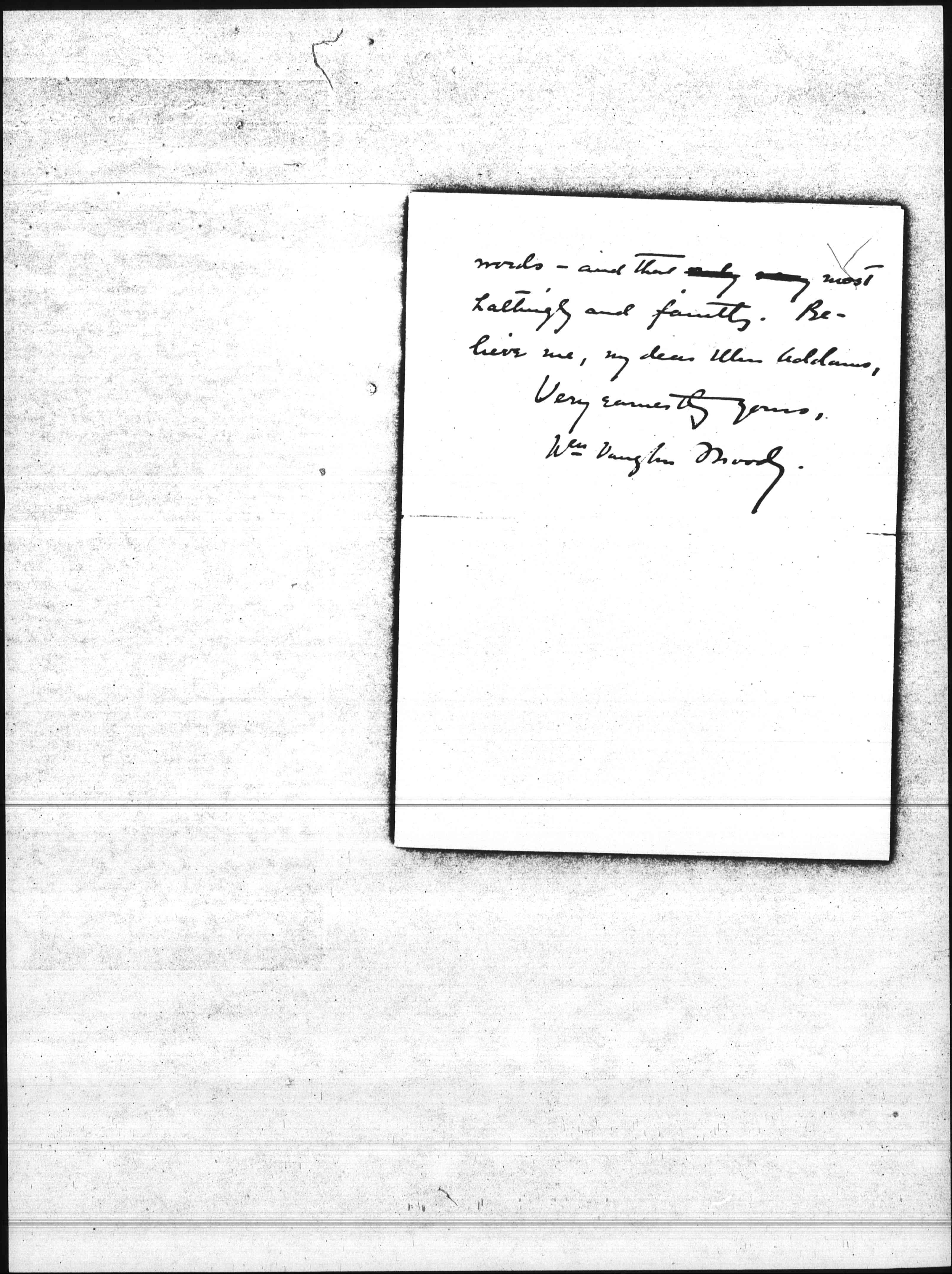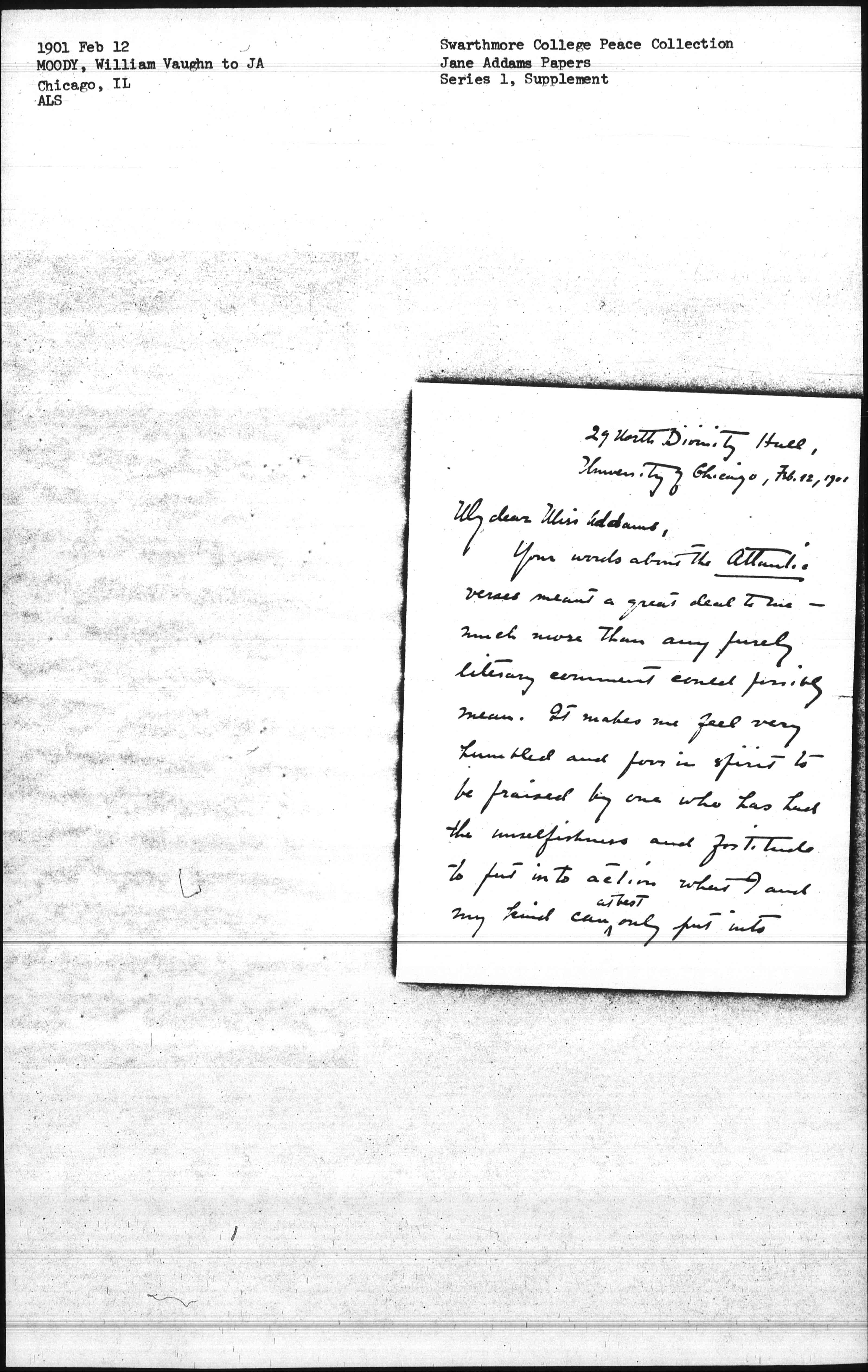 Your words about the Atlantic verses meant a great deal to me -- much more than any purely literary comment could possibly mean. It makes me feel very humbled and poor in spirit to be praised by one who has had the unselfishness and fortitude to put into action what I and my kind can <at best> only put into [page 2] words -- and then only [illegible] most haltingly and faintly. Believe me, my dear Miss Addams,