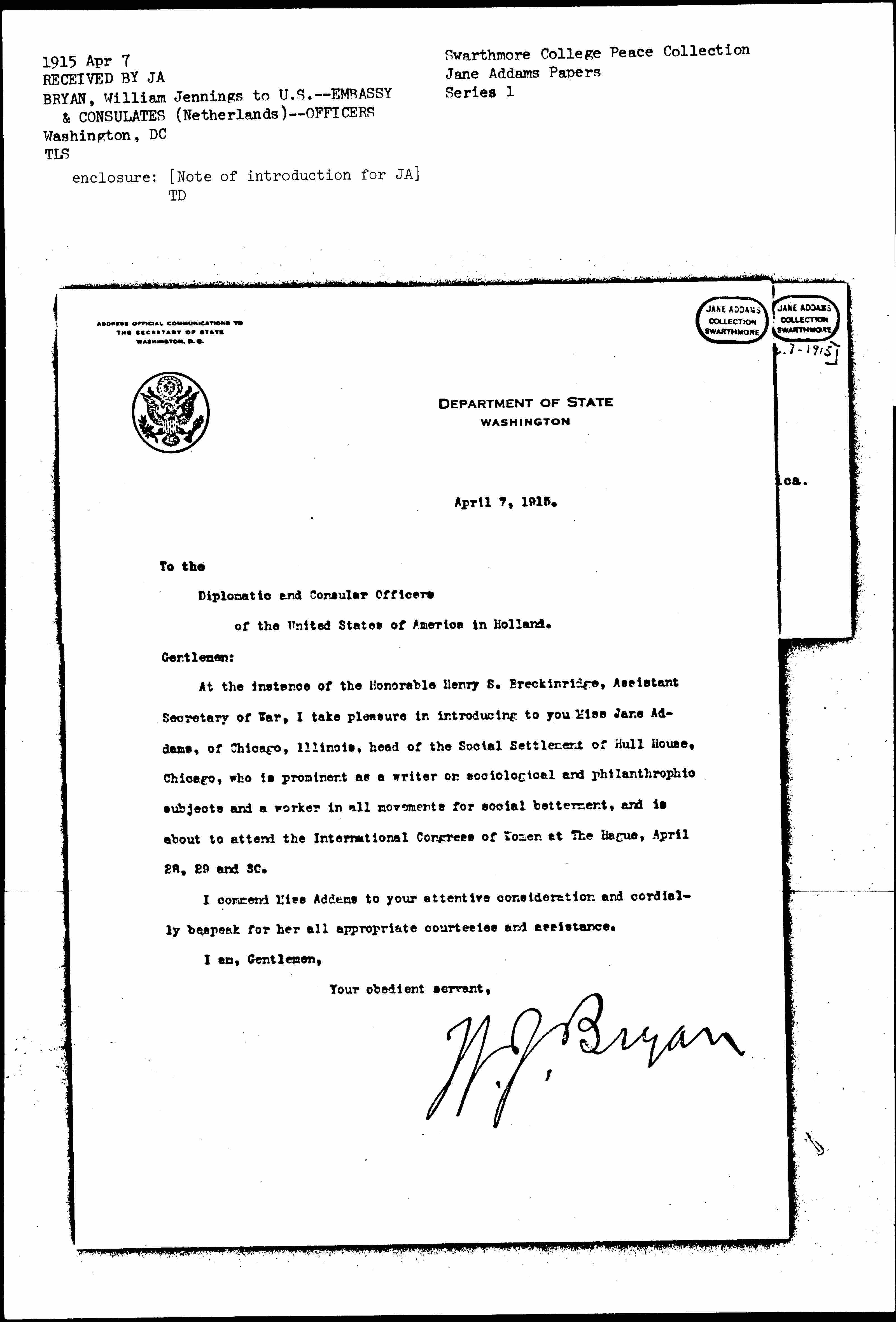 At the instance of the Honorable Henry S. Breckinridge, Assistant Secretary of War, I take pleasure in introducing to you Miss Jane Addams, of Chicago, Illinois, head of the Social Settlement of Hull House, Chicago, who is prominent as a writer on sociological and philanthropic subjects and a worker in all movements for social betterment, and is about to attend the International Congress of Women at The Hague, April 28, 29 and 30.