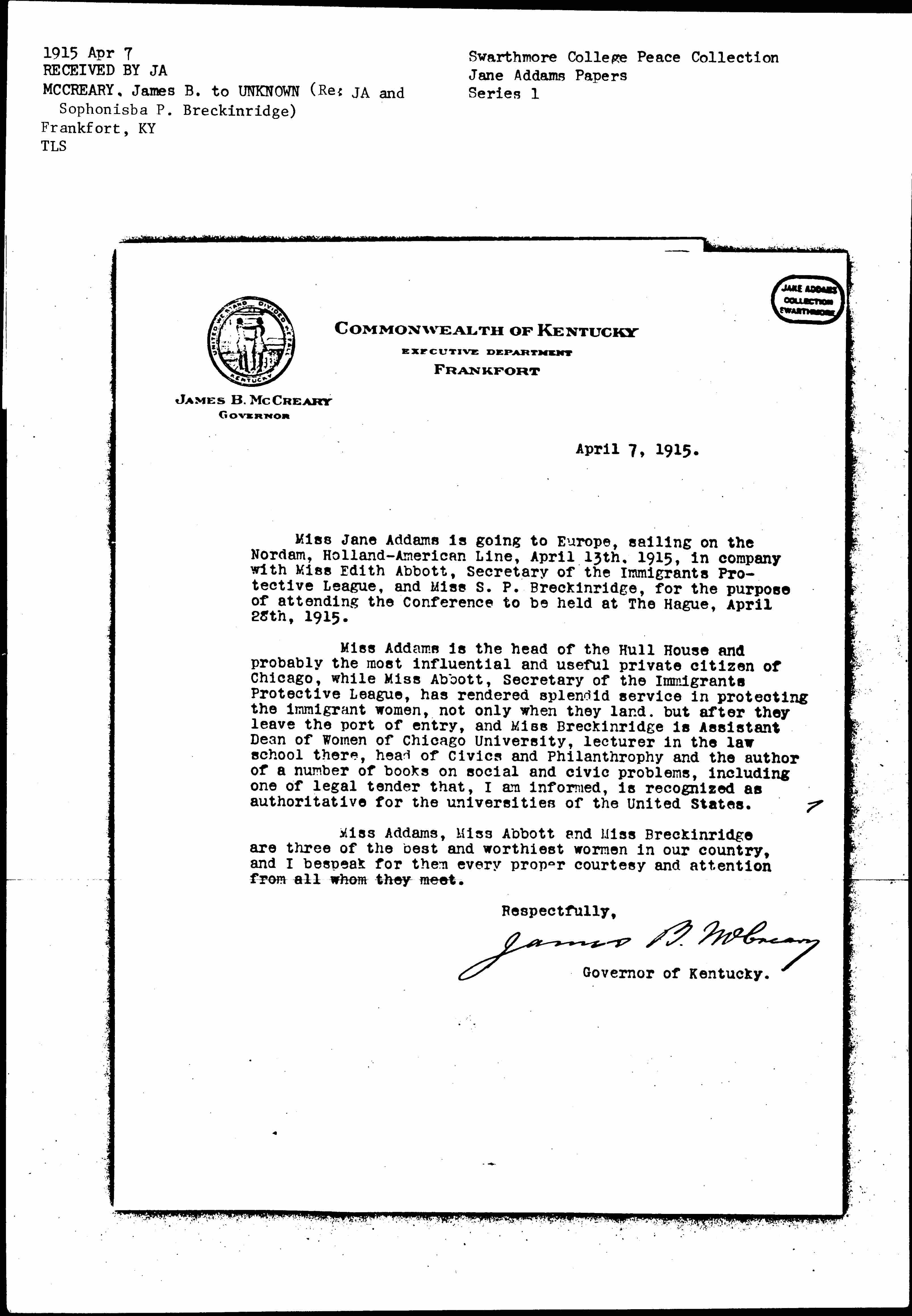 Miss Addams, Miss Abbott and Miss Breckinridge are three of the best and worthiest women in our country, and I bespeak for them every proper courtesy and attention from all whom they meet.