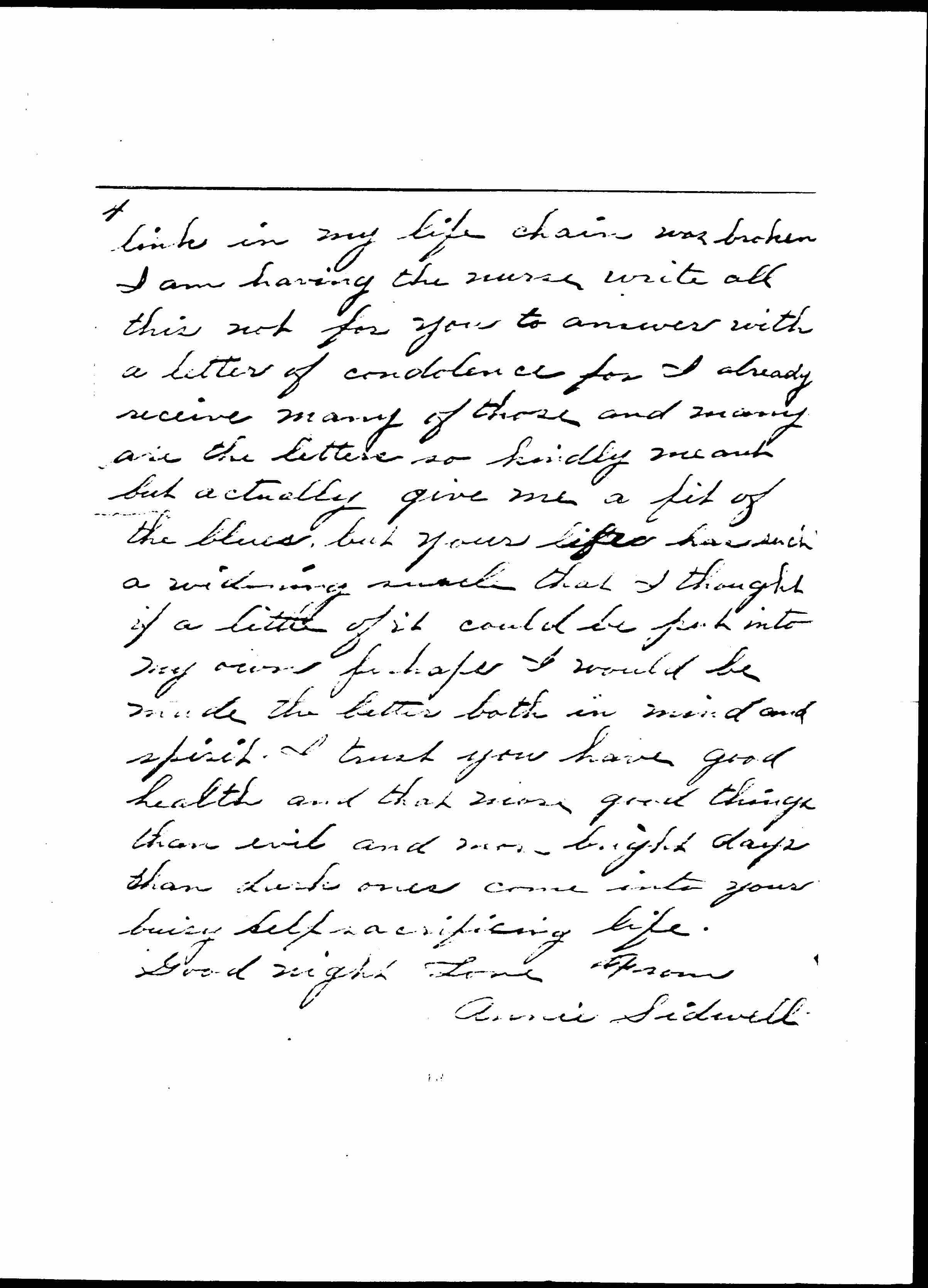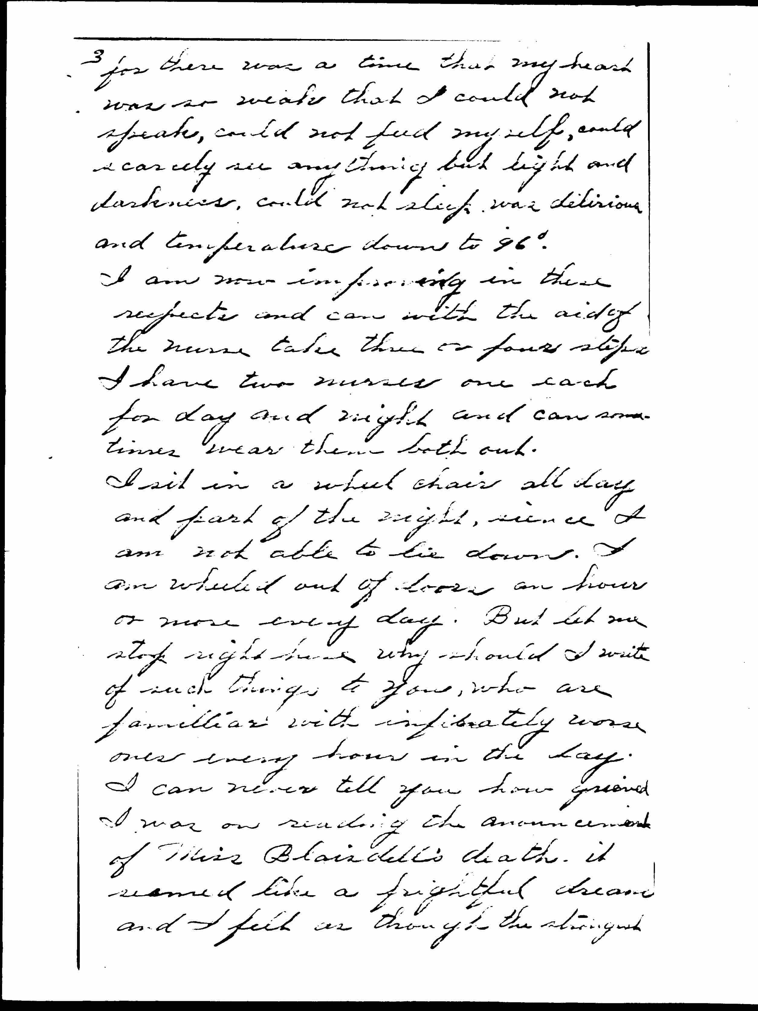 I sit in a wheel chair all day and part of the night, since I am not able to lie down. I am wheeled out of doors an hour or more every day. But let me stop right here why should I write of such things to you, who are familiar with infinitely worse ones every hour in the day. I can never tell you how grieved I was on reaching the announcement of Miss Blaisdell's death, it seemed like a frightful dream and I felt as though the strongest [page 4] link in my life chain was broken. I am having the nurse write all this not for you to answer with a letter of condolence for I already receive many of those and many are the letters so kindly meant but actually give me a bit of the blues, but your life has such a [widening?] such that I thought if a little of it could be put into my own perhaps I would be much the better both in mind and spirit. I trust you have good health and that more good things than evil and more bright days than dark ones come into your busy self sacrificing life.