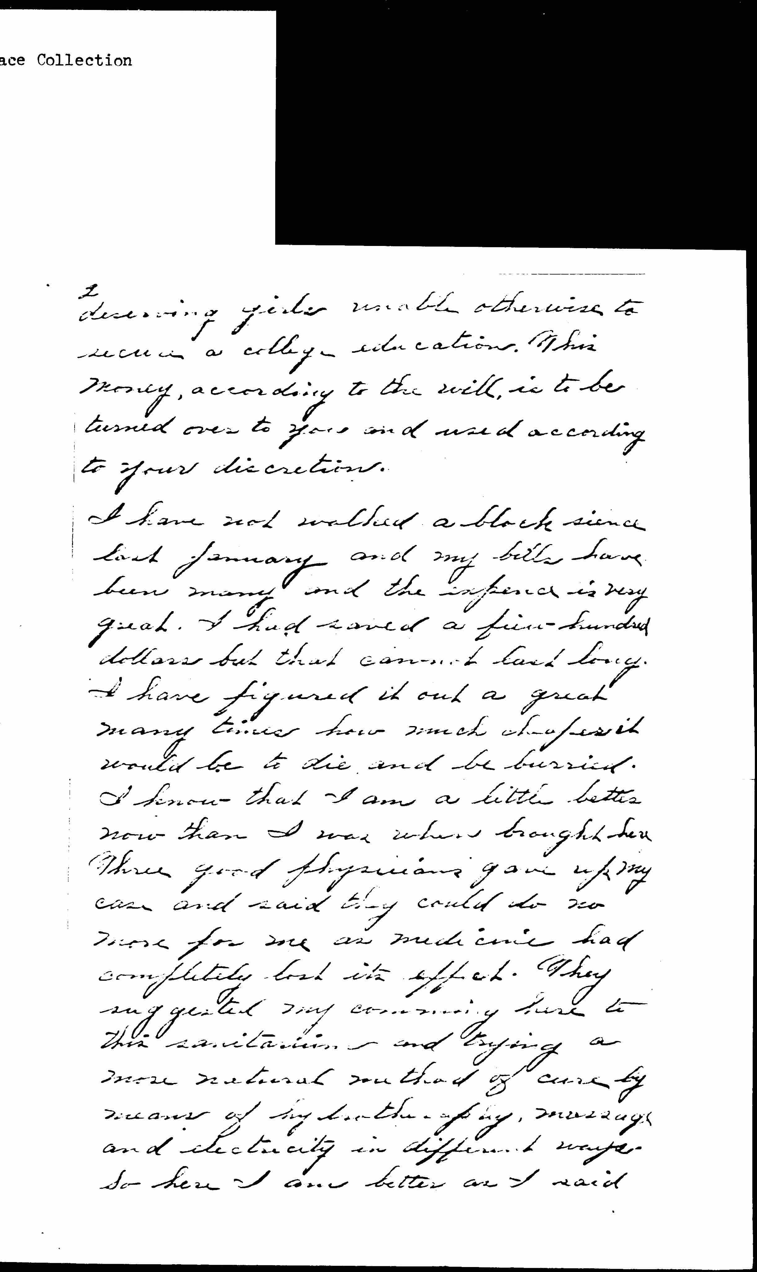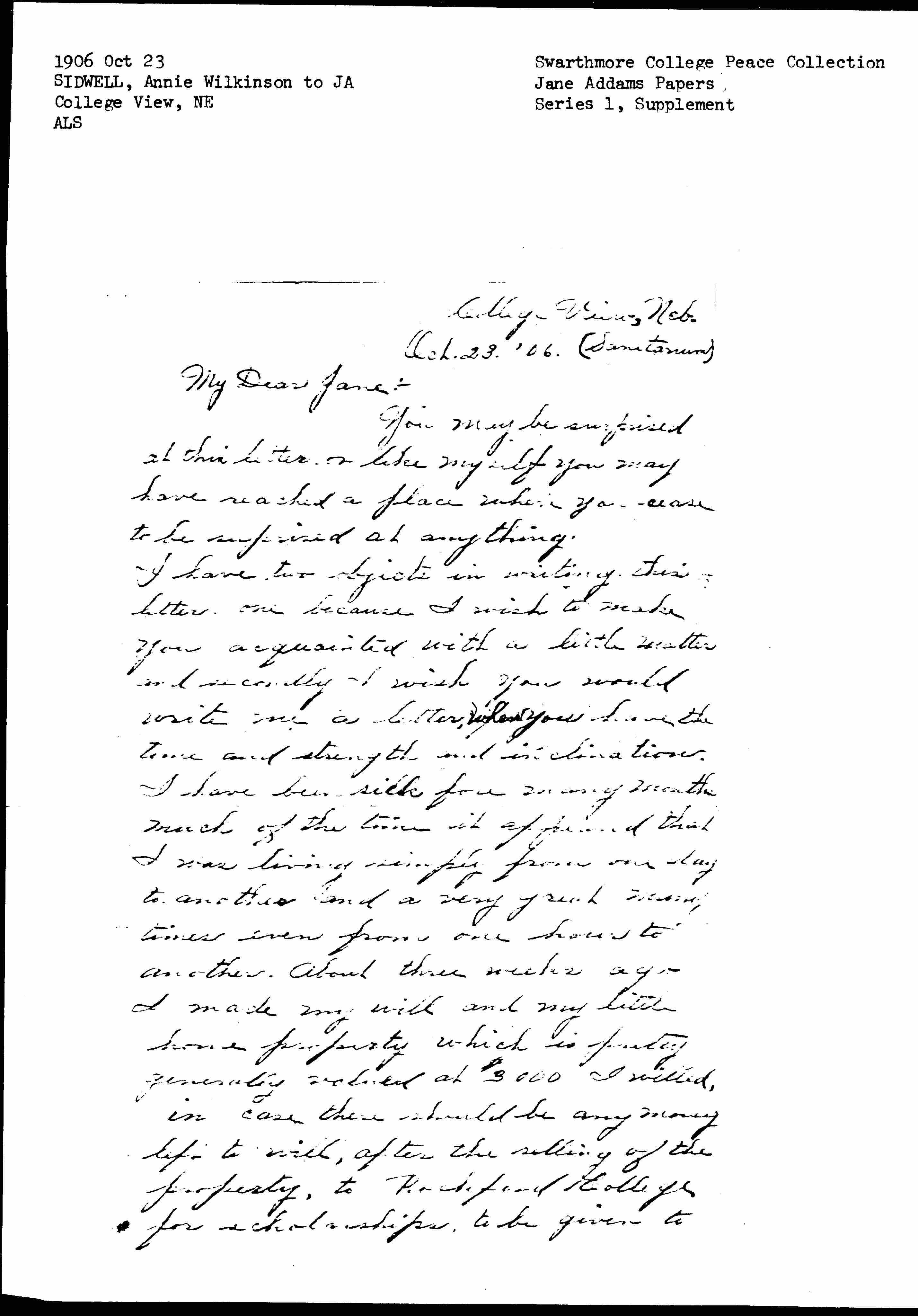 I have two objects in writing this letter, one because I wish to make you acquainted with a little matter and secondly I wish you would write me a letter, when you have the time and strength and inclination. I have been sick for many months much of the time it appeared that I was living simply from one day to another and a very great many times even from one hour to another. About three weeks ago I made my will and my little home property which is pretty generally valued at $3000 I willed, in case there should be any money left to will, after the selling of the property, to Rockford College for scholarships to be given to [page 2] deserving girls unable to otherwise secure a college education. This money, according to the will, is to be turned over to you and used according to your discretion.