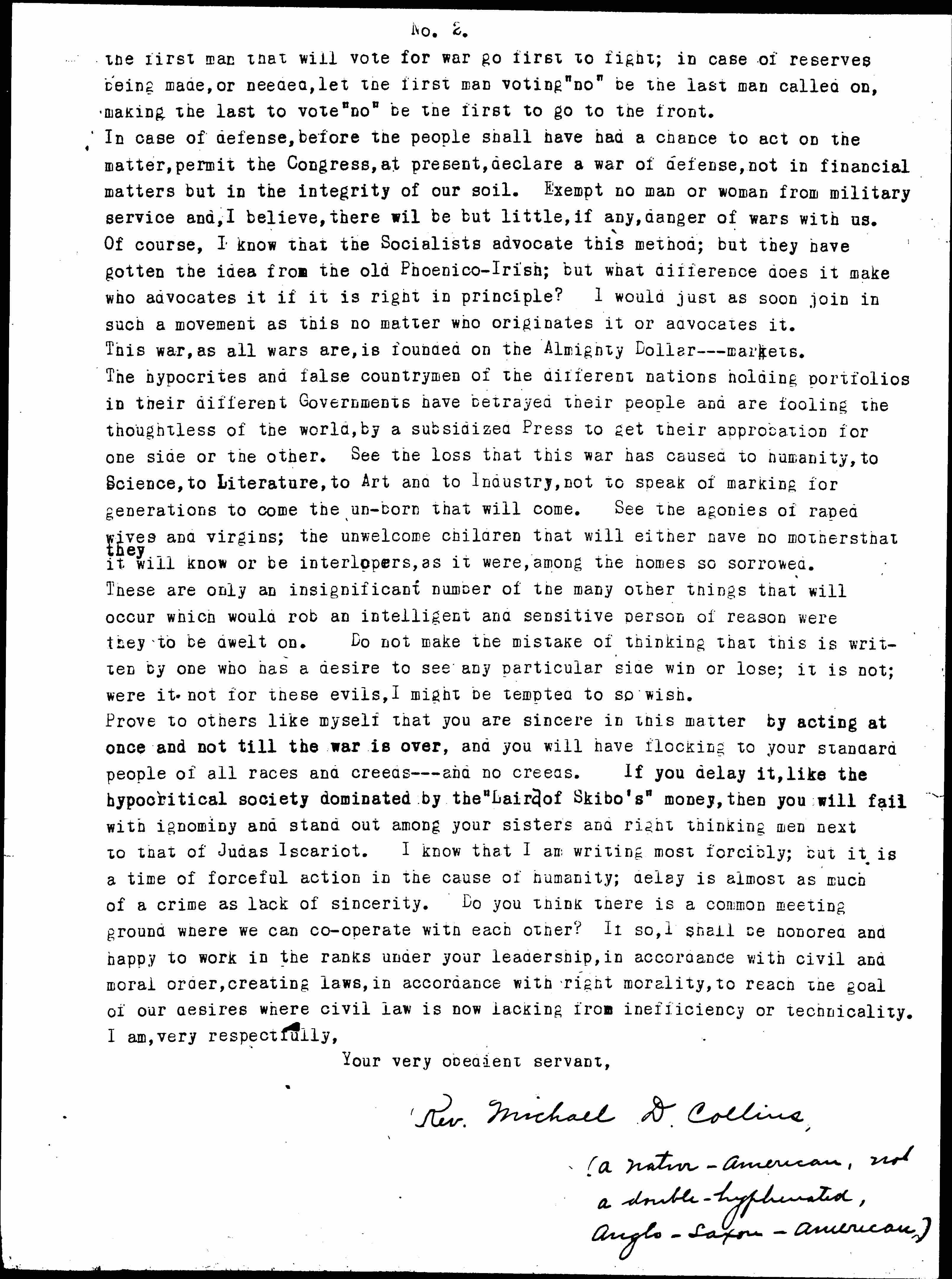 The next great step, then, it seems to me, is to give women suffrage; have them then agitate and demand that they, with the male voters, shall vote on whether or not we have war, on the plan and methods of the Phoenico-Irish; namely: in case of serious dispute with foreign or domestic powers, that, after six months deliberation, the question of whether or not there shall be war declared shall be submitted to a vote of the people. Have all agitators for or against officially registered; include among those agitators the writers and publishers of all periodicals; the voters shall be named and numbered and the negative or affirmative of their vote recorded; if the affirmative carries, put the agitators for war in the front ranks, give them no commission, no matter how bravely they may act on the field, and make them fight till the end of the war unless otherwise incapacitated; [make] [page 2] the first man that will vote for war go first to fight; in case of reserves being made, or needed, let the first man voting "no" be the last man called on, making the last to vote "no" be the first to go to the front.