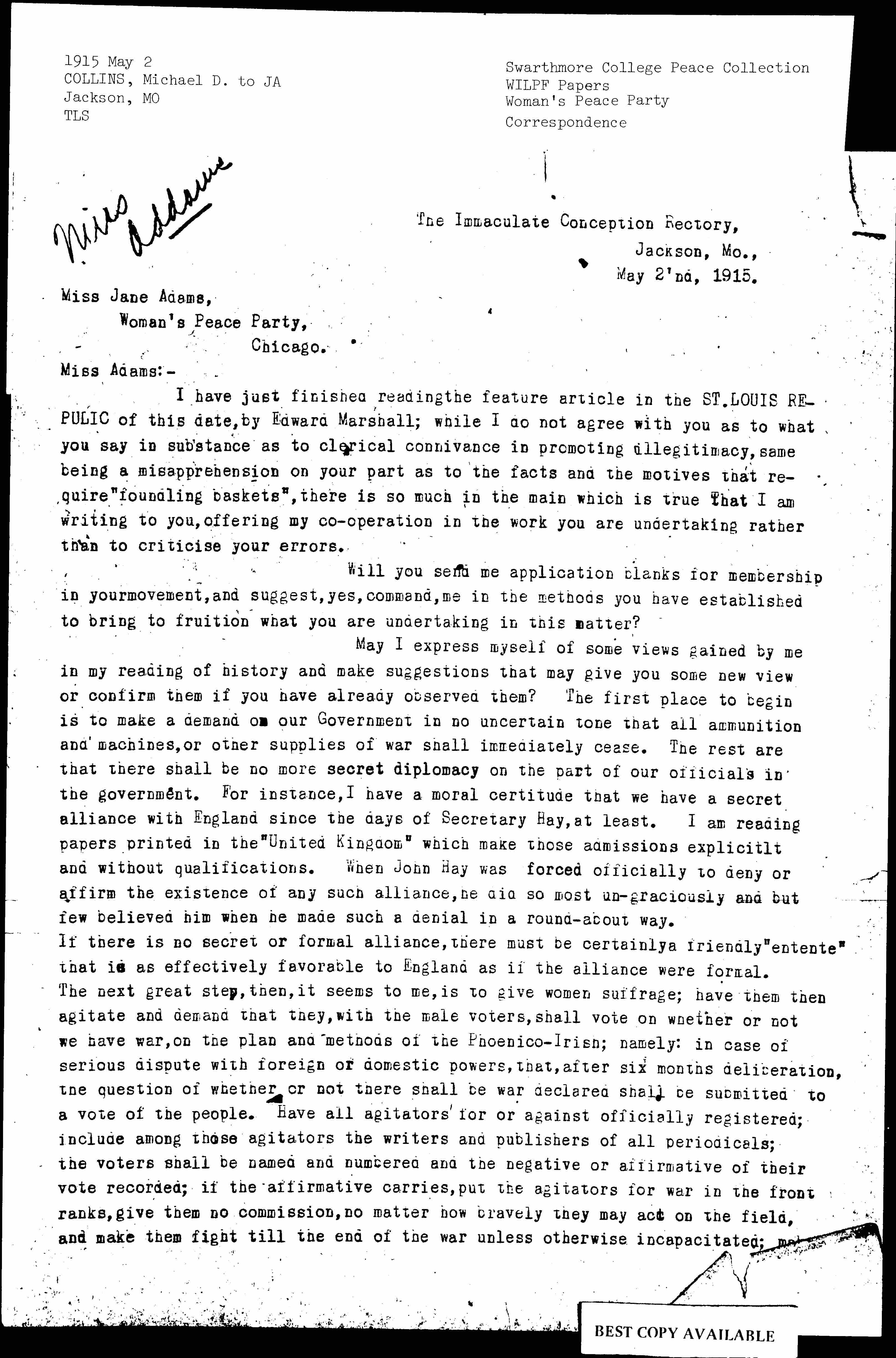 May I express myself of some views gained by me in my reading of history and make suggestions that may give you some new view or confirm them if you have already observed them? The first place to begin is to make a demand on our Government in no uncertain tone that all ammunition and machines, or other supplies of war shall immediately cease. The rest are that there shall be no more secret diplomacy of the part of our officials in the government. For instance, I have a moral certitude that we have a secret alliance with England since the days of Secretary Hay, at least. I am reading papers printed in the "United Kingdom" which make those admissions [explicit] and without qualifications. When John Hay was forced officially to deny or affirm the existence of any such alliance, he did so most [ungraciously] and but few believed him when he made such a denial in a round-about way.