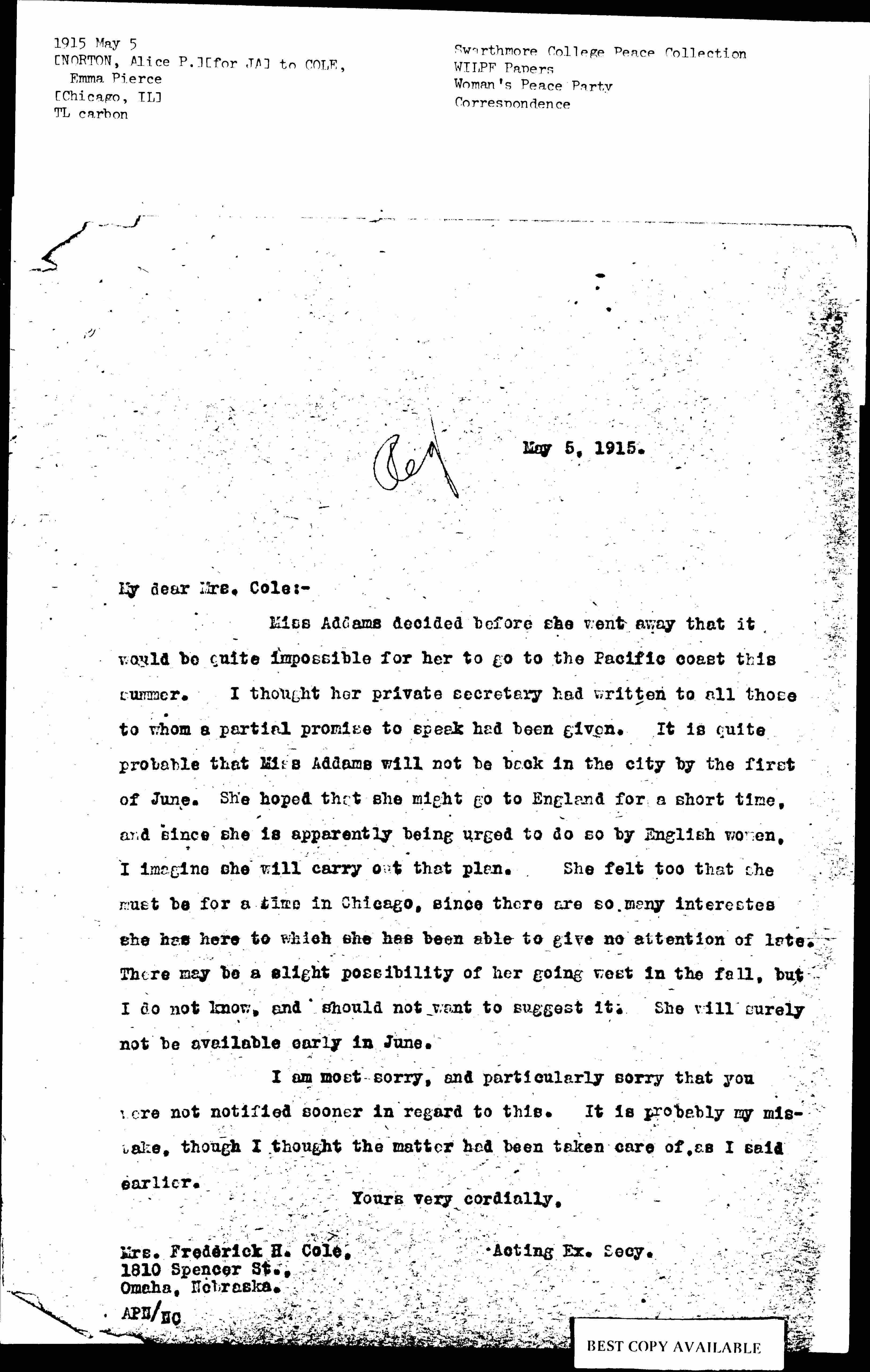 Miss Addams decided before she went away that it would be quite impossible for her to go to the Pacific coast this summer. I thought her private secretary had written to all those to whom a partial promise to speak had been given. It is quite probable that Miss Addams will not be back in the city by the first of June. She hoped that she might go to England for a short time, and since she is apparently being urged to do so by English women, I imagine she will carry out that plan. She felt too that she must be for a time in Chicago, since there are so many [interests] she has here to which she has been able to give no attention of late. There may be a slight possibility of her going west in the fall, but I do not know, and should not want to suggest it. She will surely not be available early in June.