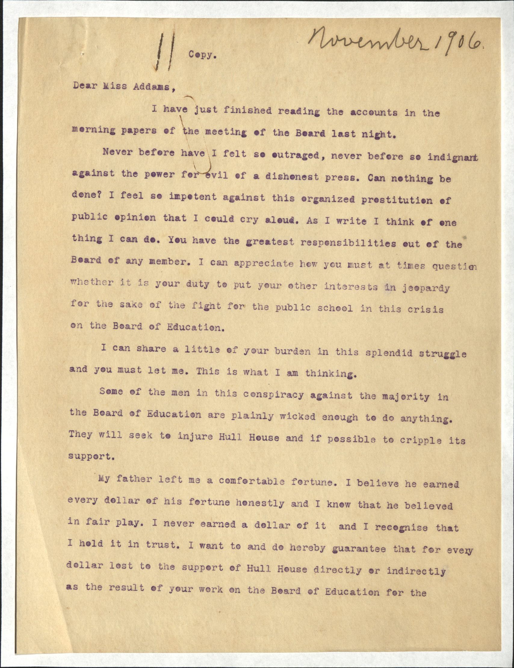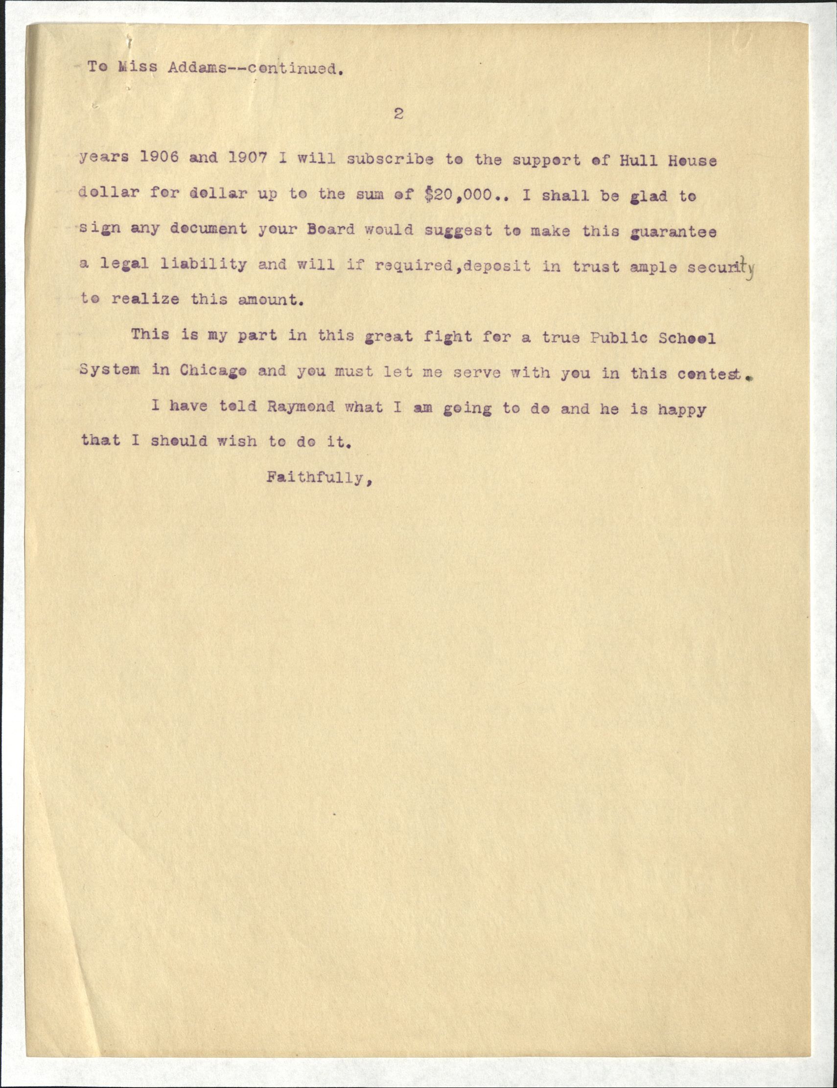 My father left me a comfortable fortune. I believe he earned every dollar of his fortune honestly and I know that he believed in fair play. I never earned a dollar of it and I [recognize] that I hold it in trust. I want to and do hereby guarantee that for every dollar lost to the support of Hull House directly or indirectly as the result of your work on the Board of Education for the [page 2] years 1906 and 1907 I will subscribe to the support of Hull House dollar for dollar up to the sum of $20,000. I shall be glad to sign any document your Board would suggest to make this guarantee a legal liability and will if required, deposit in trust ample security to realize this amount.